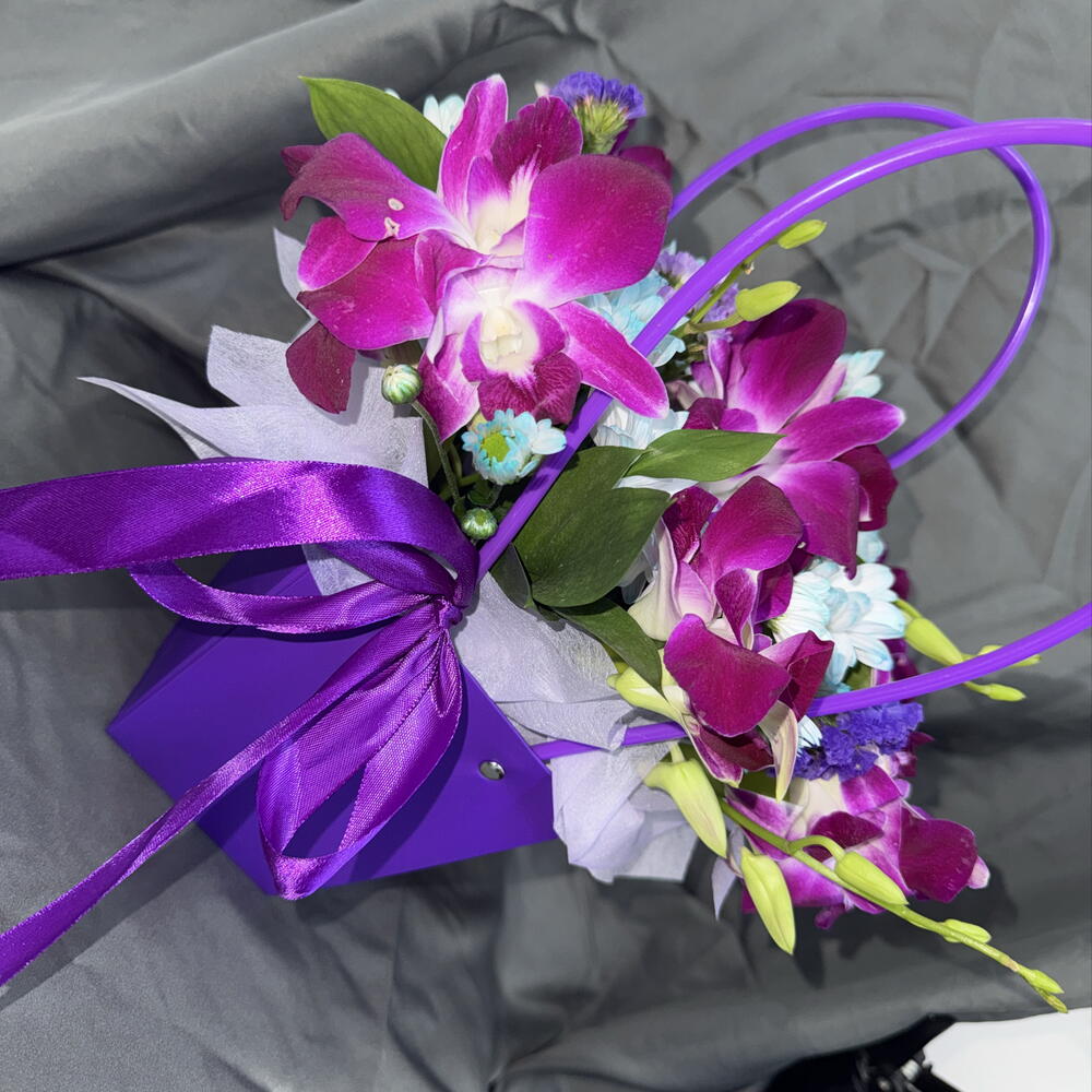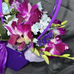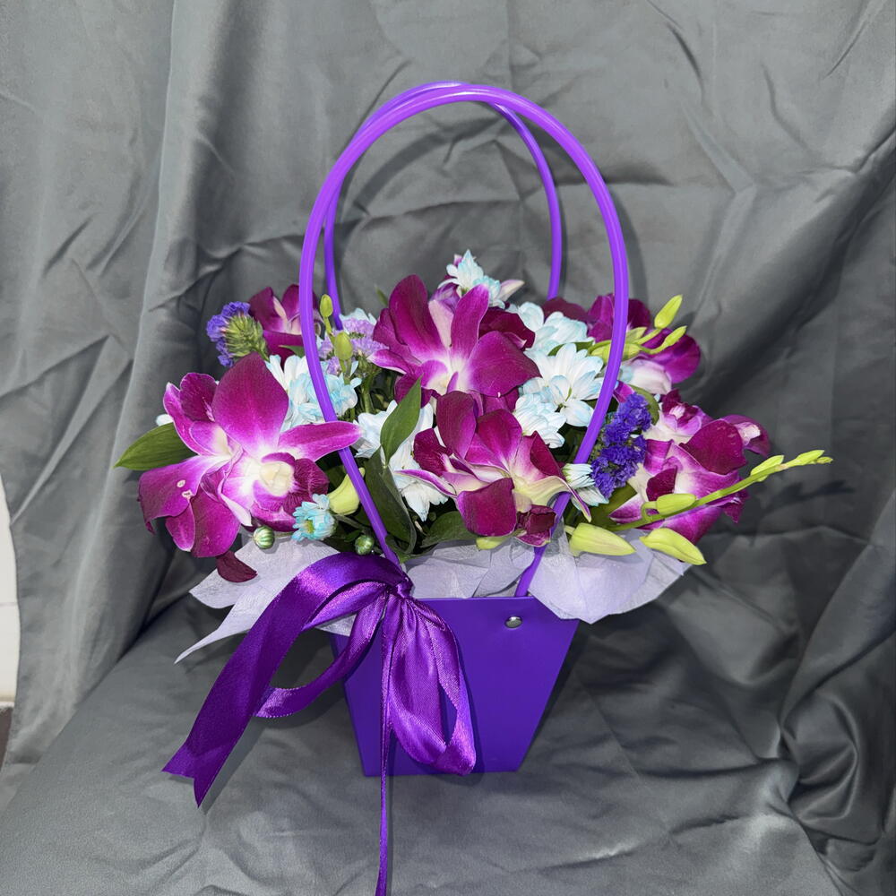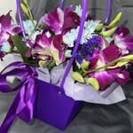 Рускус - 4 шт. Хризантема кустовая - 1 шт. Лента атласная - 1 шт. Оазис - 1 шт. Сумочка - 1 шт. Дендробиум - 7 шт.