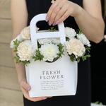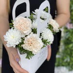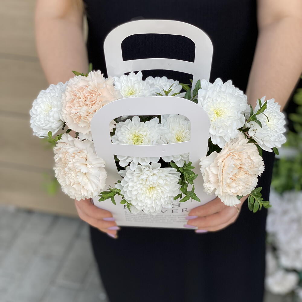 Милый букет-комплимент в сумочке. В составе стойкие хризантемы и диантусы.