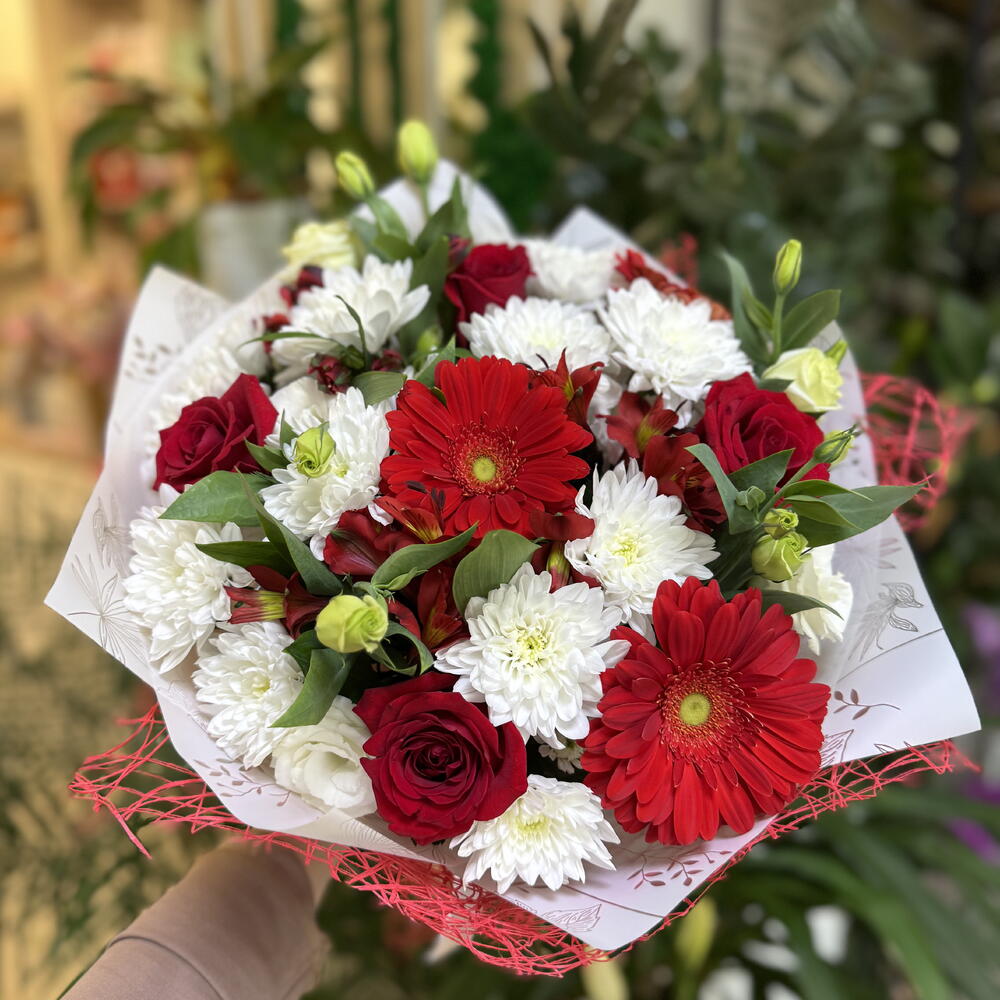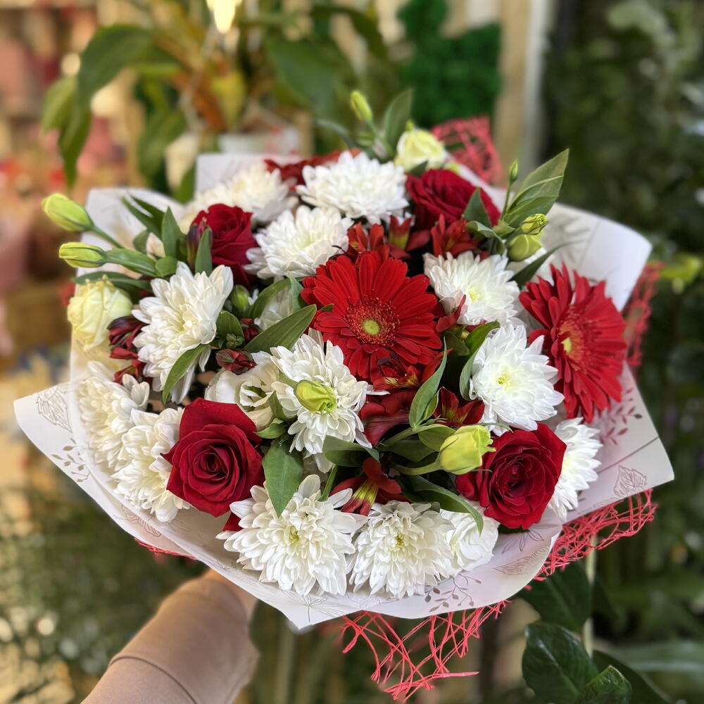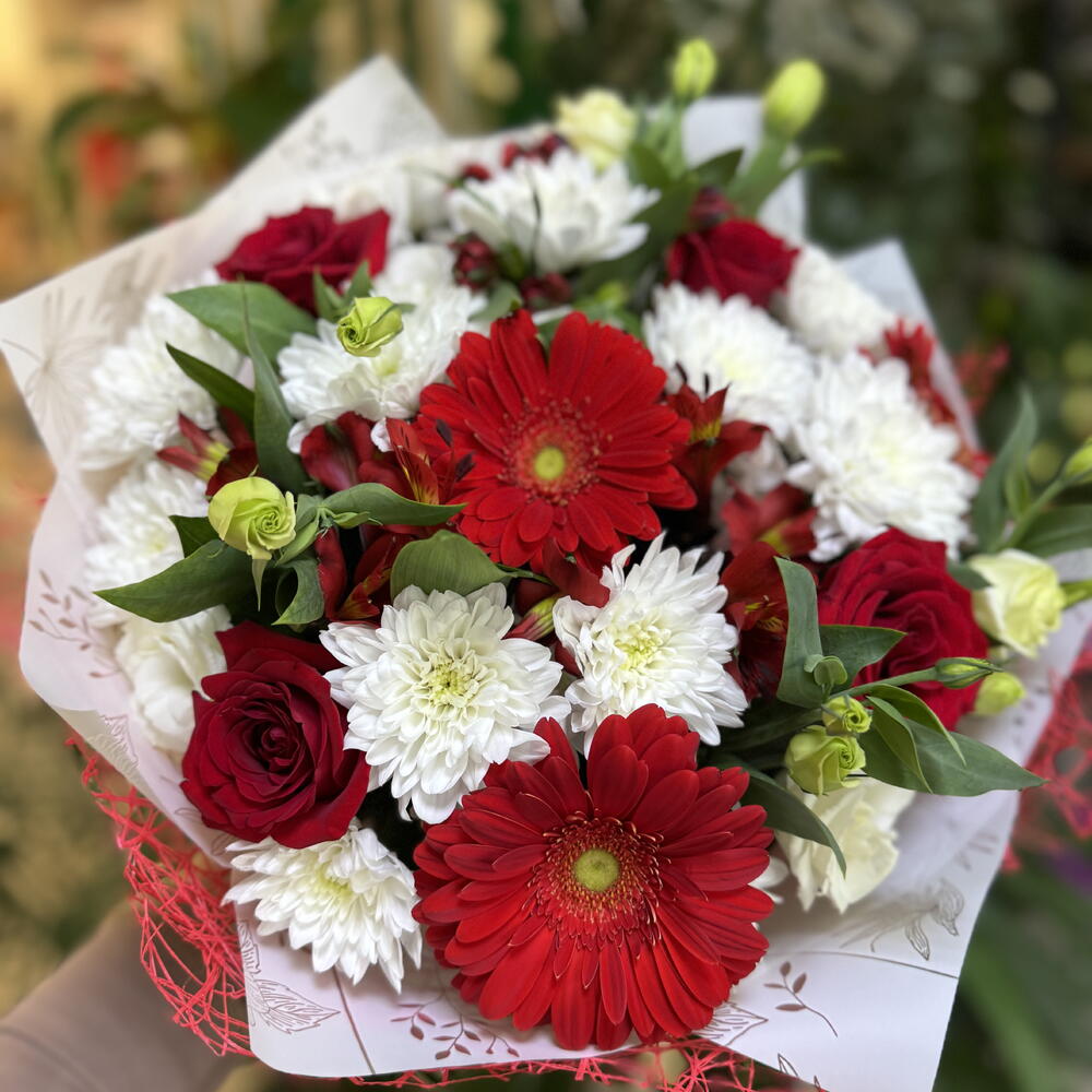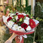 Альстромерия - 3 шт. Роза красная - 4 шт. Хризантема кустовая - 4 шт. Эустома - 3 шт. Гербера Красная - 3 шт. Упаковка дизайнерская - 2 шт.