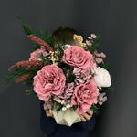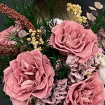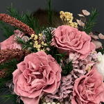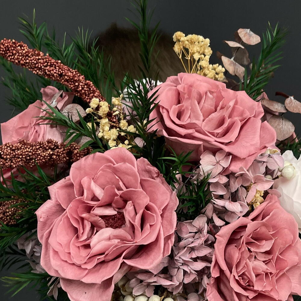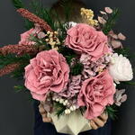 Ваза керамика - 1 шт. Роза стабилизированная - 7 шт. Оазис для сухоцветов - 1 шт. Эвкалипт стабилизированный - 3 шт. гипсофила стабилизированная - 2 шт. гортензия стабилизированная - 1 шт. зелень декоративная стабилизированная - 4 шт. веточки шелка - 5 шт.