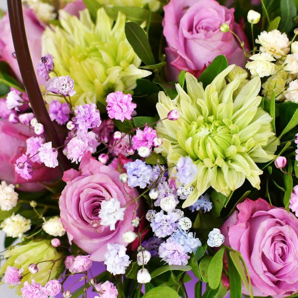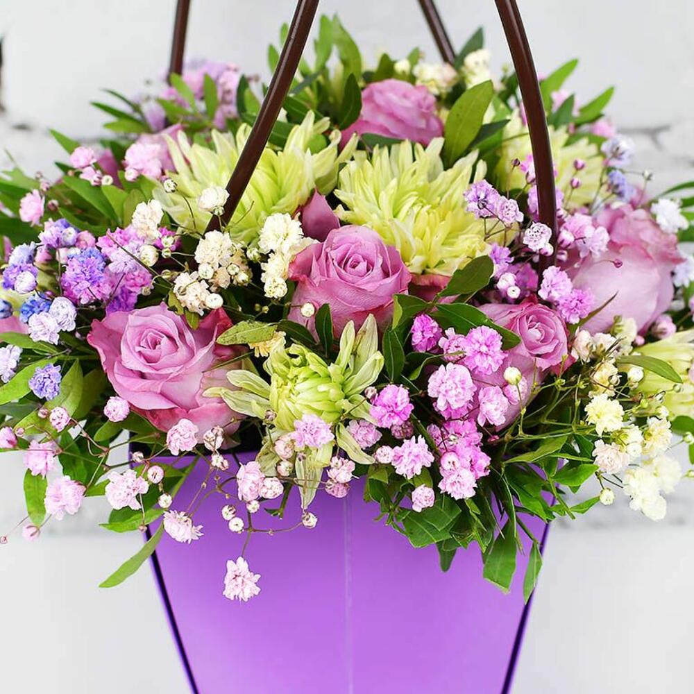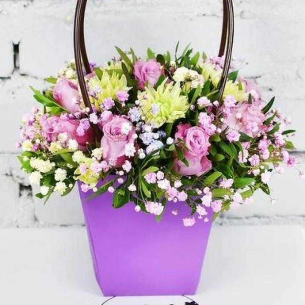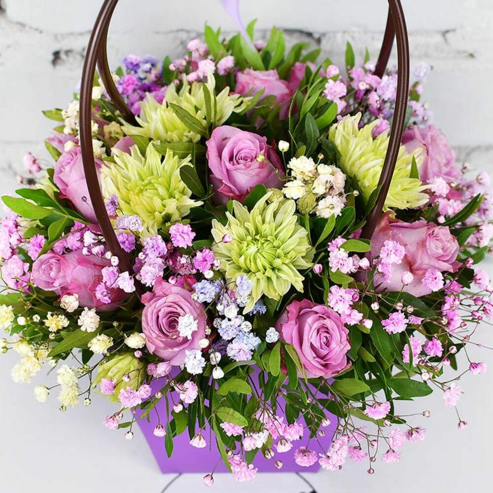 Гипсофила - 2 шт. Хризантема кустовая - 1 шт. Оазис - 1 шт. Фисташка - 1 шт. роза кения - 11 шт. кашпо пакет декоративный - 1 шт.