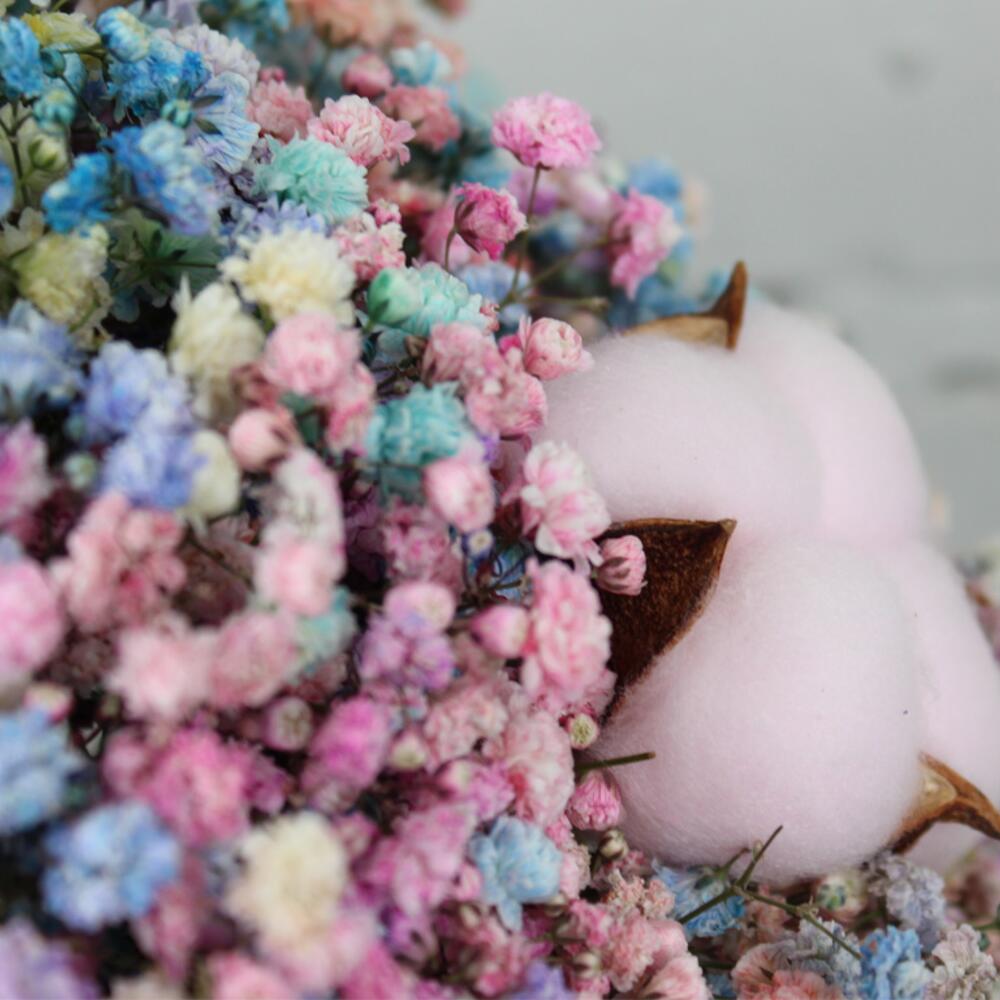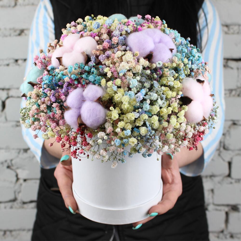 Гипсофила - 9 шт. Хлопок - 9 шт. Оазис - 1 шт. Коробка - 1 шт.