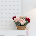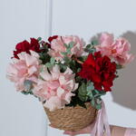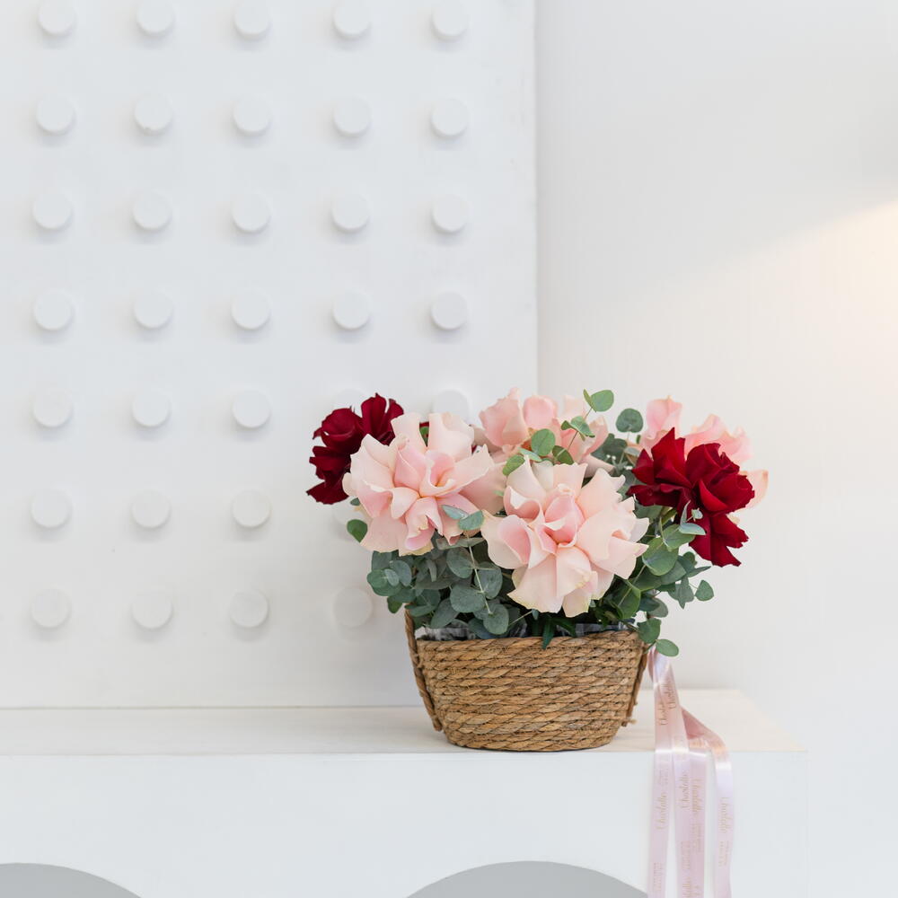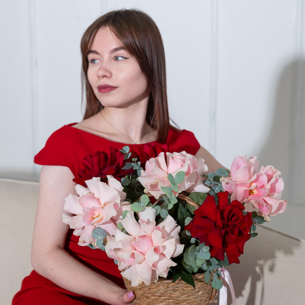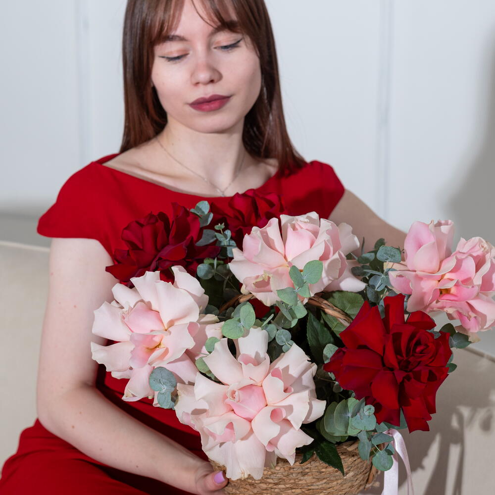 Трендовая композиция в мягкой корзине, в составе которой 7 вывернутых роз и эвкалипта.
