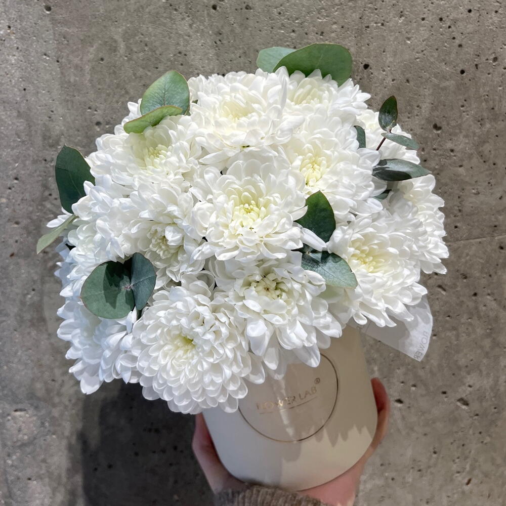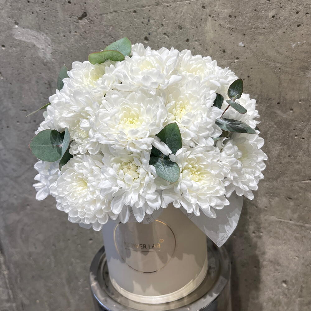 Коробка шляпная - 1 шт. Упаковка дизайнерская - 3 шт. Хризантема Балтика - 4 шт. Эвкалипт Микс - 1 шт. Оазис флористический - 1 шт.