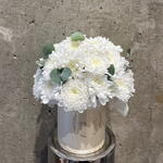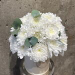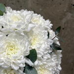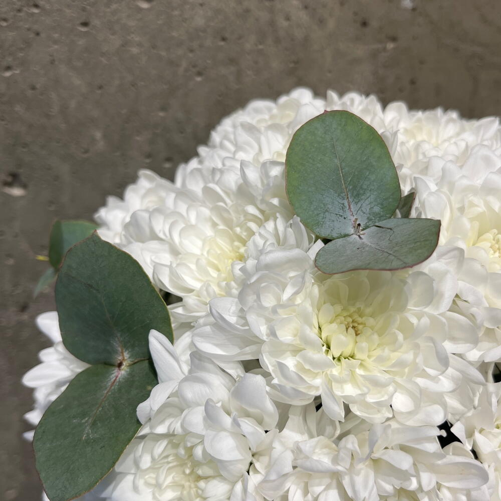 Композиция из кустовой хризантемы и эвкалипта . Стойкий состав и приятная цветовая гамма. Подойдет для бабушки , мамы , сестры , девушки .
