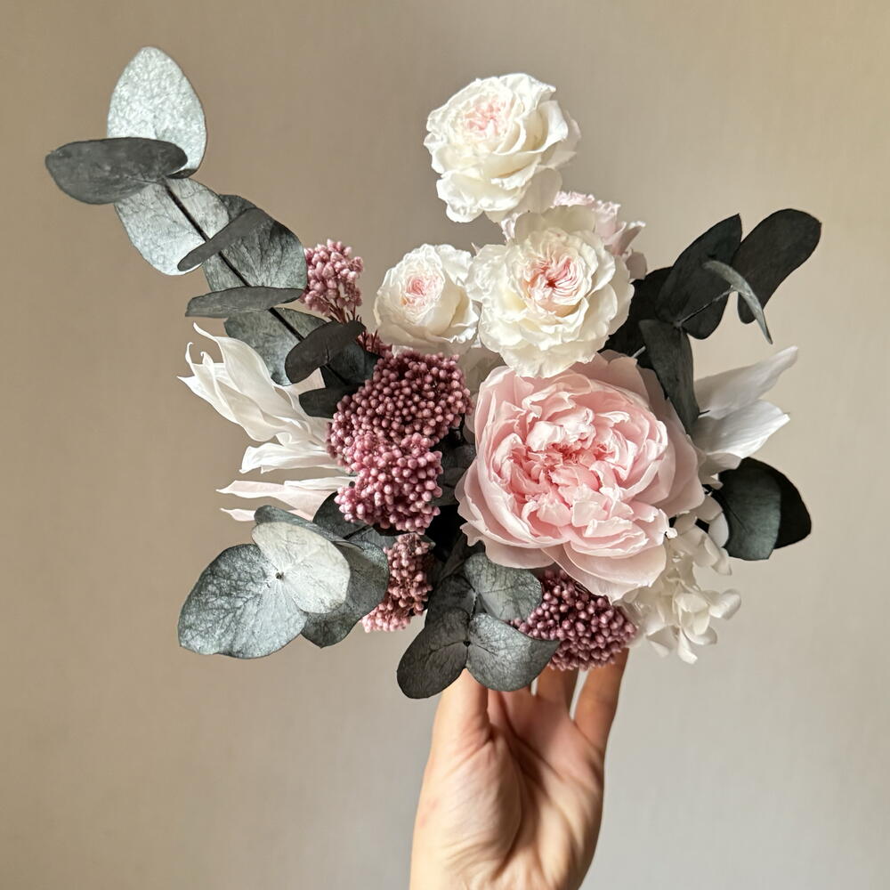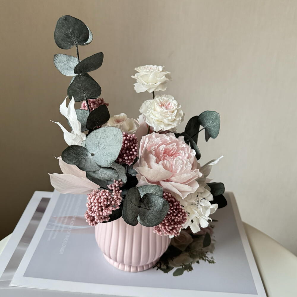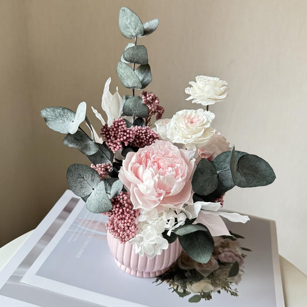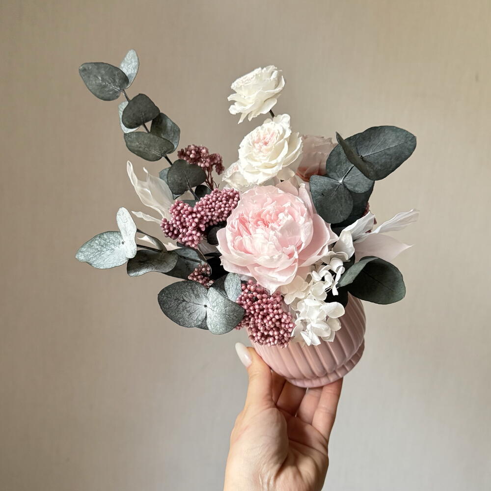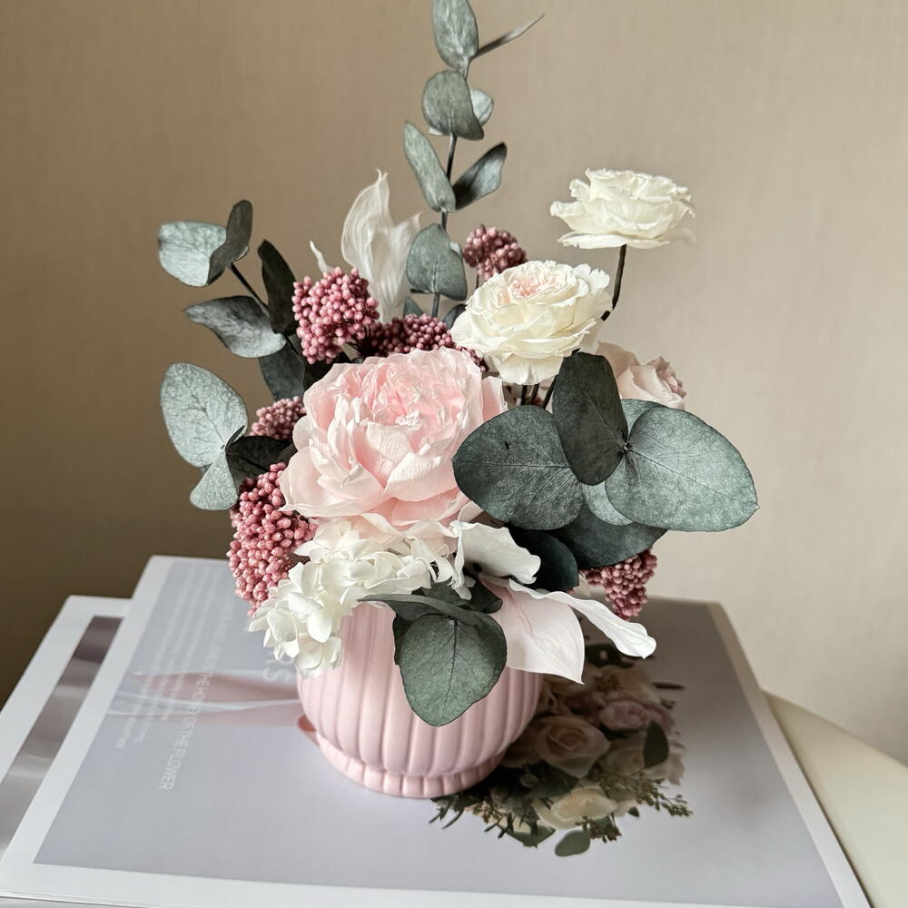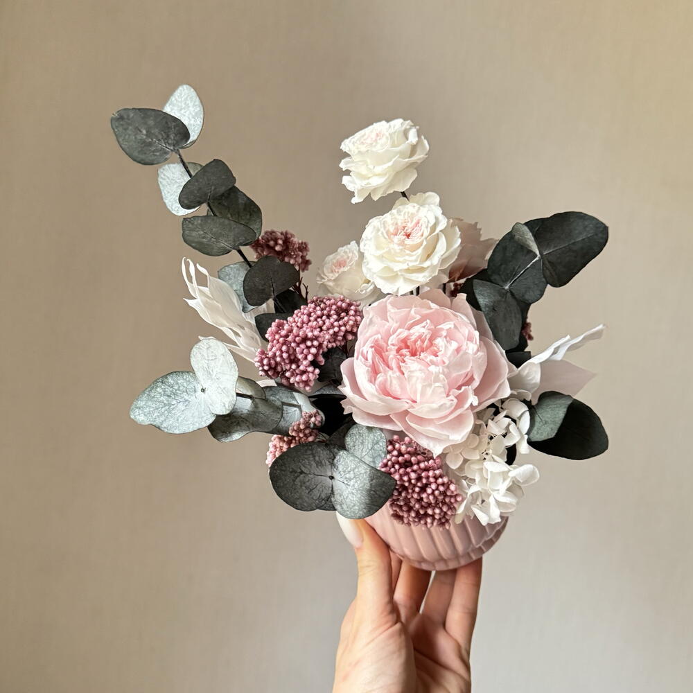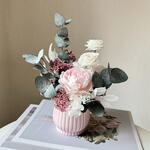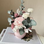 Кашпо керамика - 1 шт. Оазис для сухоцветов - 1 шт. Эвкалипт стабилизированный - 5 шт. гортензия стабилизированная - 2 шт. озотамнус стабилизированный - 6 шт. рускус стабилизированный микс - 2 шт. роза пионовидная стабилизированная микс - 5 шт.