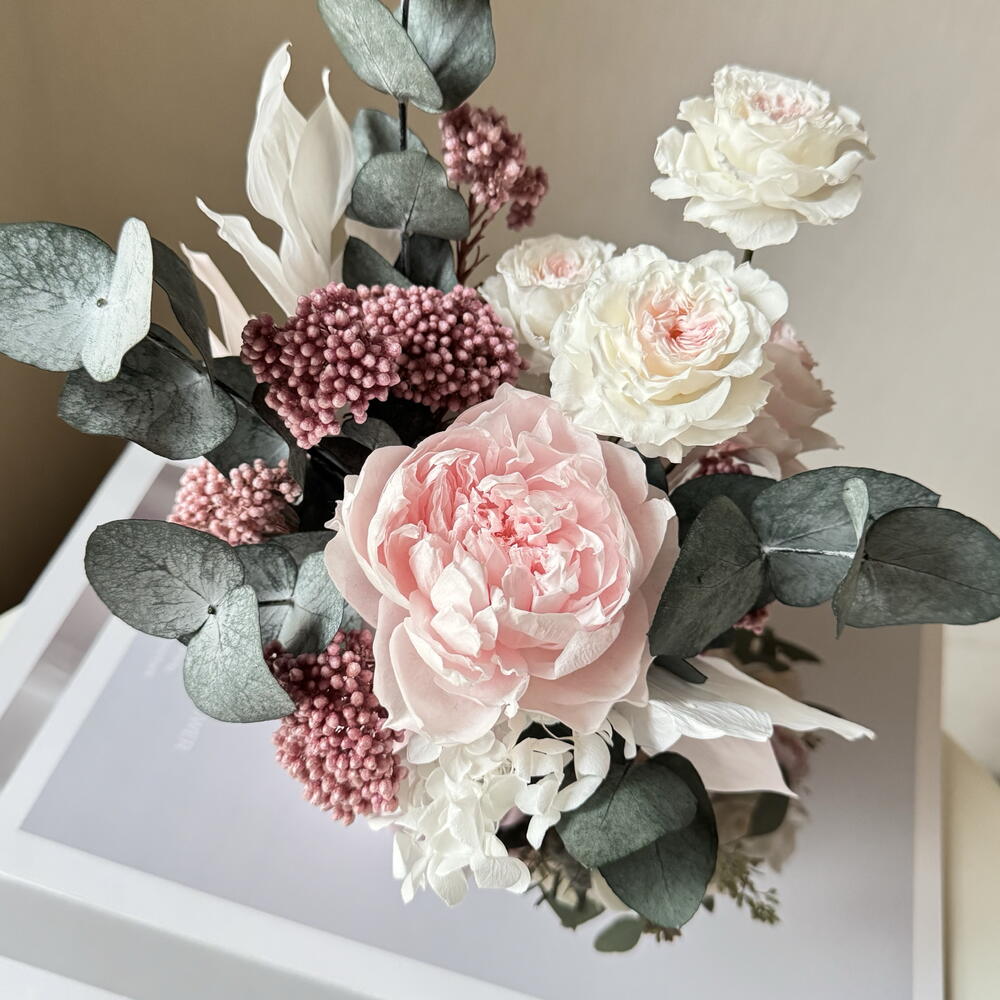 Композиция из нежных розово-сиреневых стабилизированных цветов