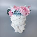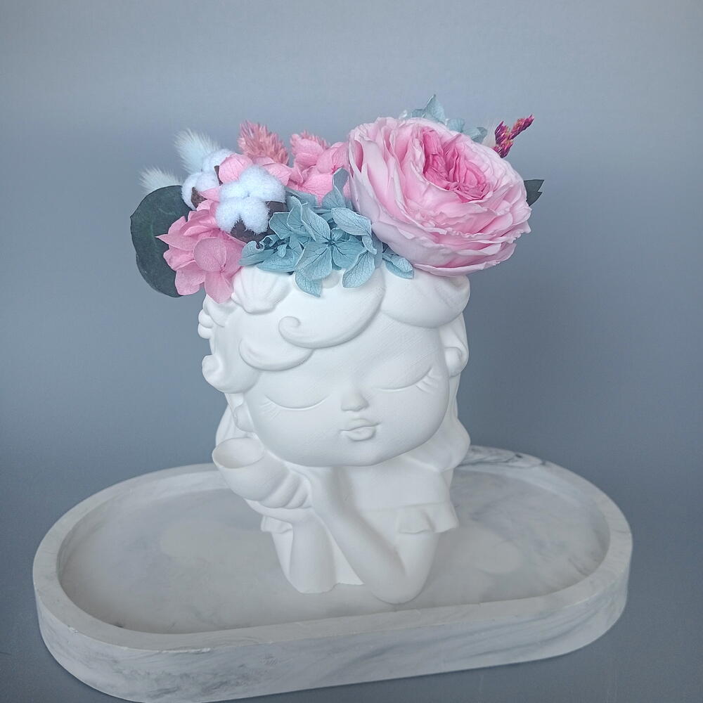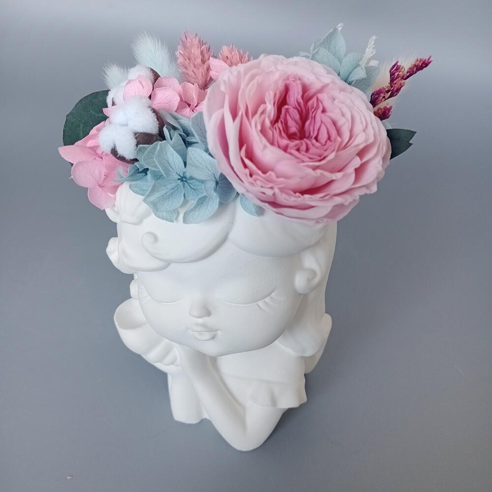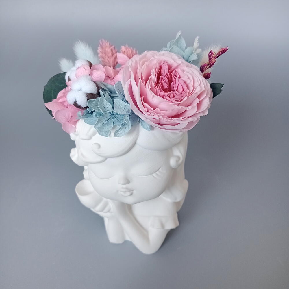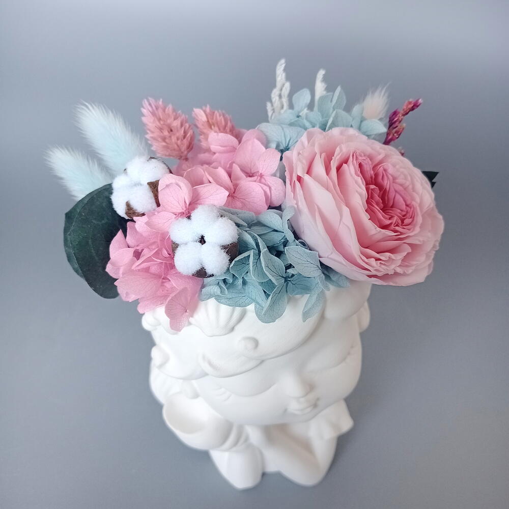 Хлопок - 2 шт. фаларис сухоцвет - 2 шт. роза стабилизированная пионовидная - 1 шт. лагурус сухоцвет - 3 шт. гортензия стабилизированная пучок - 1 шт. кермек стабилизированный ветка - 1 шт. кашпо гипс ручной работы - 1 шт. эвкалипт стабилищированный - 1 шт.