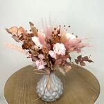 Ваза керамика - 1 шт. Сухоцвет - 10 шт. Роза стабилизированная - 3 шт. Лагурус - 1 шт. Эвкалипт стабилизированный - 2 шт. озотамнус стабилизированный - 1 шт. мох стабилизированный розовый - 1 шт. краспедия стабилизированная - 2 шт. сетария сухоцвет - 1 шт. мискантус сухоцвет - 1 шт. сухой лен - 1 шт.
