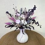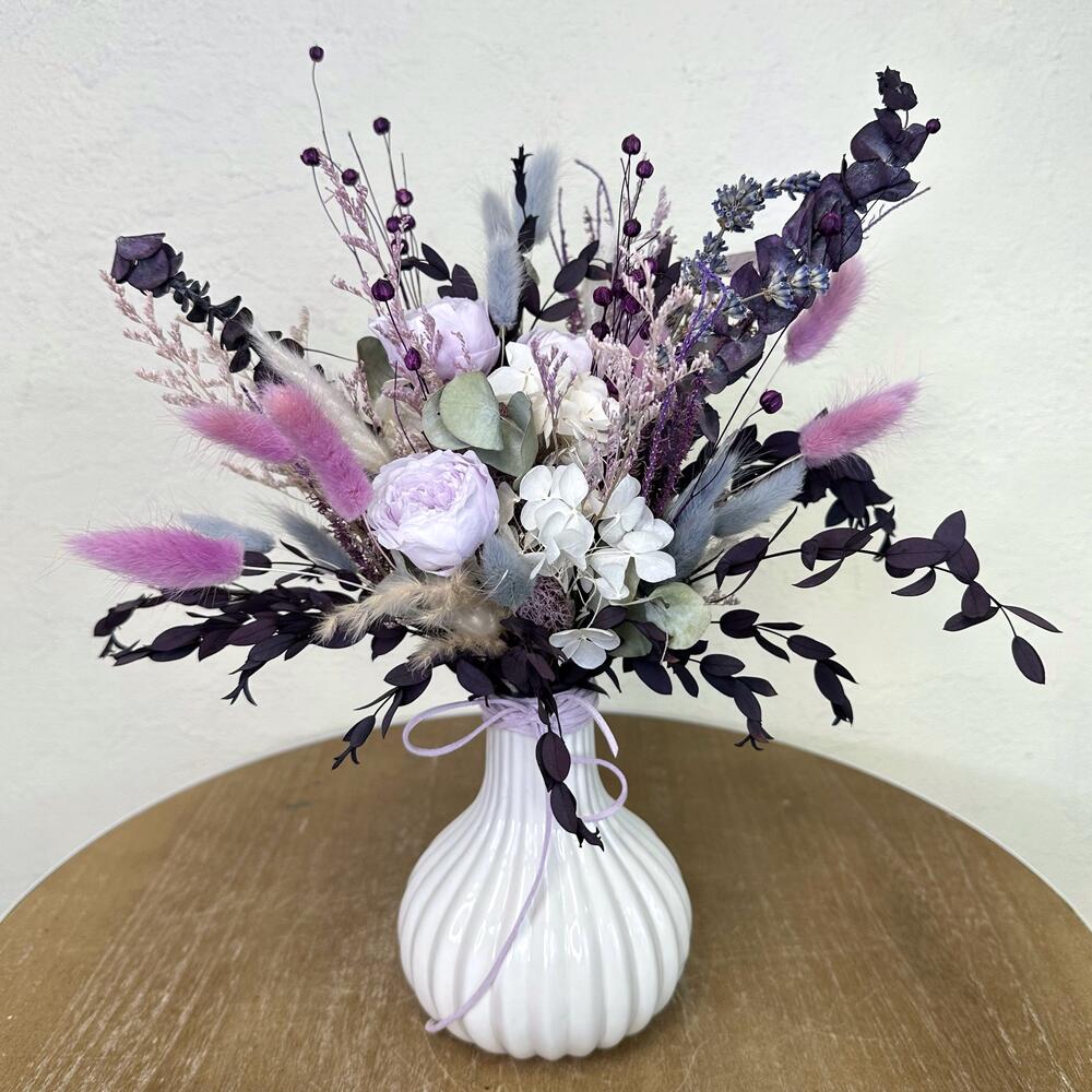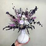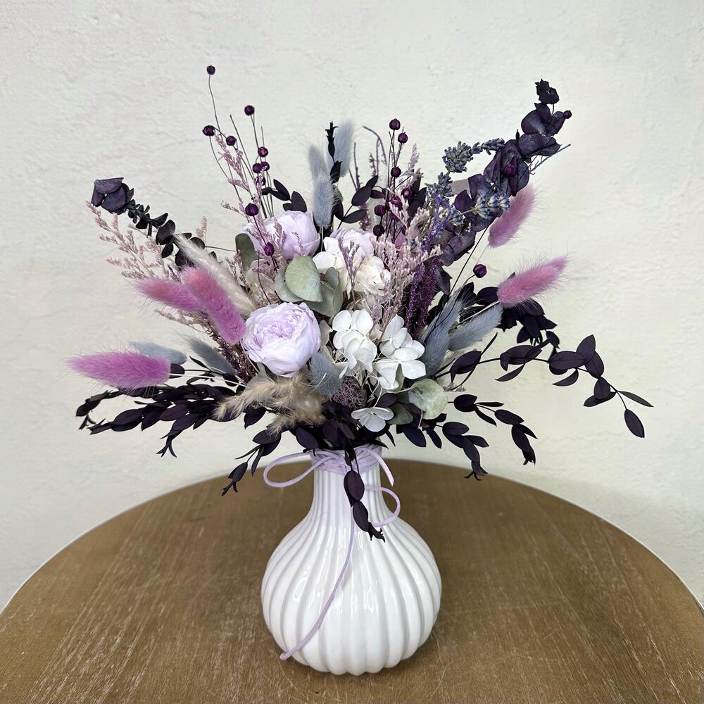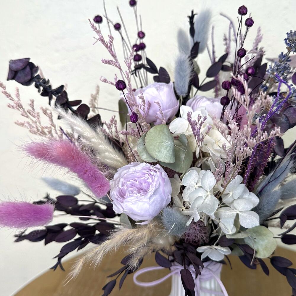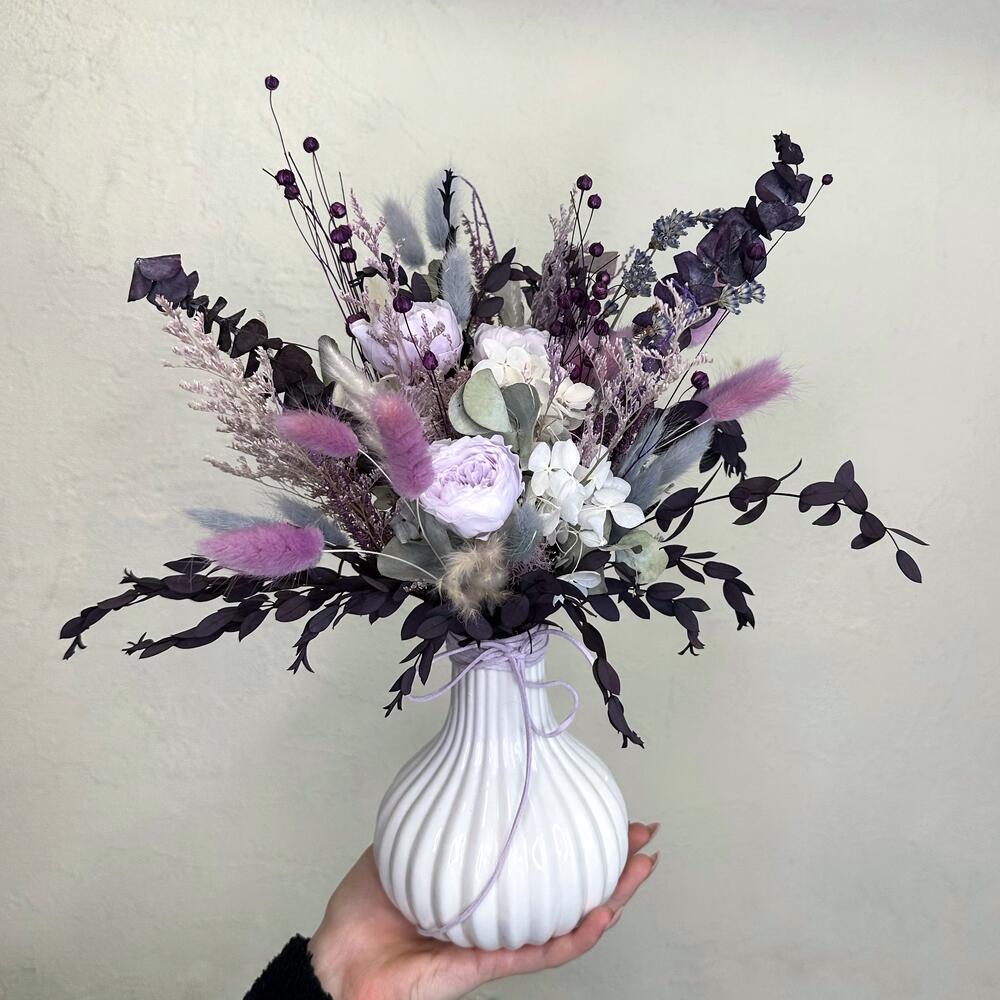 Лаванда - 1 шт. Лимониум - 2 шт. Эвкалипт - 2 шт. Ваза керамика - 1 шт. Стабилизированная роза - 3 шт. Лагурус - 1 шт. мискантус сухоцвет - 4 шт. сухой лен - 1 шт.