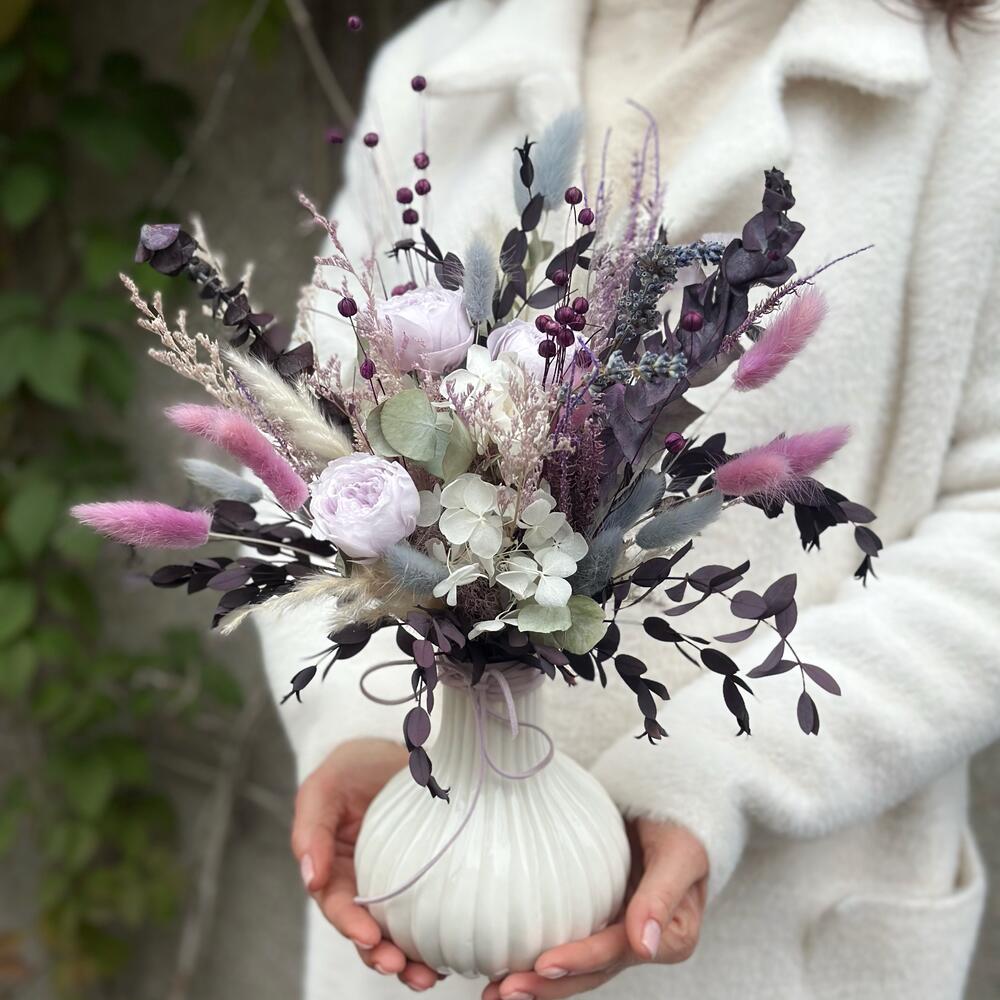 Нежная композиция из стабилизированных цветов и сухоцветов в керамическом кашпо Стабилизированные цветы - это натуральные растения в специальной обработке. Растение прочное и эластичное, на вид совершенно ничем не отличается от натурального! Цветок проходит специальную обработку раствором на основе глицерина, вся влага удаляется из цветка. Это позволяет сохранить тактильную свежесть цветов, замедляя их старение и останавливая процессы фотосинтеза. Благодаря этому стабилизированные цветы не требуют ухода, полива, у них достаточно длительный срок хранения - от 3 до 8 лет. Композицию отправим в красивом подарочном пакете!