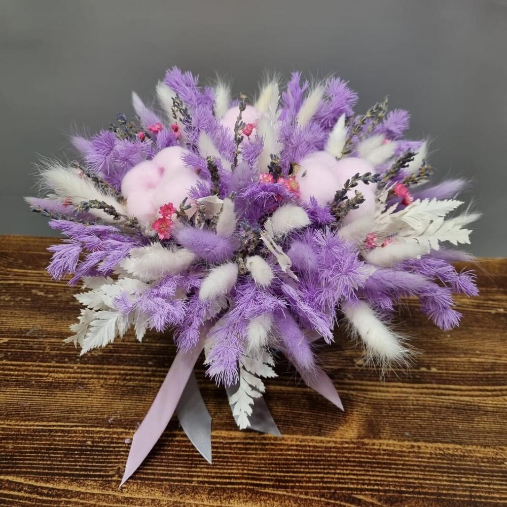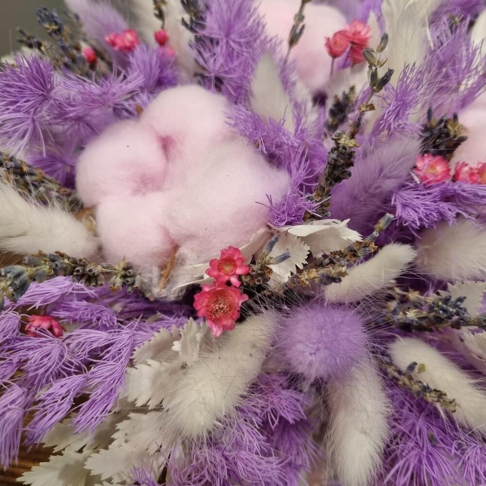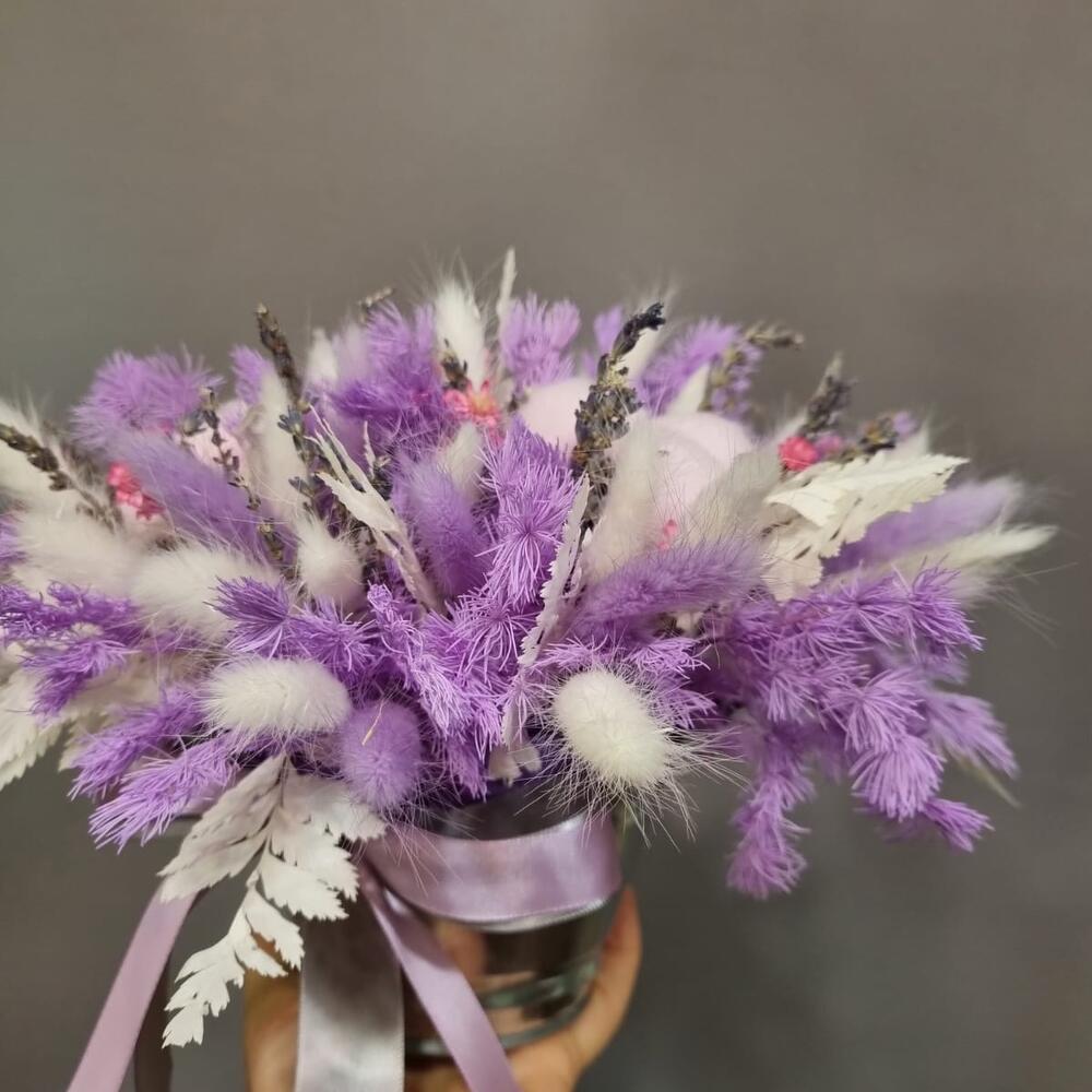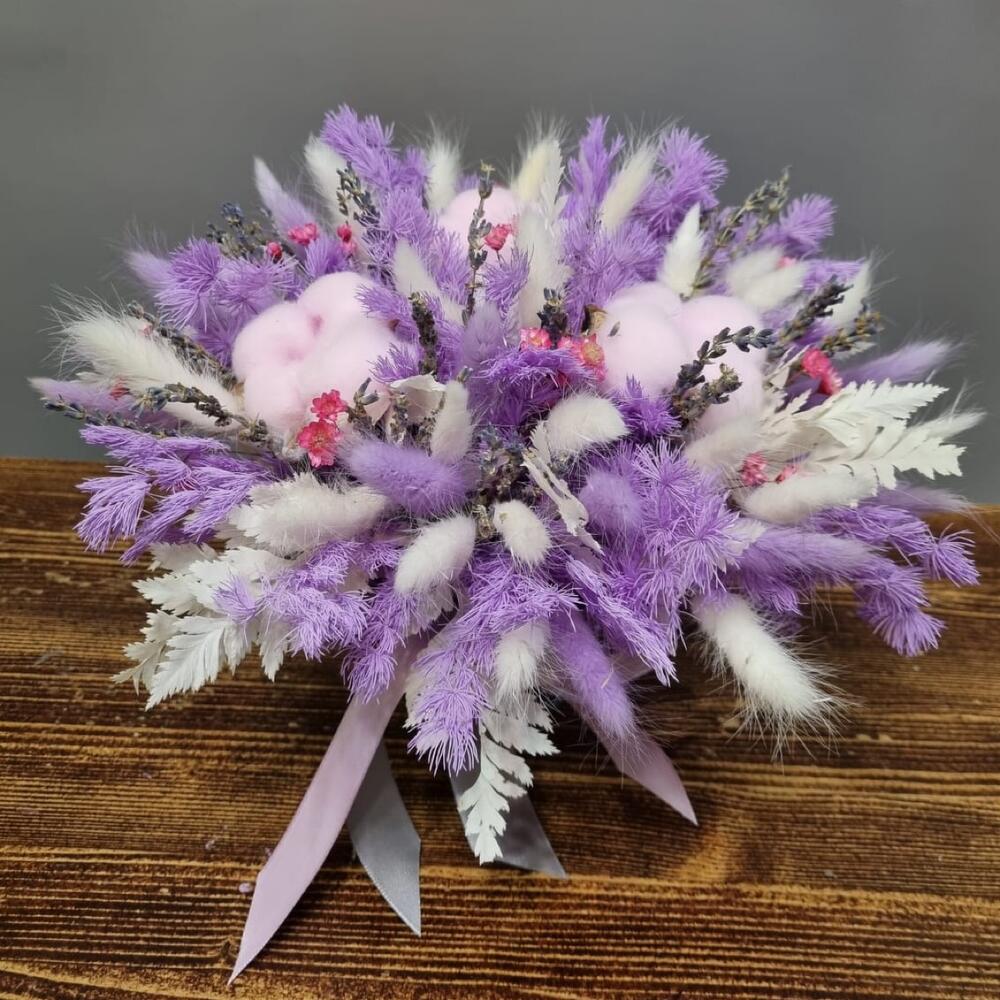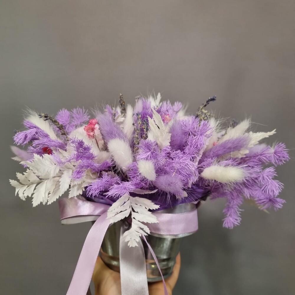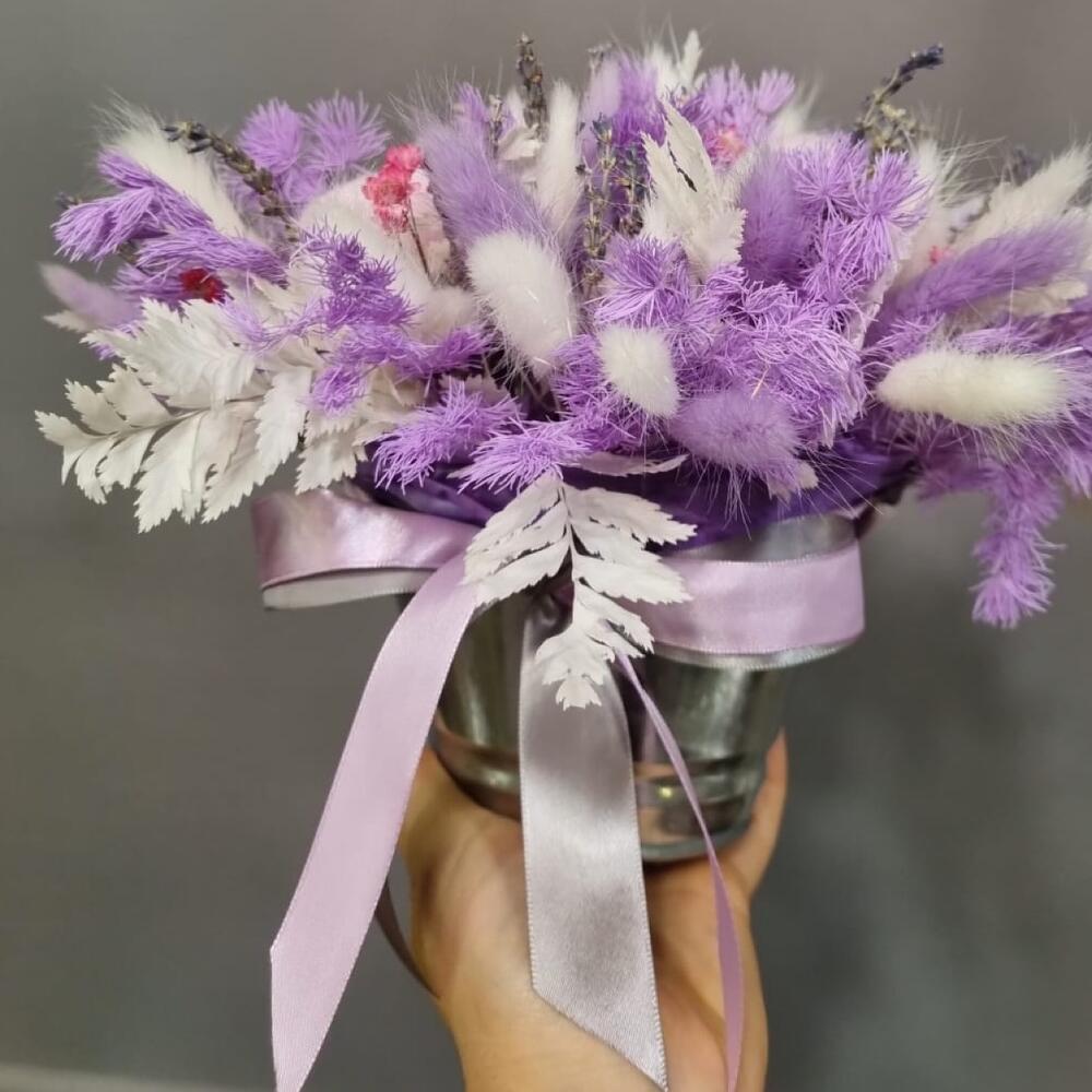 Хлопок - 3 шт. Тишью - 2 шт. Лагурус - 40 шт. Кашпо металлическое - 1 шт. Оазис флористический - 1 шт. аспарагус стабилизированный - 1 шт. папоротник стабилизированный - 2 шт. любовь флориста (бесплатно) - 100 шт.