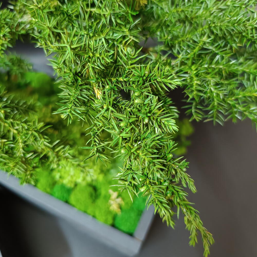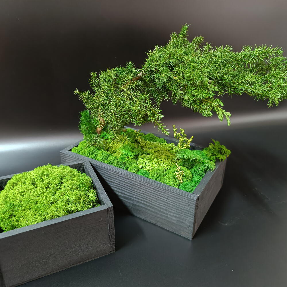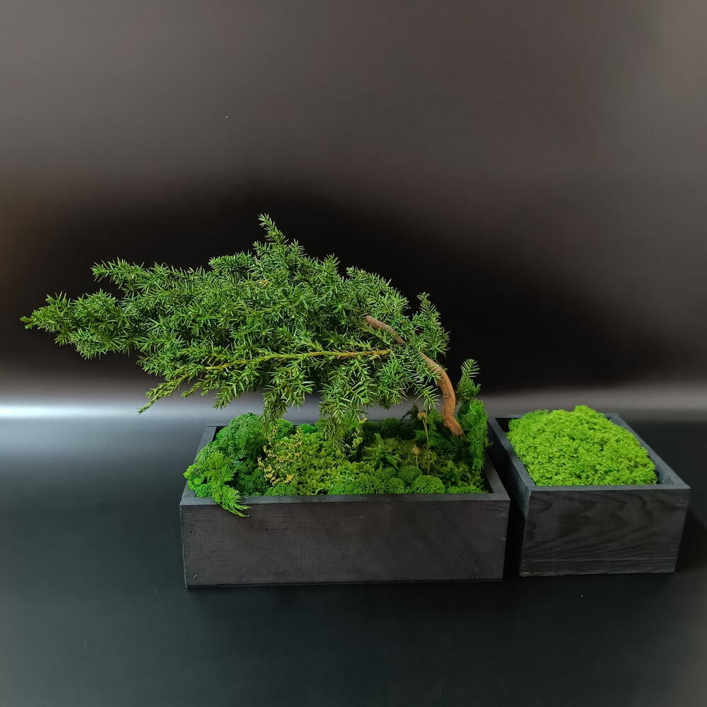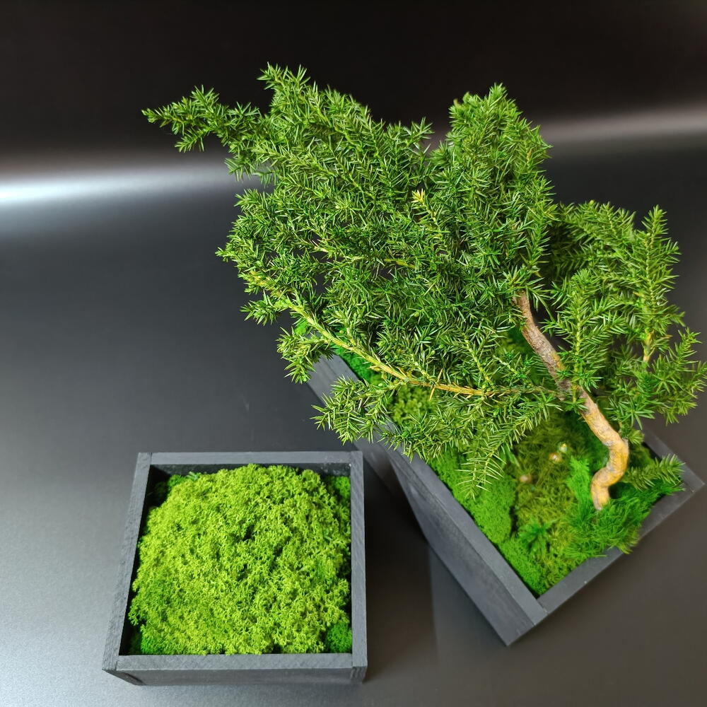 Стабилизированный мох - 5 шт. Кашпо дерево - 2 шт. стабилизированный можжевельник - 1 шт.