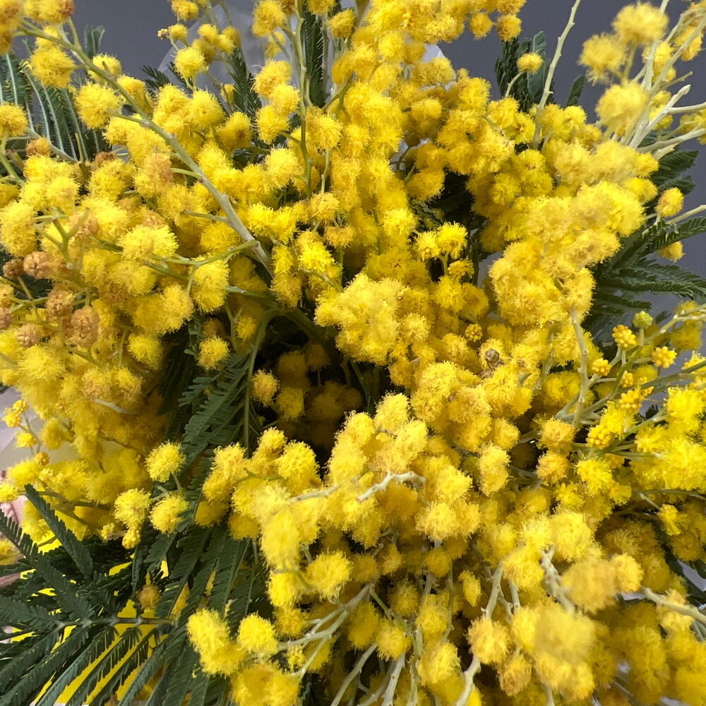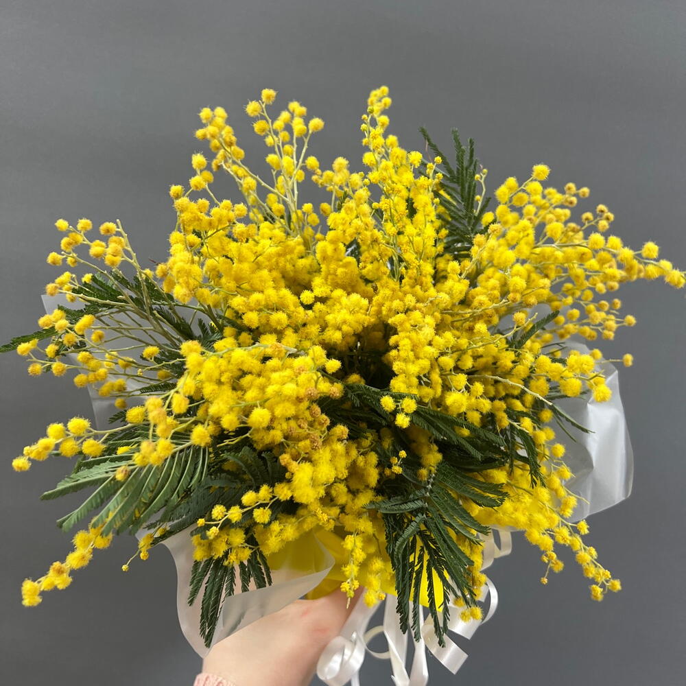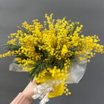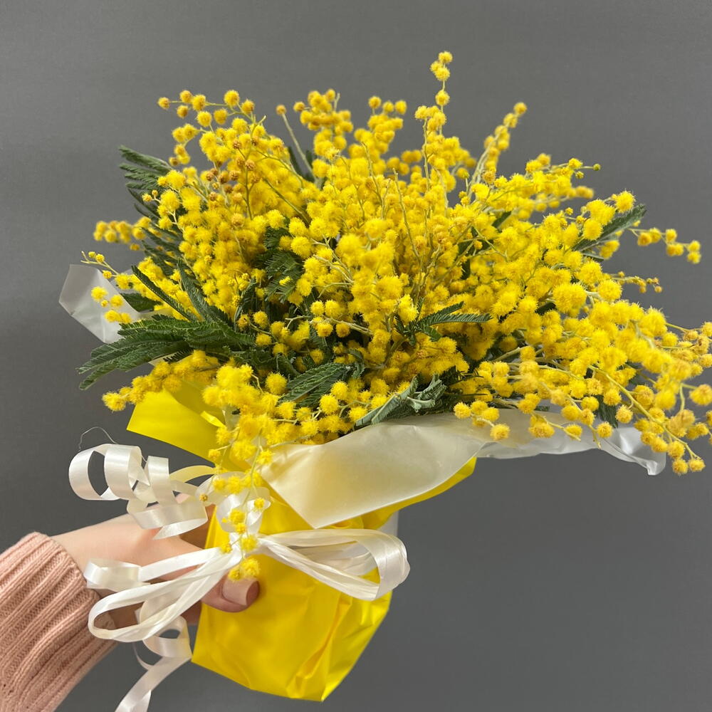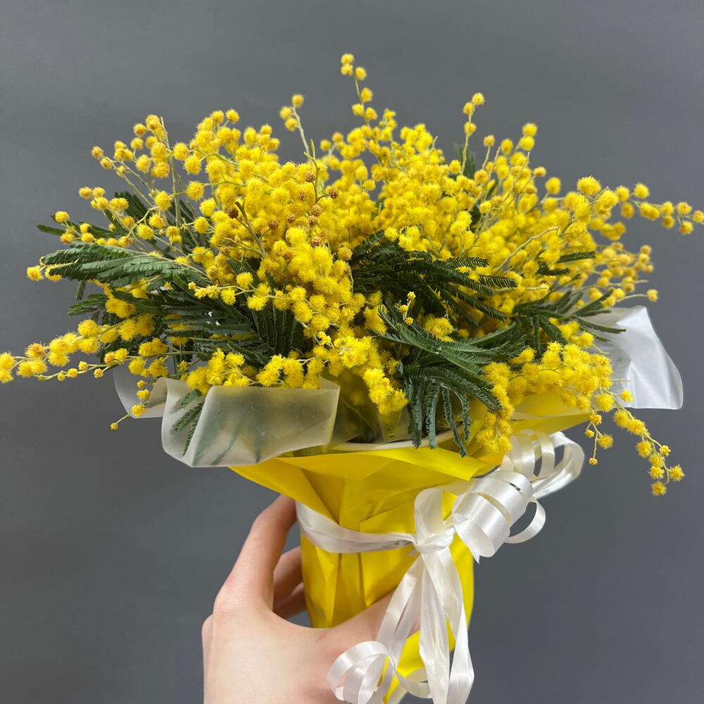 Лента - 1 шт. Мимоза - 3 шт. Упаковка - 1 шт. Оазис флористический - 1 шт. Стакан крафт дизайнерский - 1 шт.