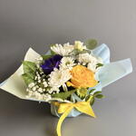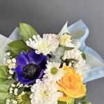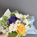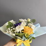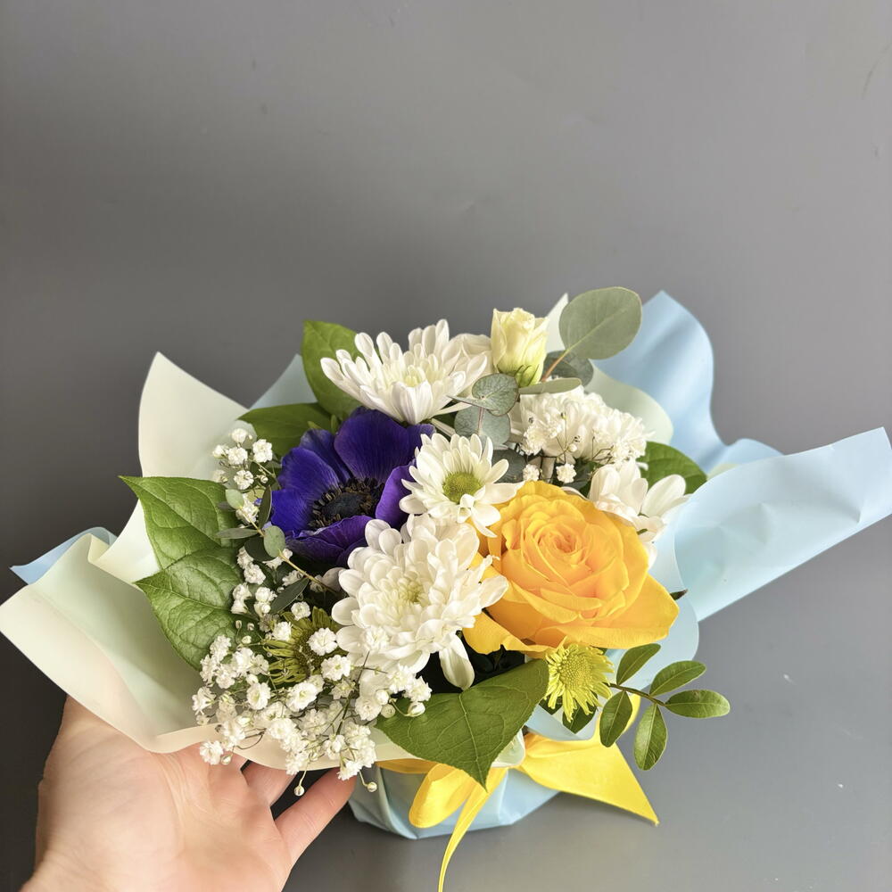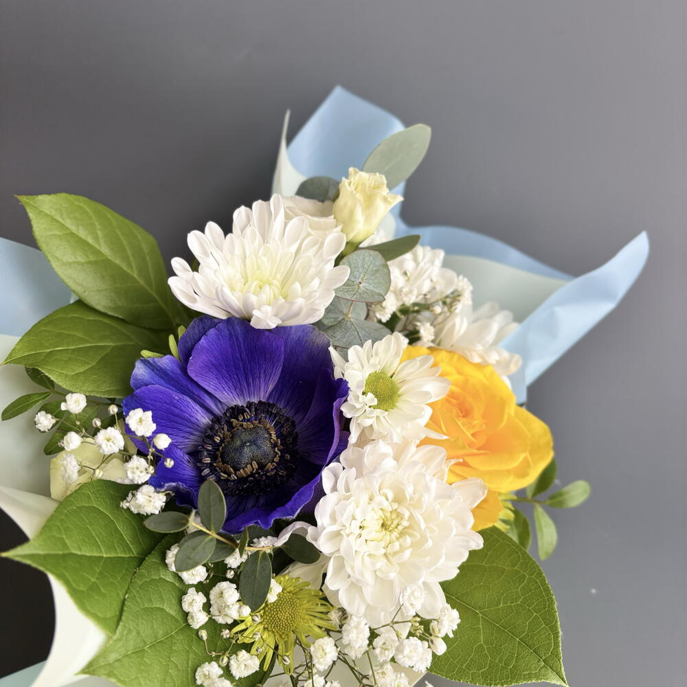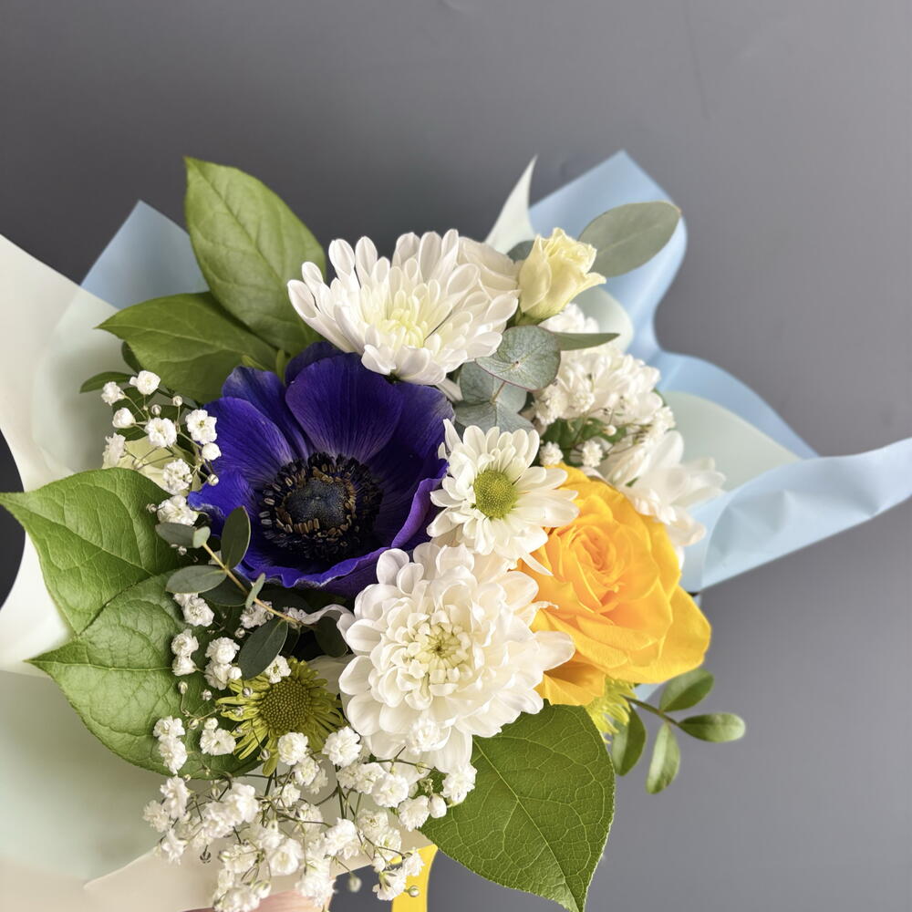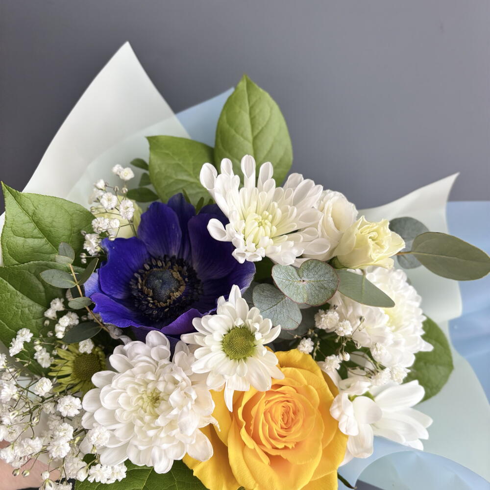 Анемон - 1 шт. Гипсофила - 1 шт. Лизиантус - 1 шт. Писташ - 1 шт. Роза желтая - 1 шт. Салал - 2 шт. Хризантема кустовая - 1 шт. Эвкалипт Цинерея - 1 шт. первифолия - 1 шт.