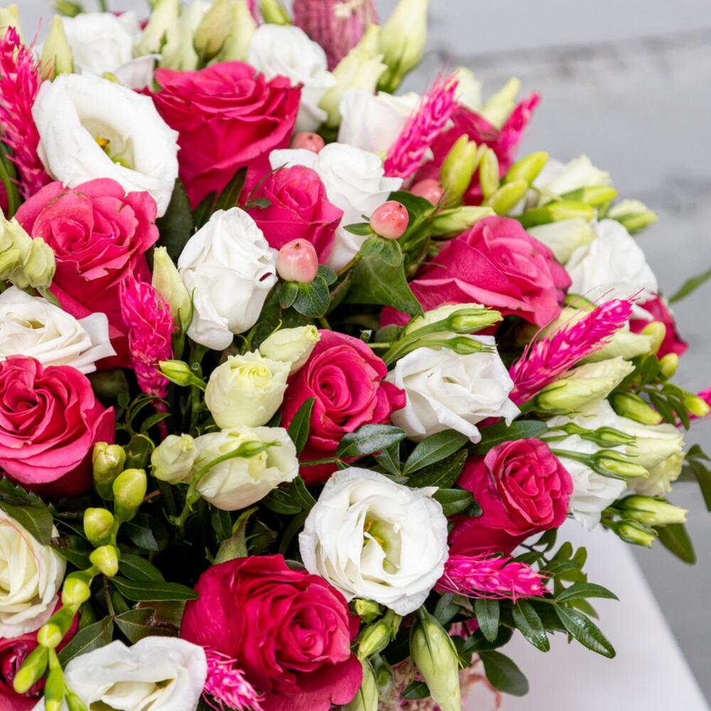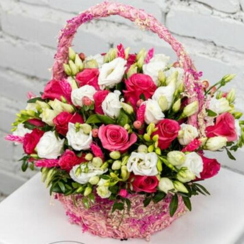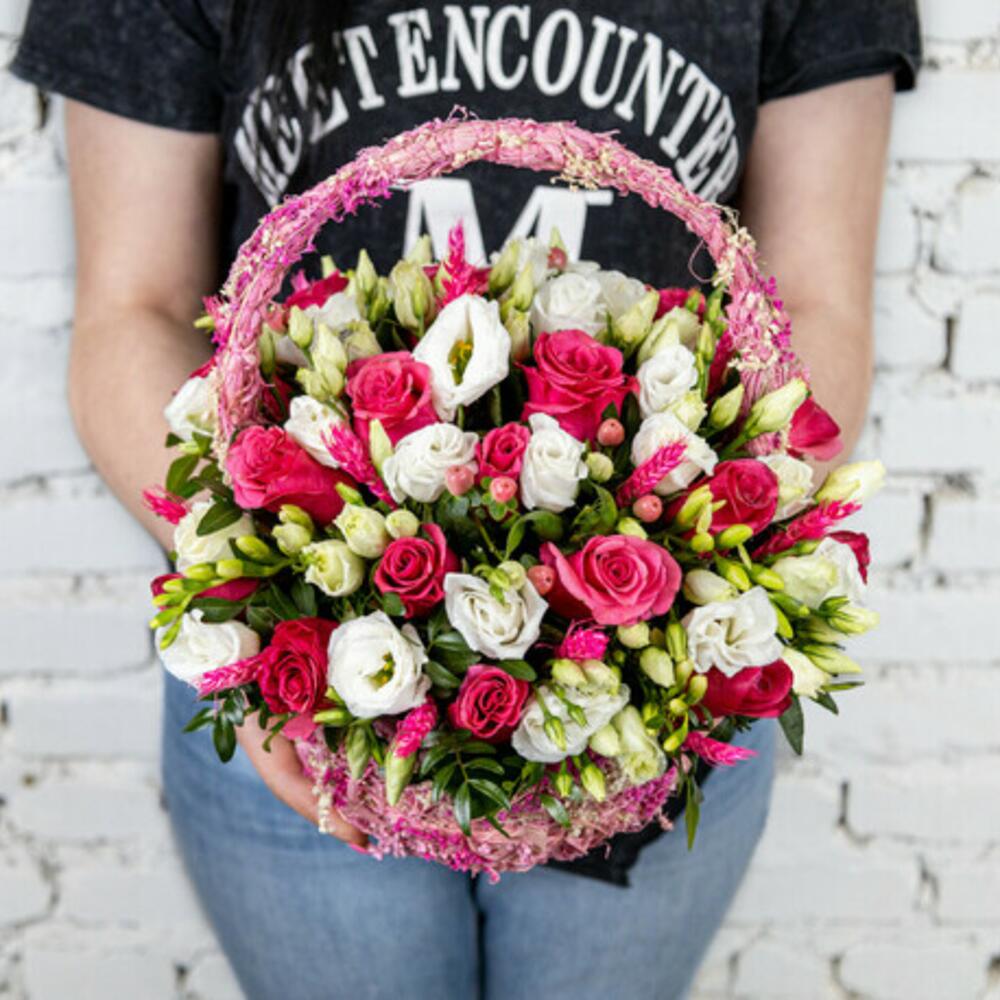 Гиперикум - 5 шт. Корзина - 1 шт. Эустома - 5 шт. Оазис - 1 шт. Фисташка - 1 шт. Пшеница - 13 шт. роза кения - 20 шт.