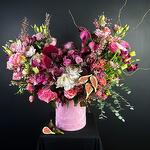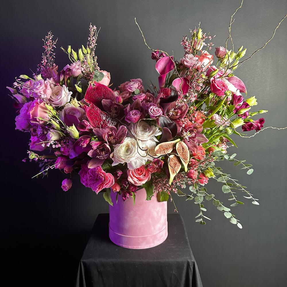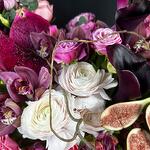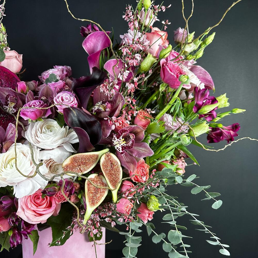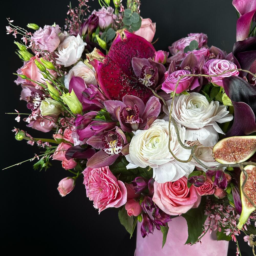 Альстромерия - 10 шт. Орхидея Цимбидиум - 7 шт. Роза одноголовая - 10 шт. Коробка шляпная - 1 шт. Ранункулюс - 5 шт. эустома розовая - 10 шт. Инжир - 2 шт. Питахайя - 1 шт. эвкалипт банч - 1 шт. каллы - 7 шт. розы пионовидные кустовые Misty Bubbles - 20 шт. корилус ветка - 2 шт. гениста банч - 1 шт.