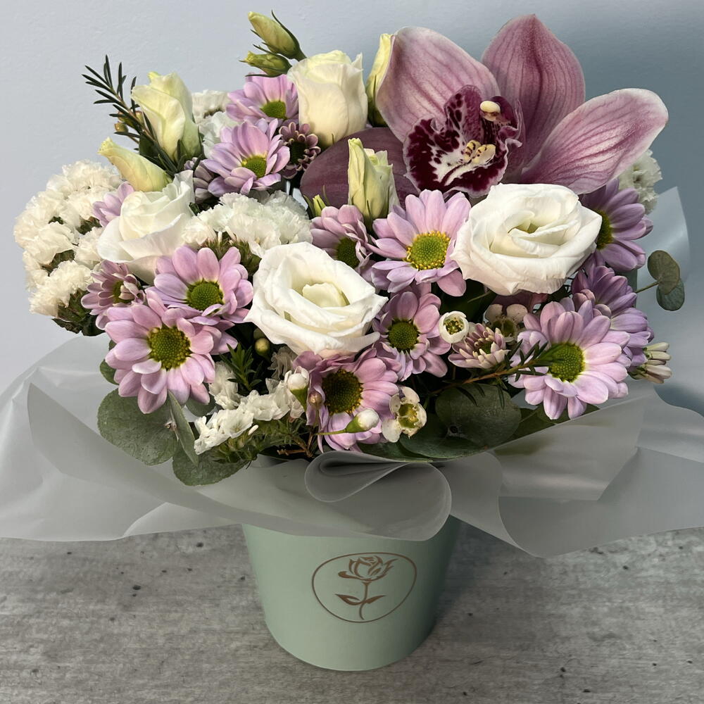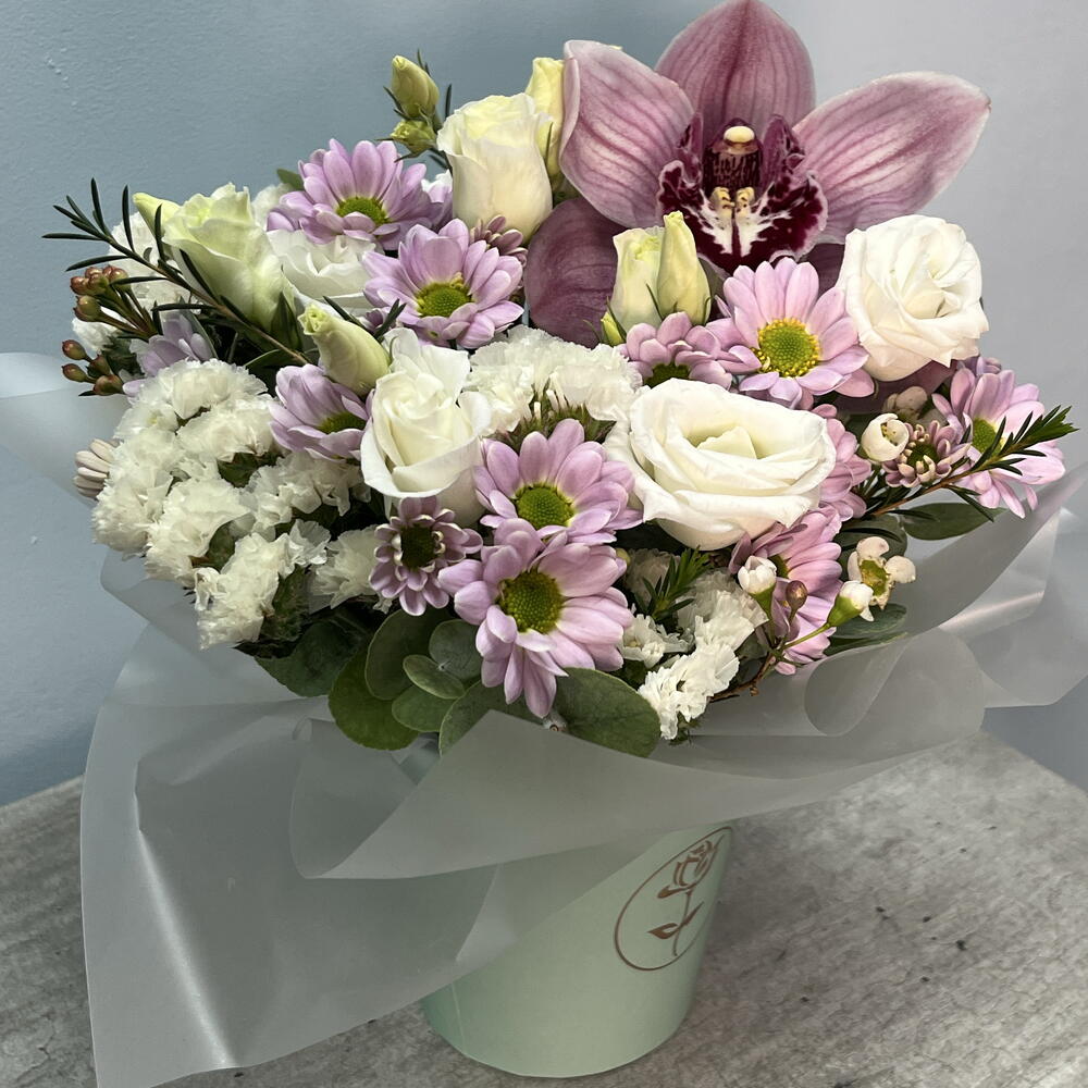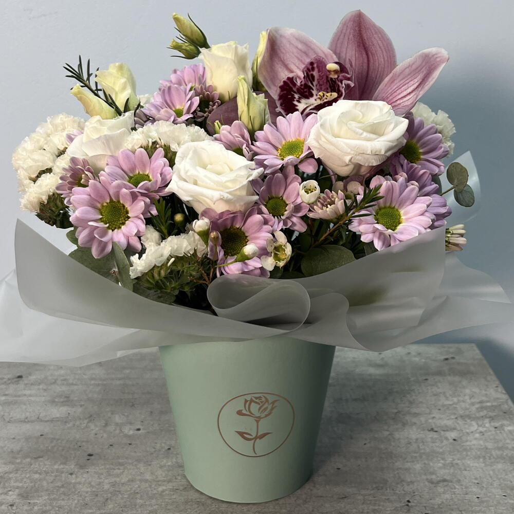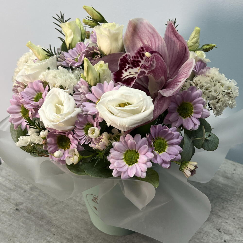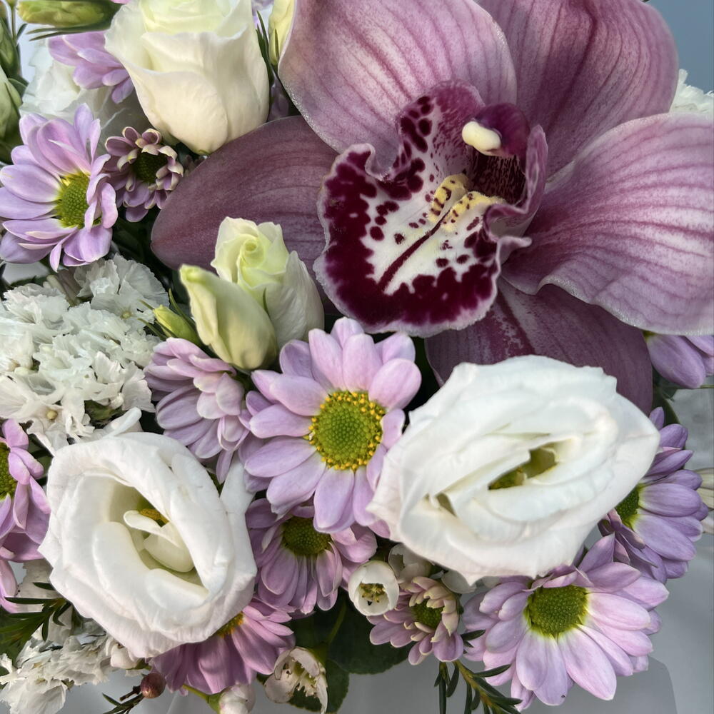 Орхидея Цимбидиум - 1 шт. Статица - 2 шт. Сантини - 2 шт. эустома белая - 2 шт. Хамелациум Белый - 1 шт. Стакан флористический - 1 шт.