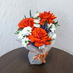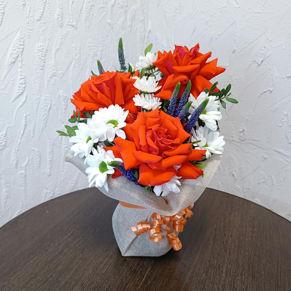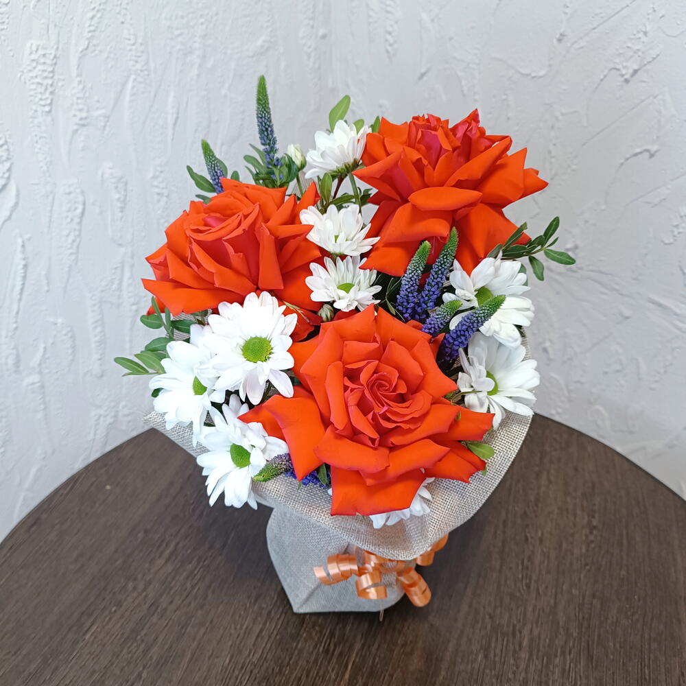Вероника - 3 шт. Хризантема кустовая Белая - 1 шт. Фисташка - 1 шт. Упаковка лен - 1 шт. Флористическая губка (оазис) - 1 шт. роза французская нина - 3 шт.