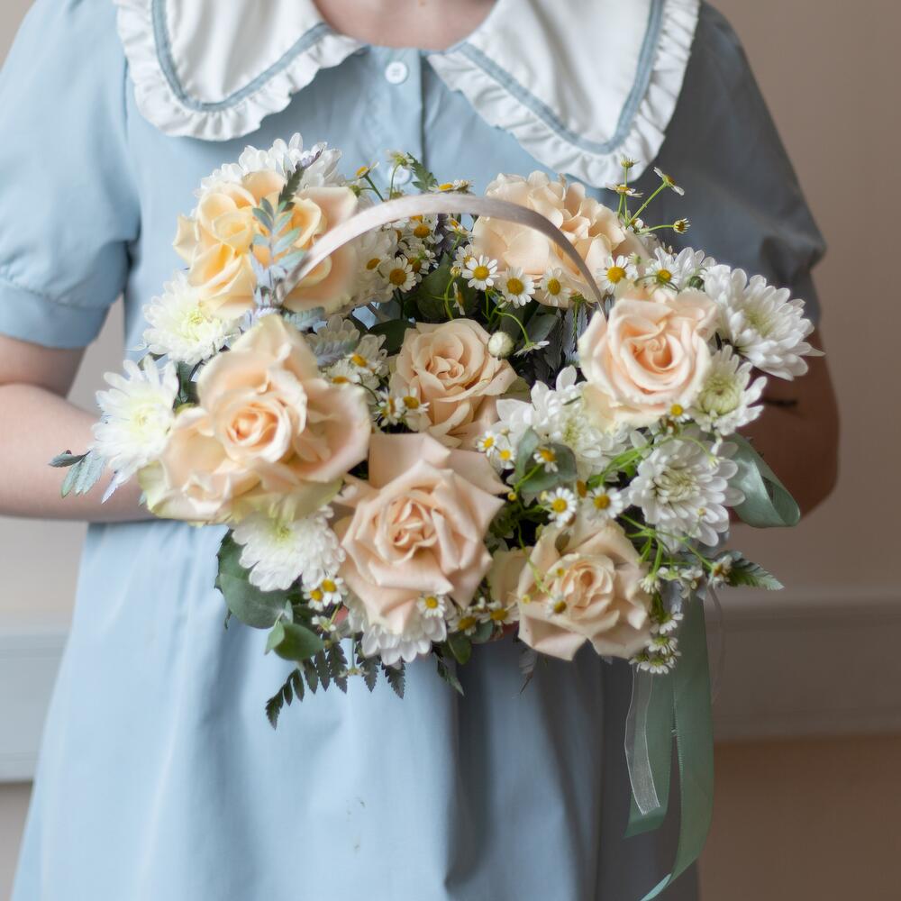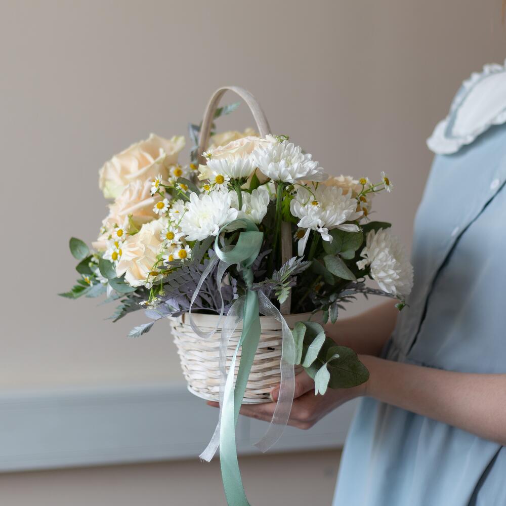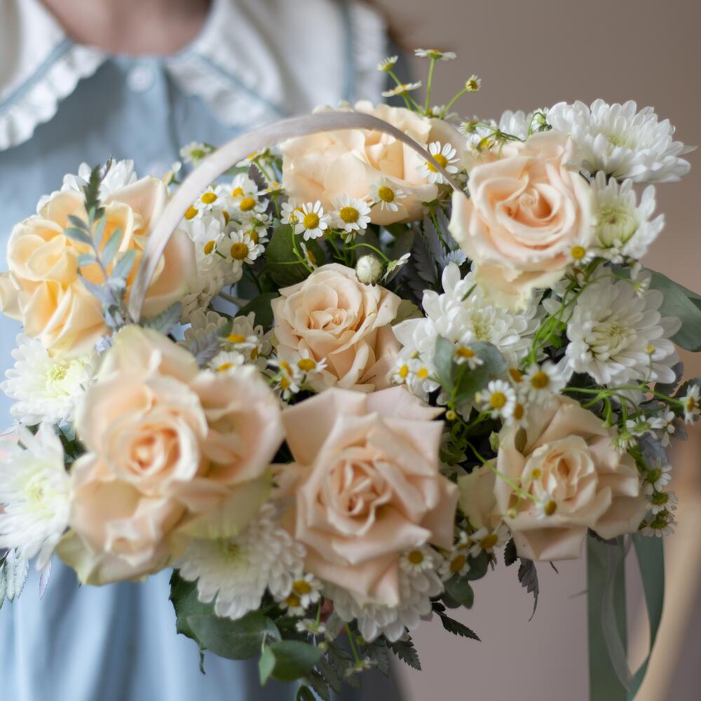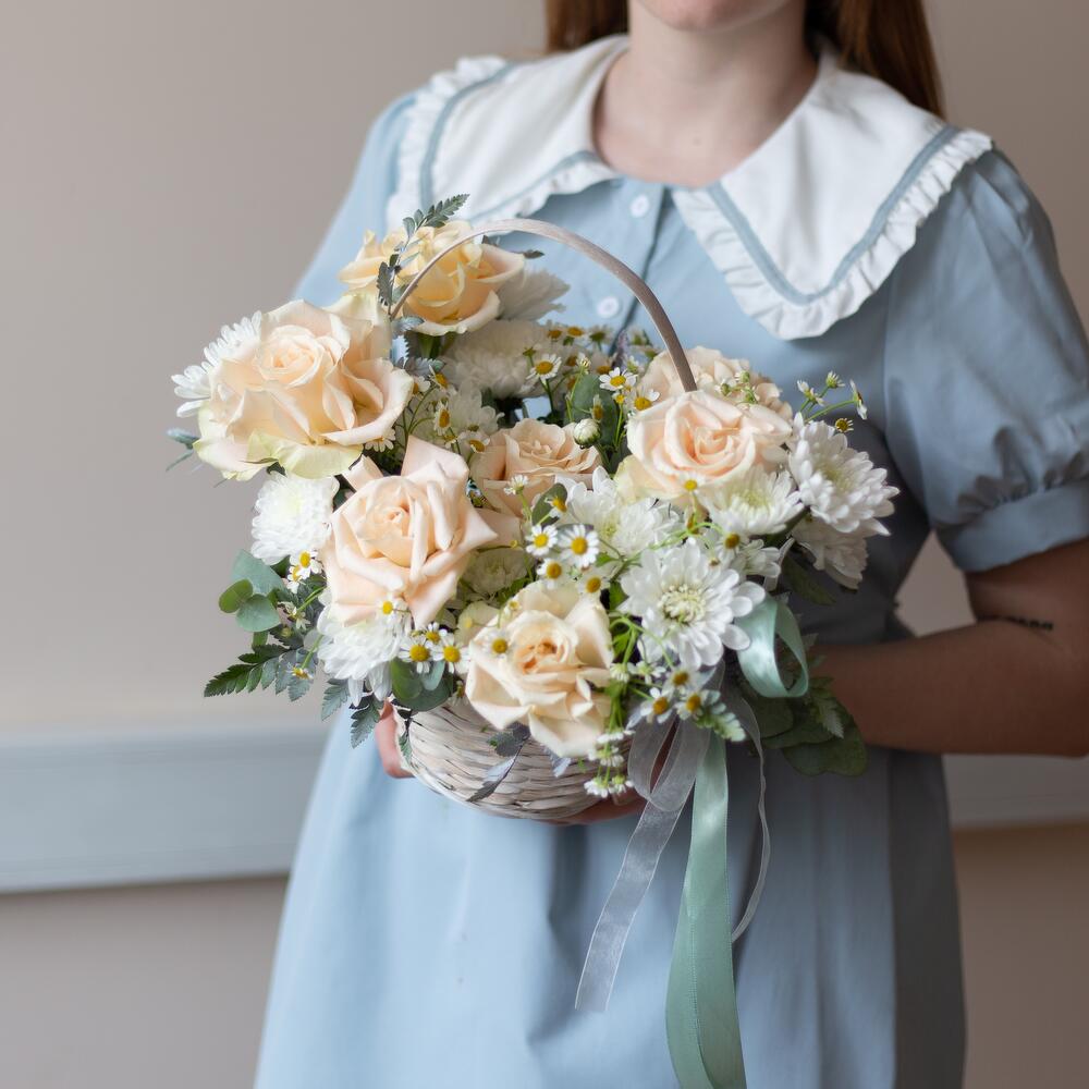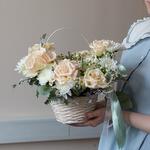 Корзина - 1 шт. Лента - 2 шт. Хризантема кустовая - 2 шт. Эвкалипт - 2 шт. Ромашка кустовая - 2 шт. Оазис - 1 шт. Роза французская - 7 шт.