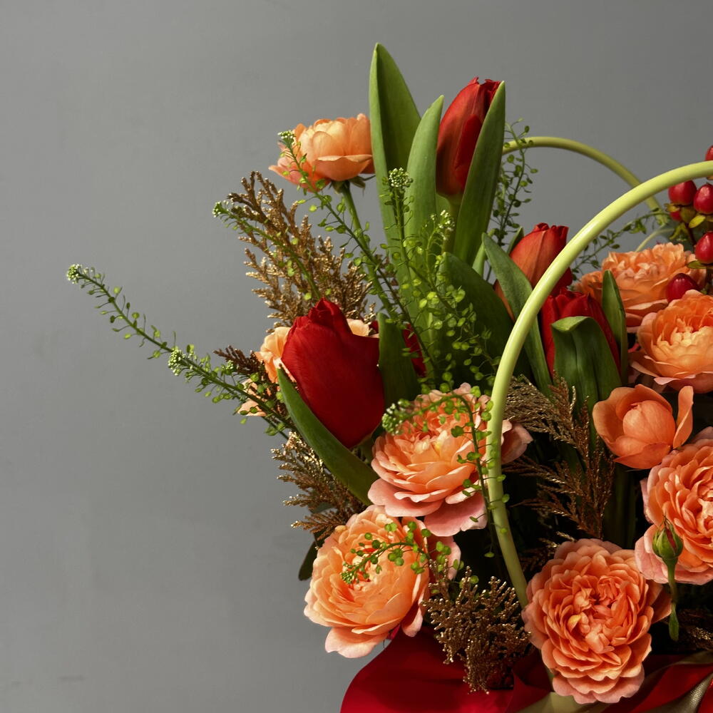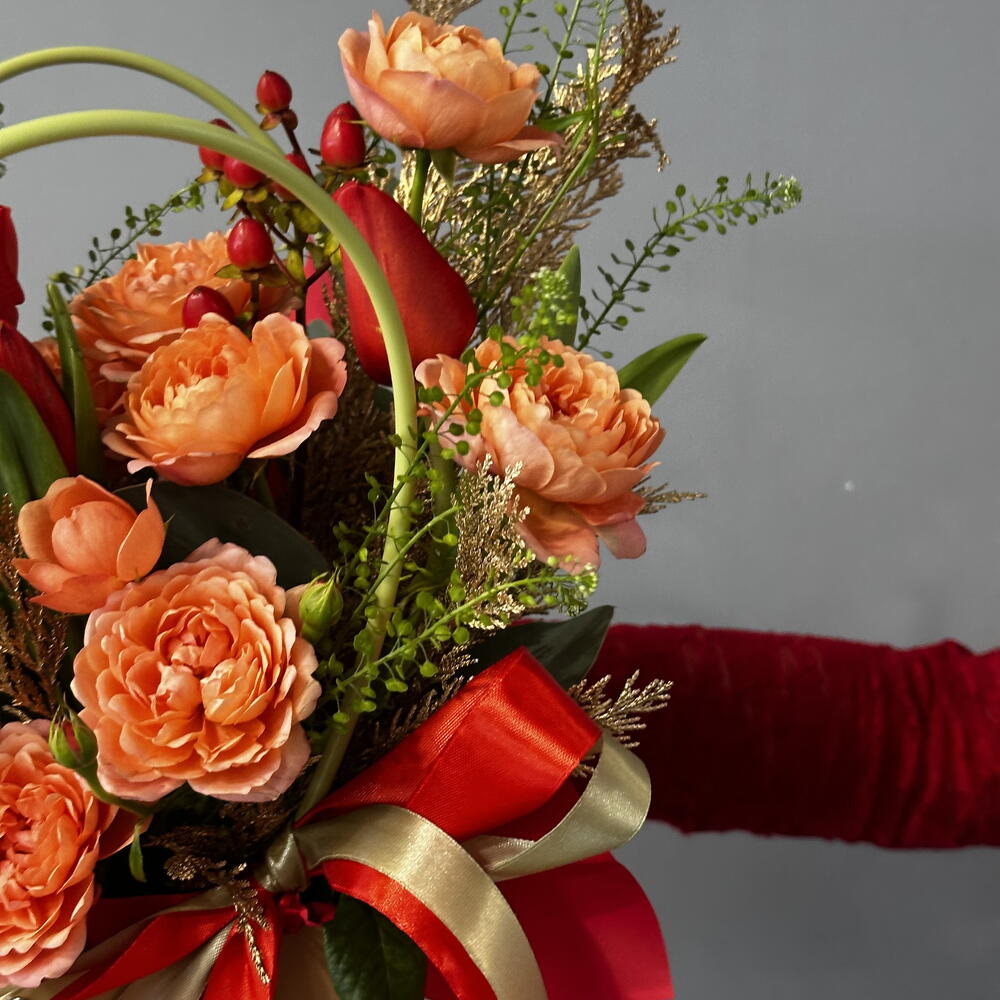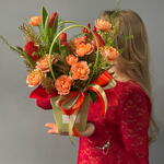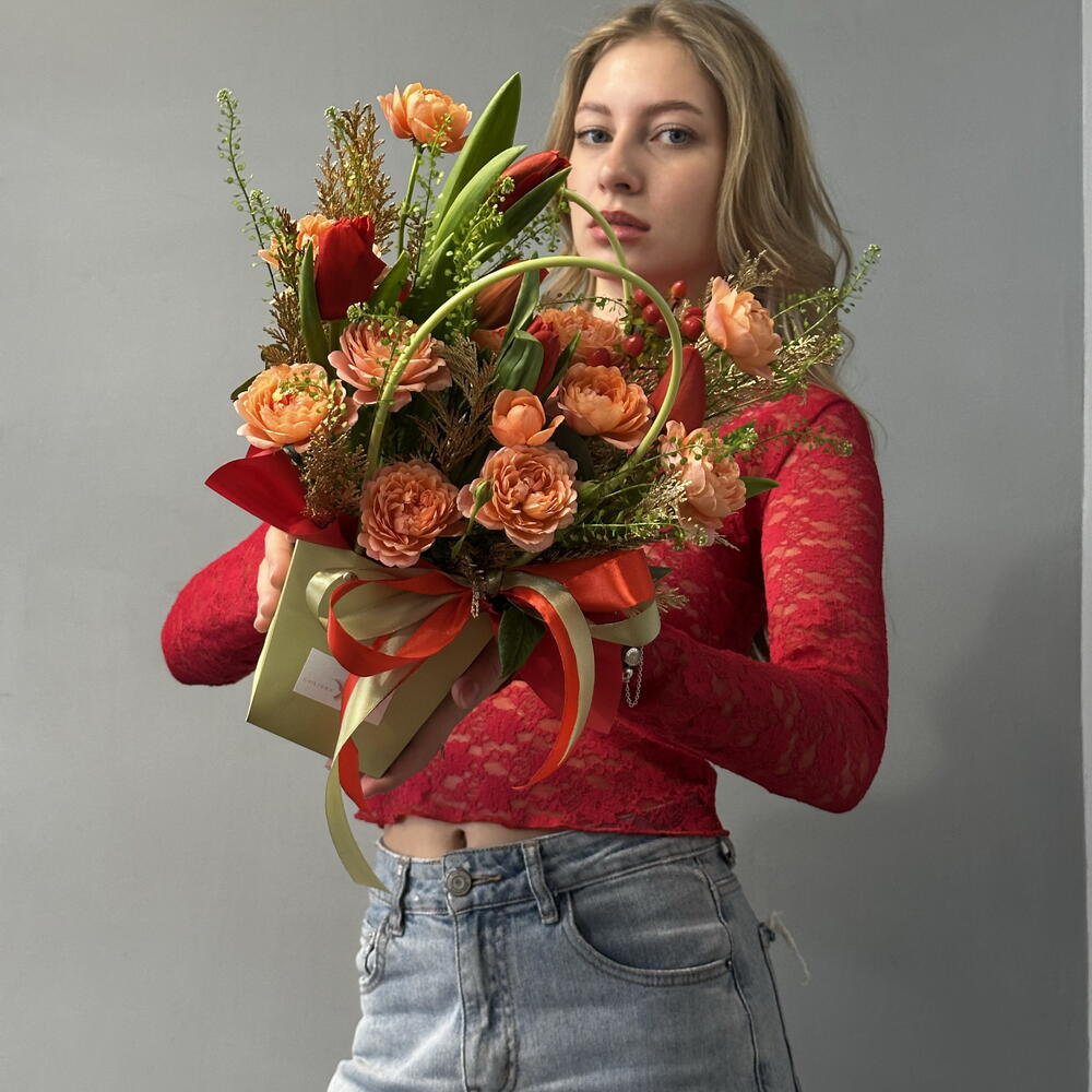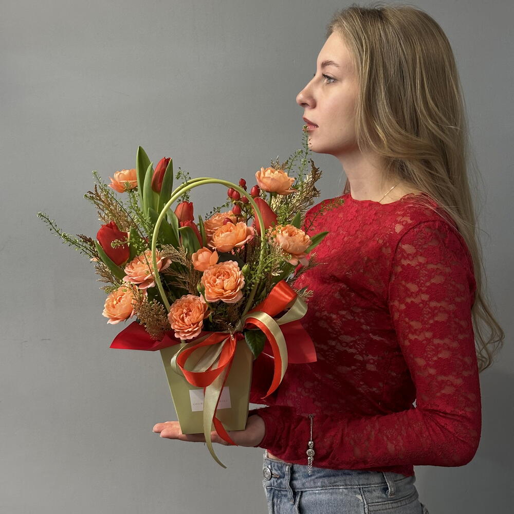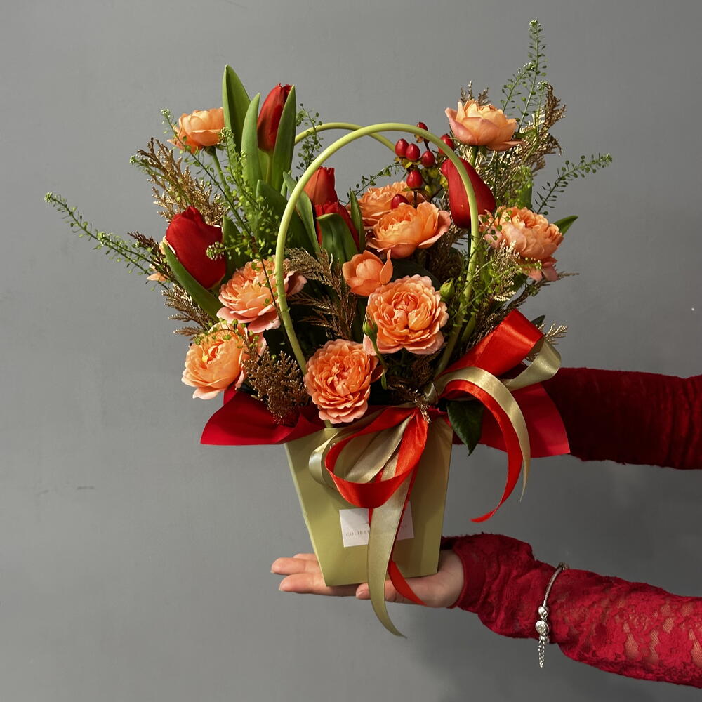 Гиперикум - 1 шт. Лента атласная - 2 шт. Тюльпан красный - 5 шт. Роза кустовая пионовидная - 2 шт. Гринбелл - 1 шт. Сумка - 1 шт. Конифер - 1 шт. Губка флористическая - 1 шт.