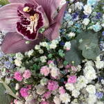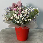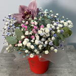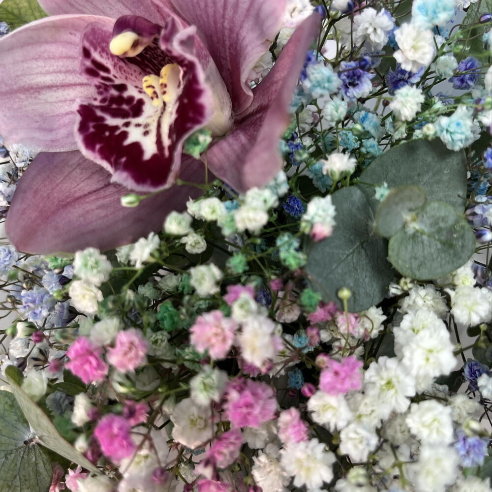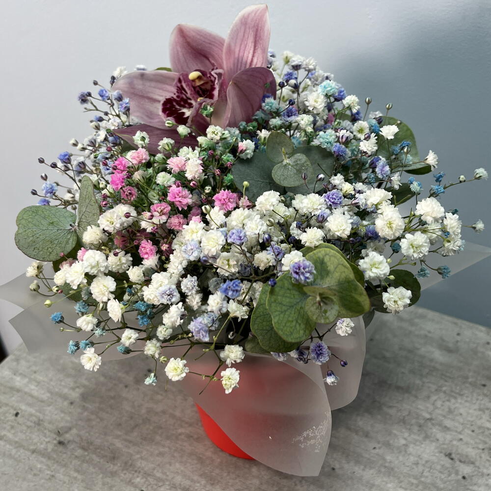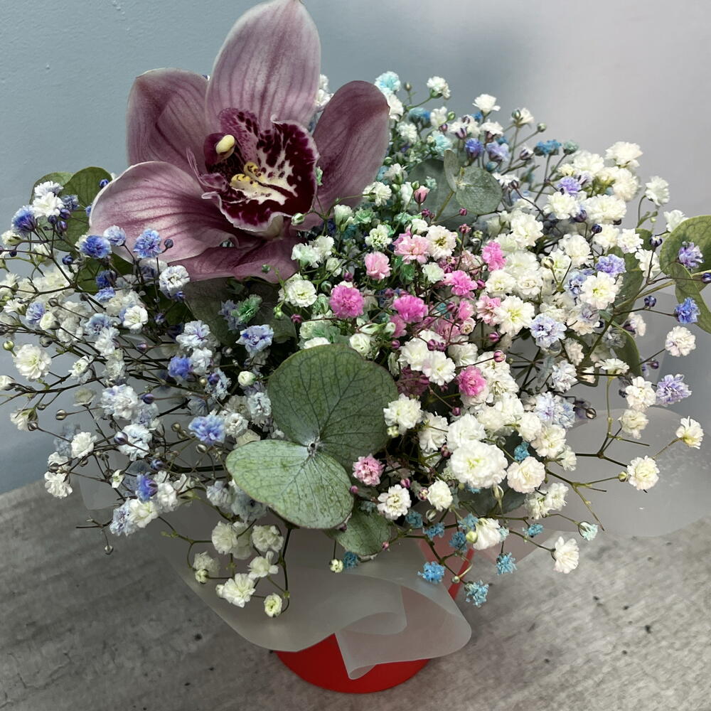 Гипсофила - 2 шт. Орхидея Цимбидиум - 1 шт. Эвкалипт - 2 шт. Стакан - 1 шт. оазис флористический1 - 1 шт.