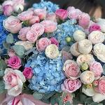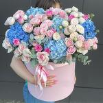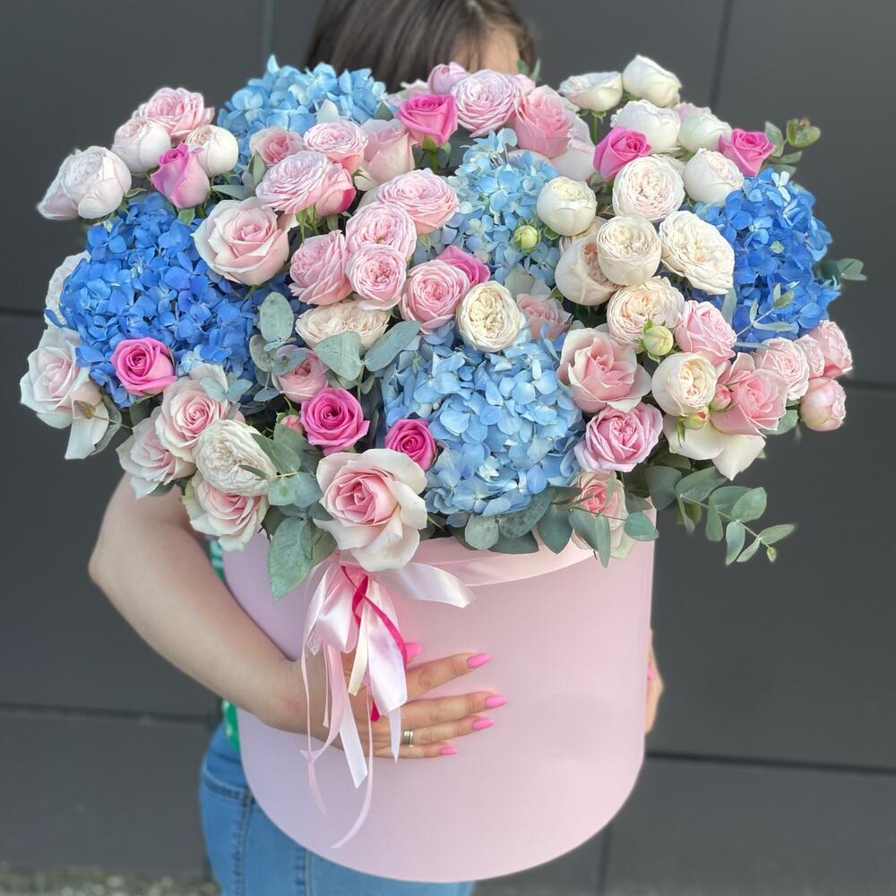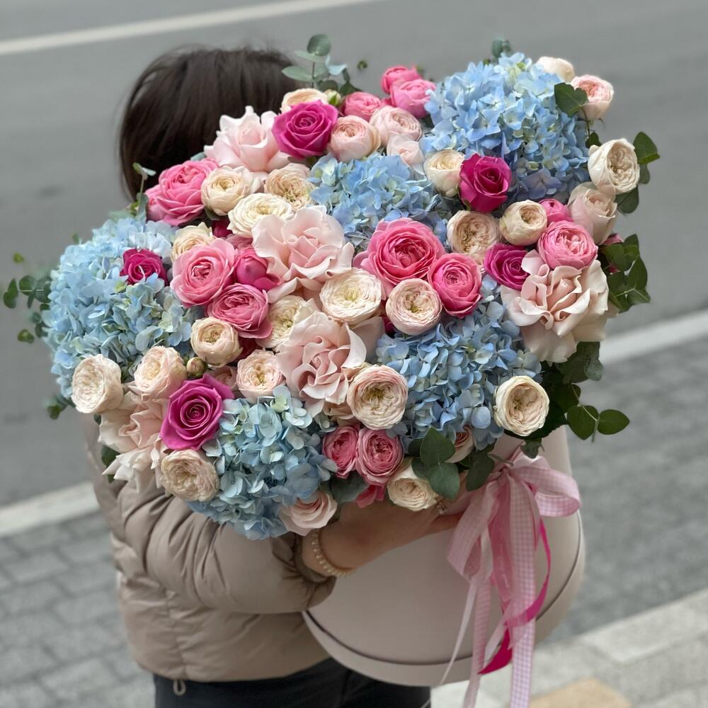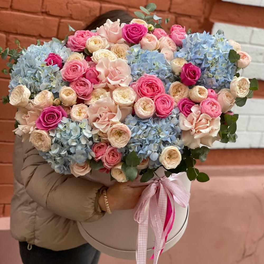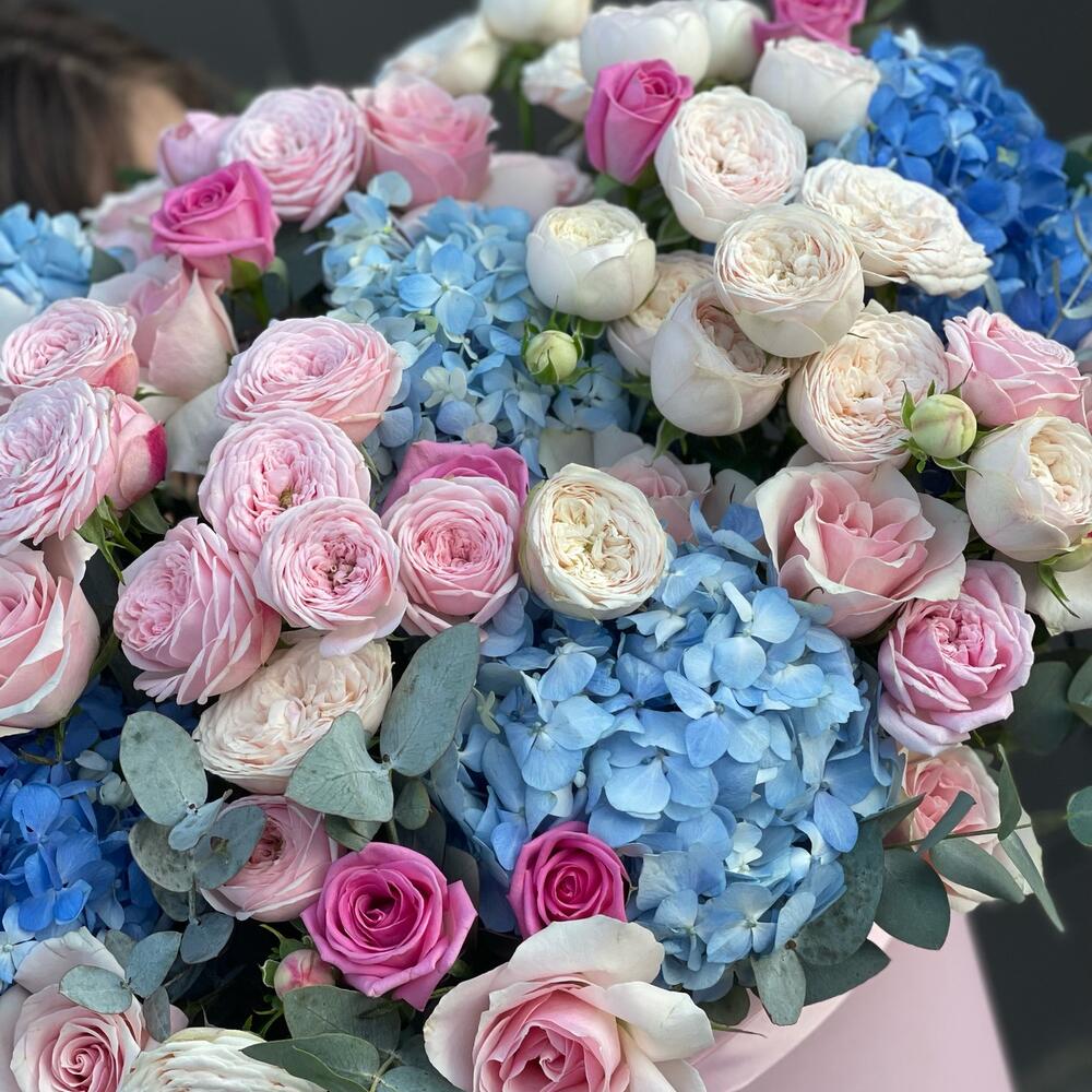 Эвкалипт - 10 шт. Роза одноголовая - 11 шт. Коробка шляпная - 1 шт. Роза пионовидная кустовая - 15 шт. Гортензия голубая - 5 шт. открытка с вашими пожеланиями - 1 шт.