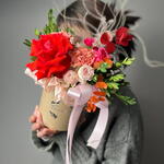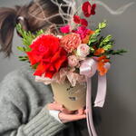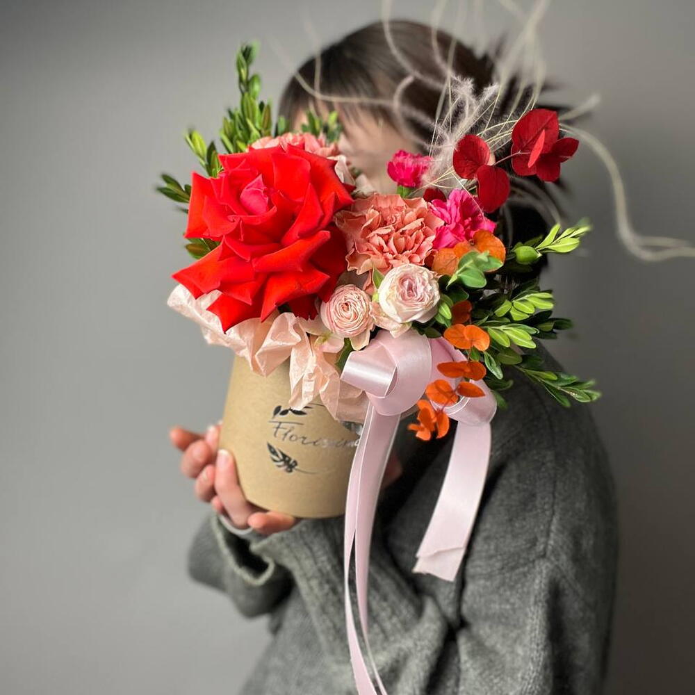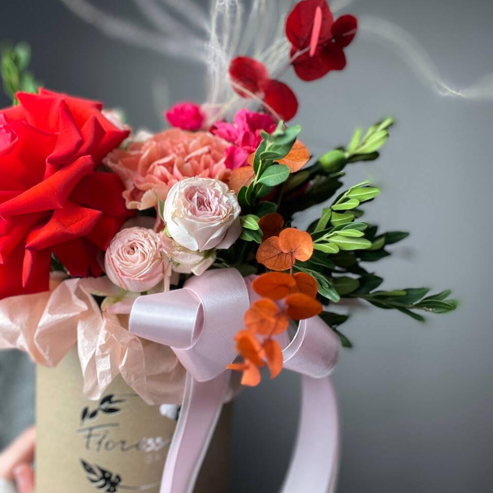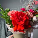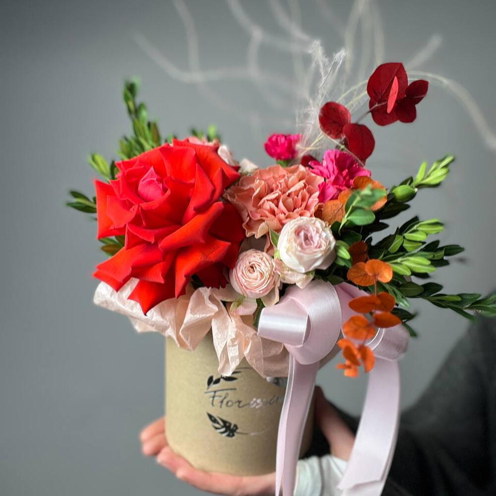 Гвоздика - 3 шт. Самшит - 2 шт. Упаковка дизайнерская - 1 шт. роза nina - 1 шт. Эвкалипт стабилизированный - 1 шт. роза bombastik - 1 шт.