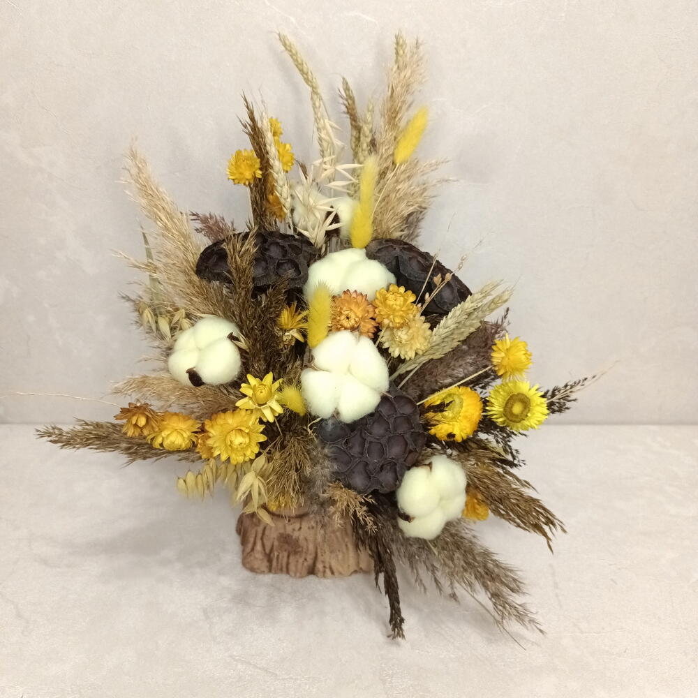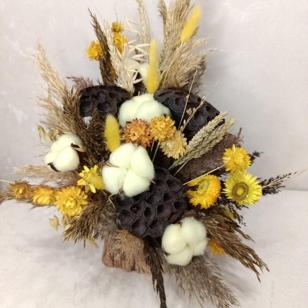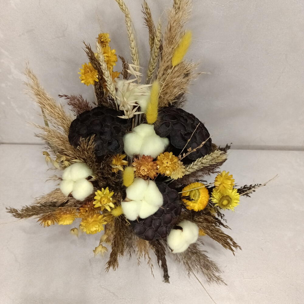 Тепло, которое не вянет. Золотистые оттенки сухоцветов в сочетании с природными фактурами лотоса и дерева. Этот букет не требует воды и особого ухода, но гарантированно добавляет 100% уюта в ваш дом. Маленький кусочек солнца, который будет радовать вас круглый год.