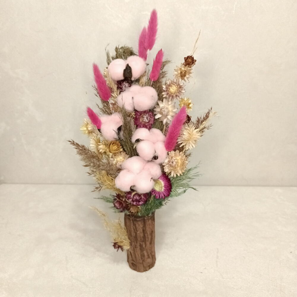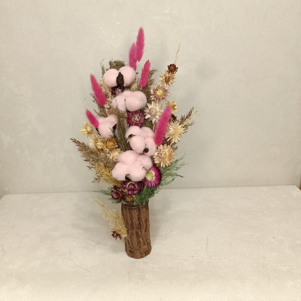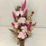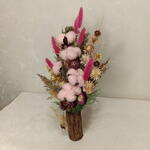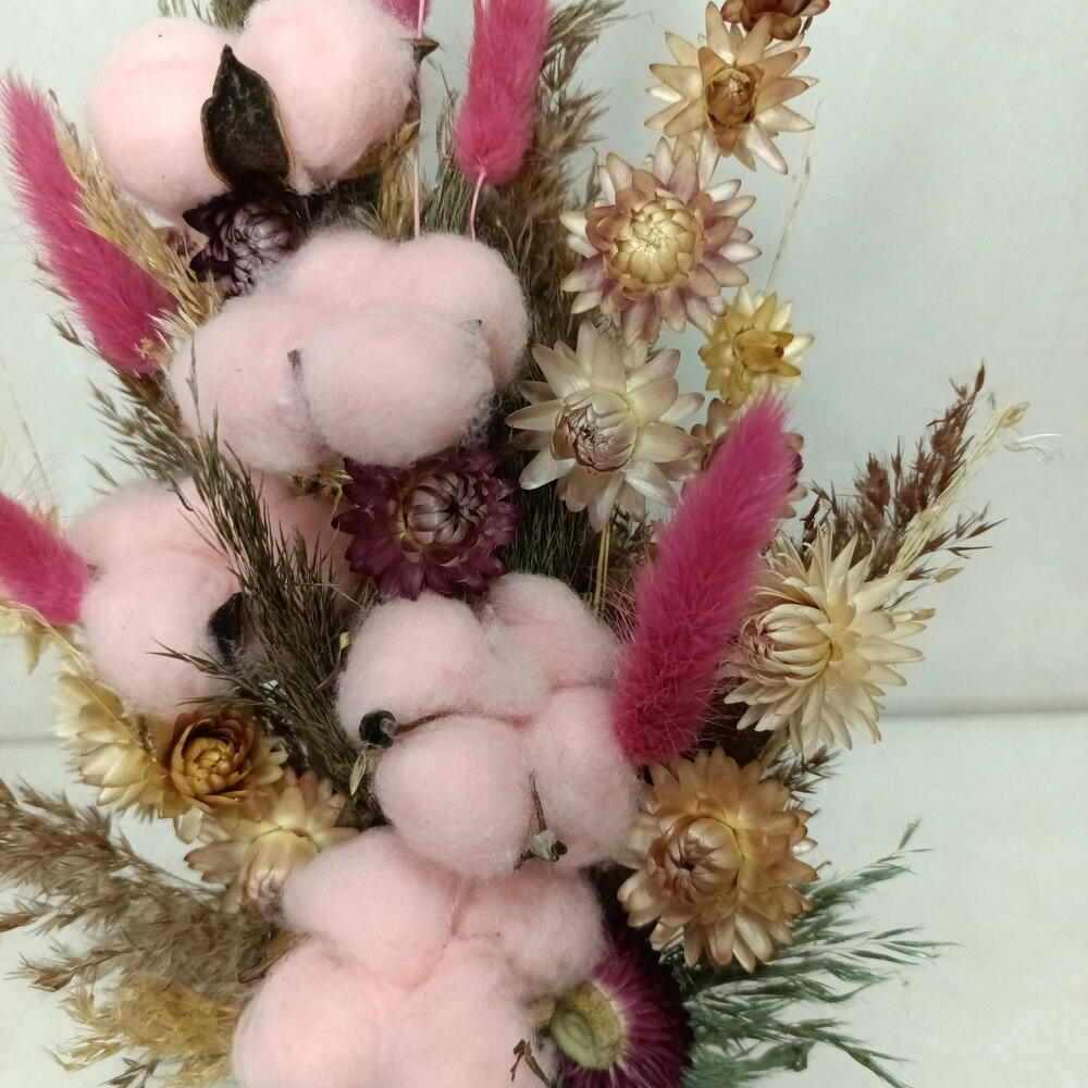 Высокая и динамичная композиция из сухоцветов, напоминающая застывший фейерверк. Яркие акценты малинового лагуруса пронзают облака нежно-розового хлопка, а золотистые цветы гелихризума добавляют солнечного тепла. Благодаря вертикальной форме и глубокому цвету кашпо, этот букет визуально вытягивает пространство и создаст праздничное настроение в любой комнате.
