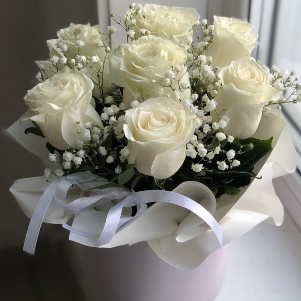 Гипсофила - 1 шт. Писташ - 1 шт. Роза - 7 шт. Коробка - 1 шт.