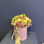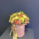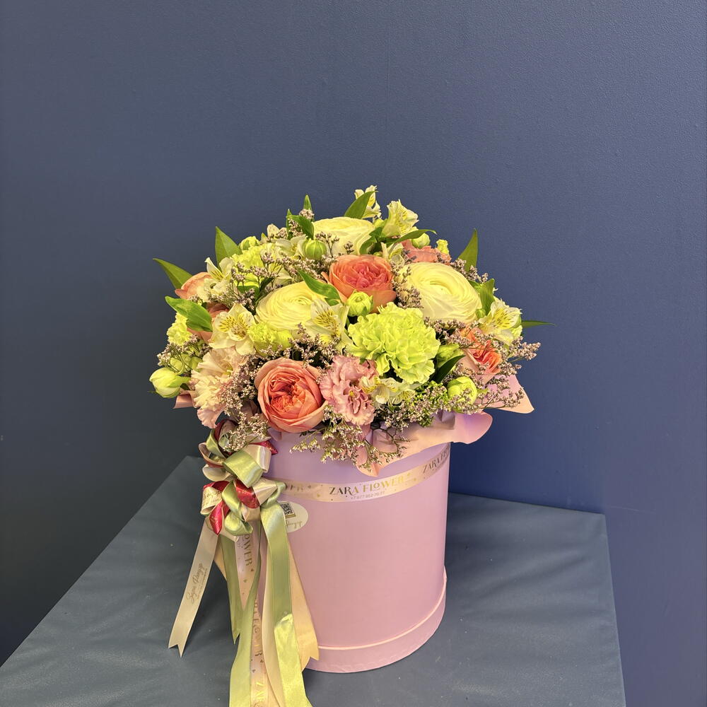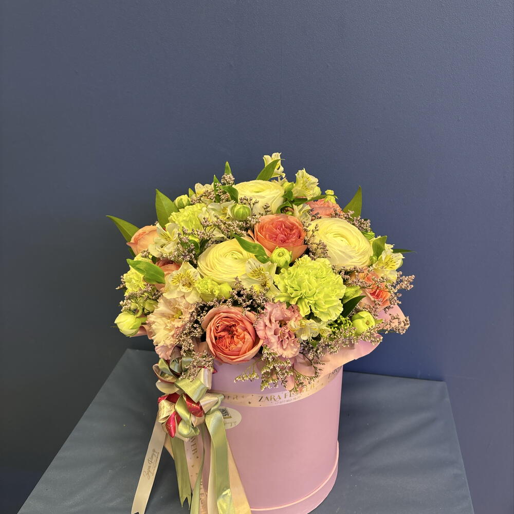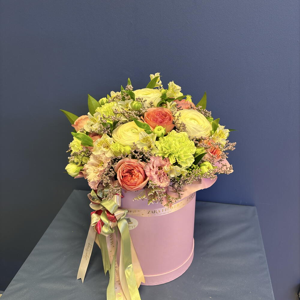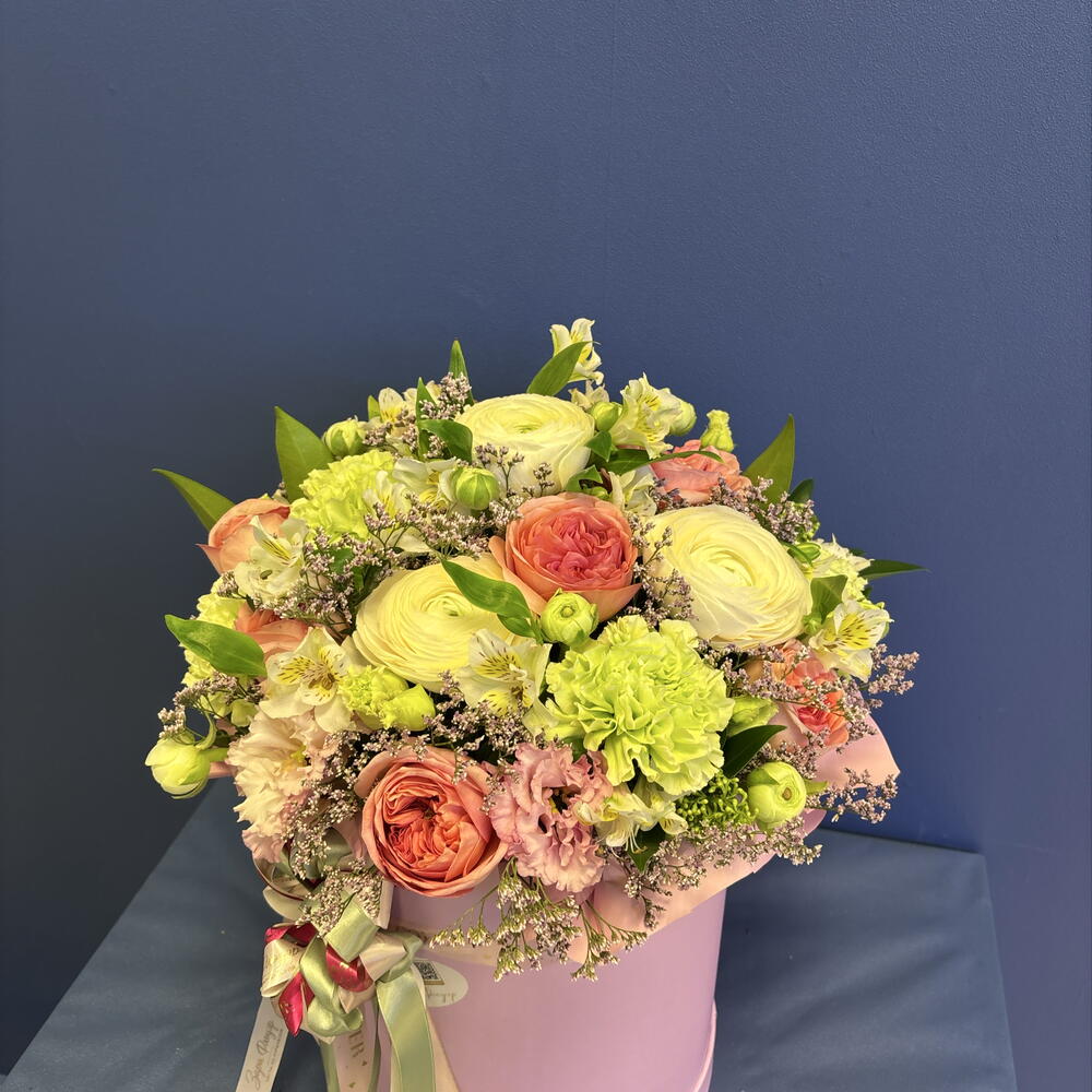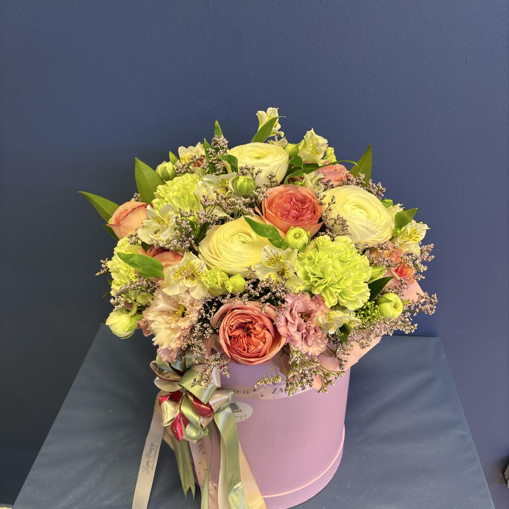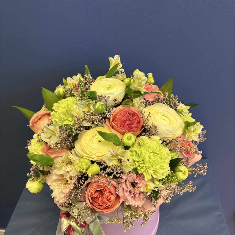 Писташ - 1 шт. Коробка шляпная - 1 шт. Оазис - 1 шт. Гвоздика цветная - 5 шт. Лизиантус алиса - 1 шт. ранункулюс клуни экстра - 3 шт. Лимониум Мэйн Синяя - 1 шт. роза армения 50 см - 8 шт. скиммия вайт глоб - 3 шт. альстромерия армения - 5 шт.