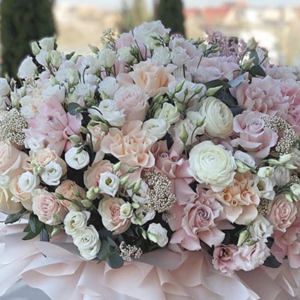 Гортензия - 8 шт. Озотамнус - 10 шт. Эвкалипт - 19 шт. Роза - 25 шт. Кустовая роза - 11 шт. Эустома - 19 шт. Диантус - 10 шт. Ранункулюс - 9 шт.