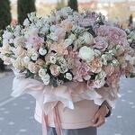 Большая композиция в шляпной коробке. Состав: роза разного сорта, кустовая роза, гортензия, озотамнус, эустома, диантусы, эвкалипт При отсутствии некоторых видов цветов или элементов декора, компания оставляет за собой право осуществить эквивалентную замену. К каждому заказу прилагается инструкция по уходу за цветами.