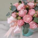 Роза кустовая - 4 шт. Эвкалипт - 1 шт. Лента атласная - 1 шт. Шляпная коробка - 1 шт. Оазис флористический - 2 шт.