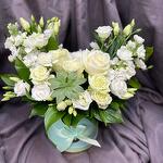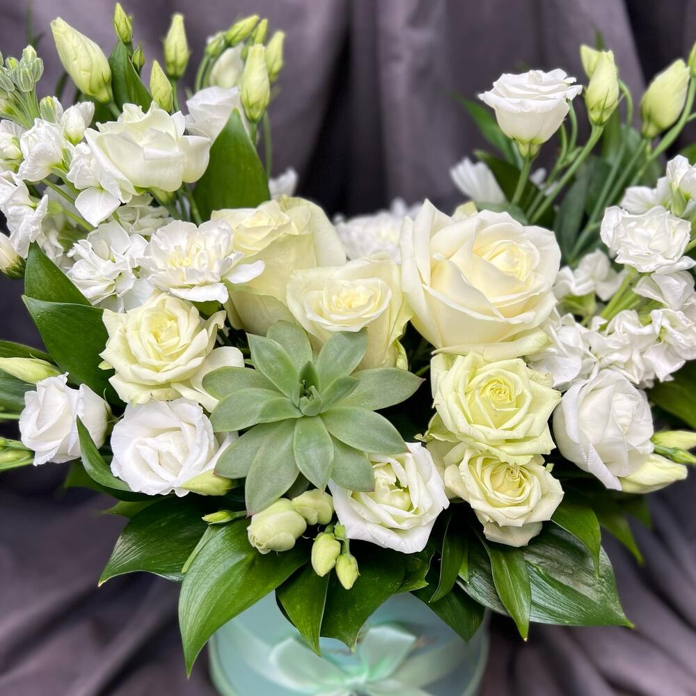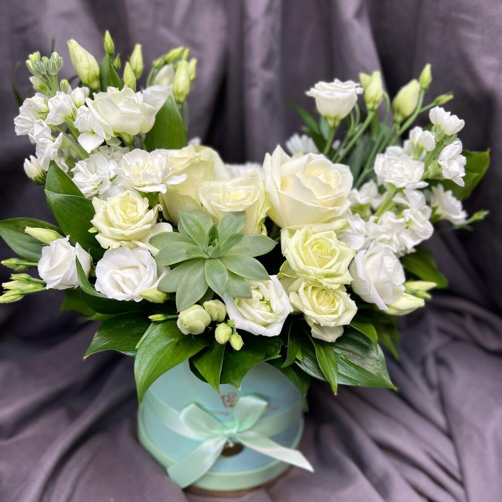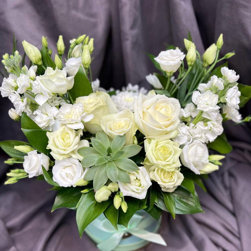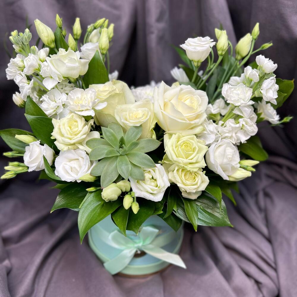 Коробка шляпная - 1 шт. Роза кустовая белая - 1 шт. Маттиола Белая - 2 шт. Суккулент эхеверия - 1 шт. рускус банч - 10 шт. лизиантус белая - 2 шт. 4 микс белая - 3 шт.