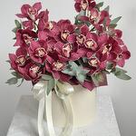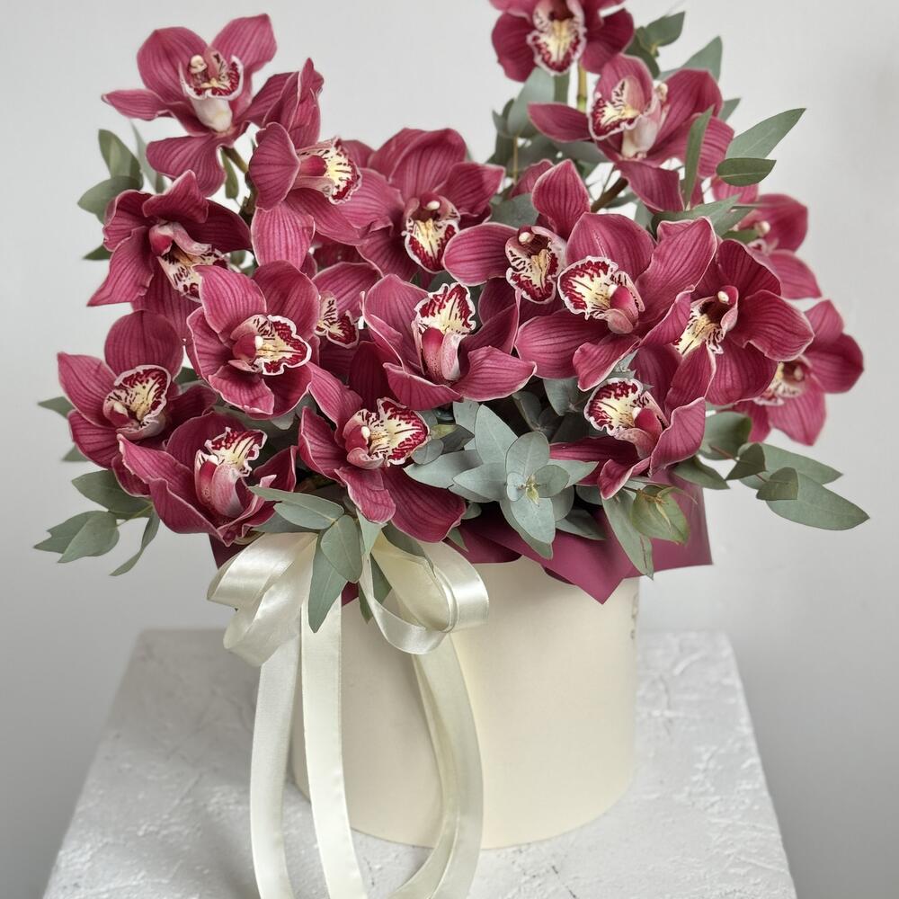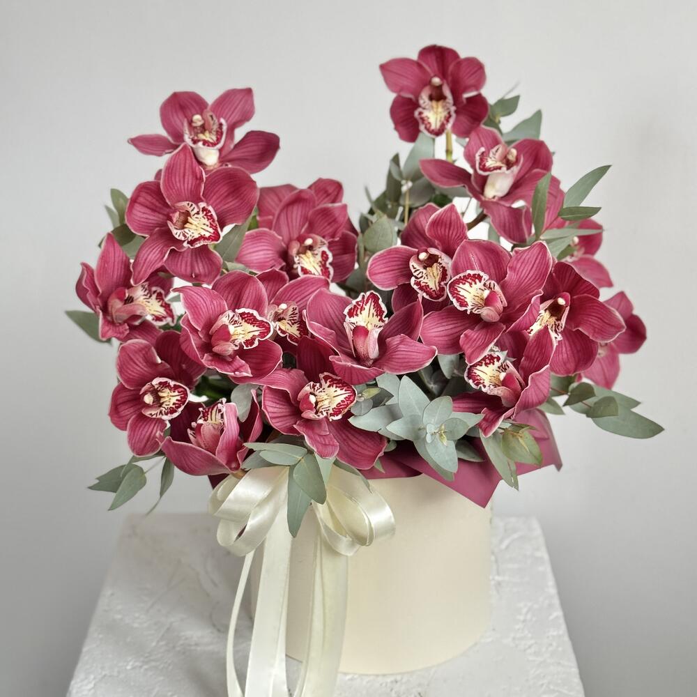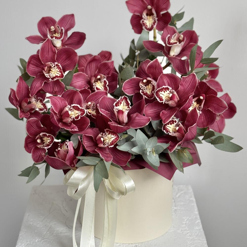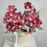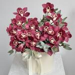 Композиция создана из бордовых орхидей цимбидиум, которые придают композиции особое очарование и романтическое настроение. Этот букет станет отличным подарком для вашей возлюбленной, выражая ваши чувства и заботу.