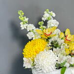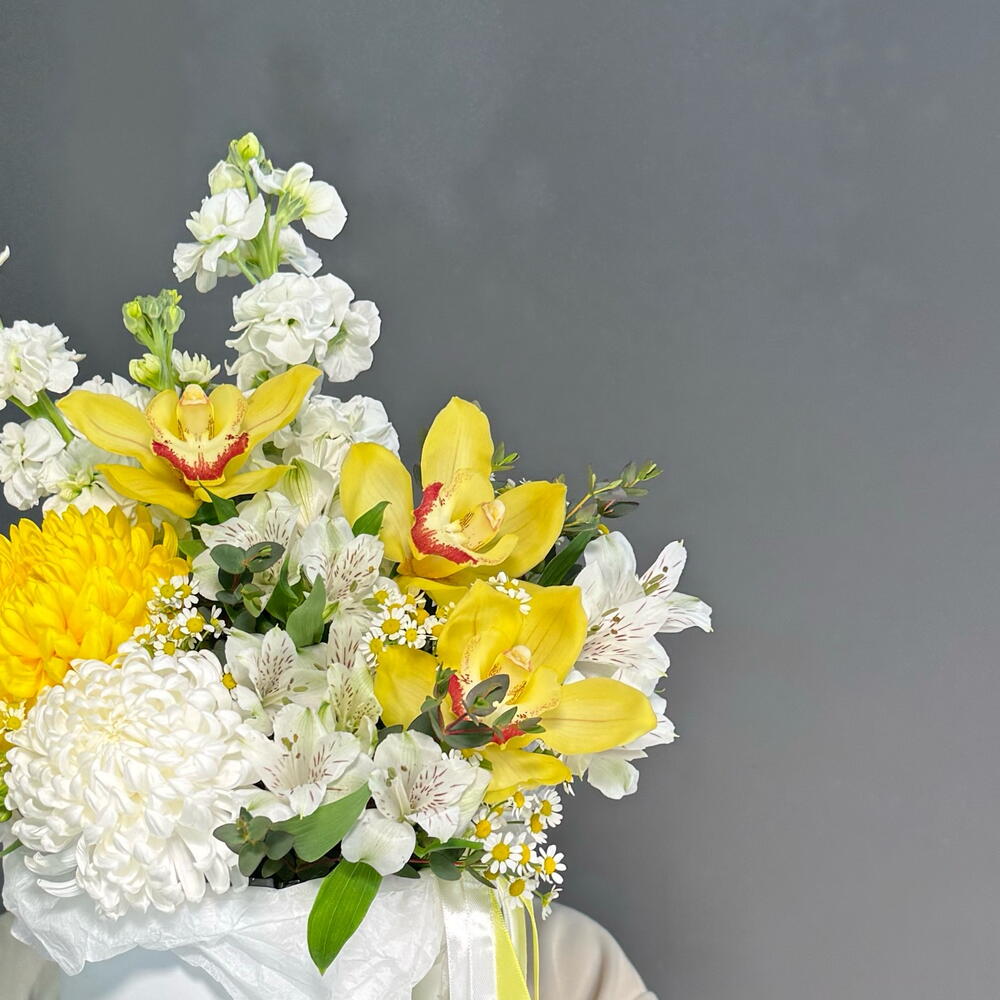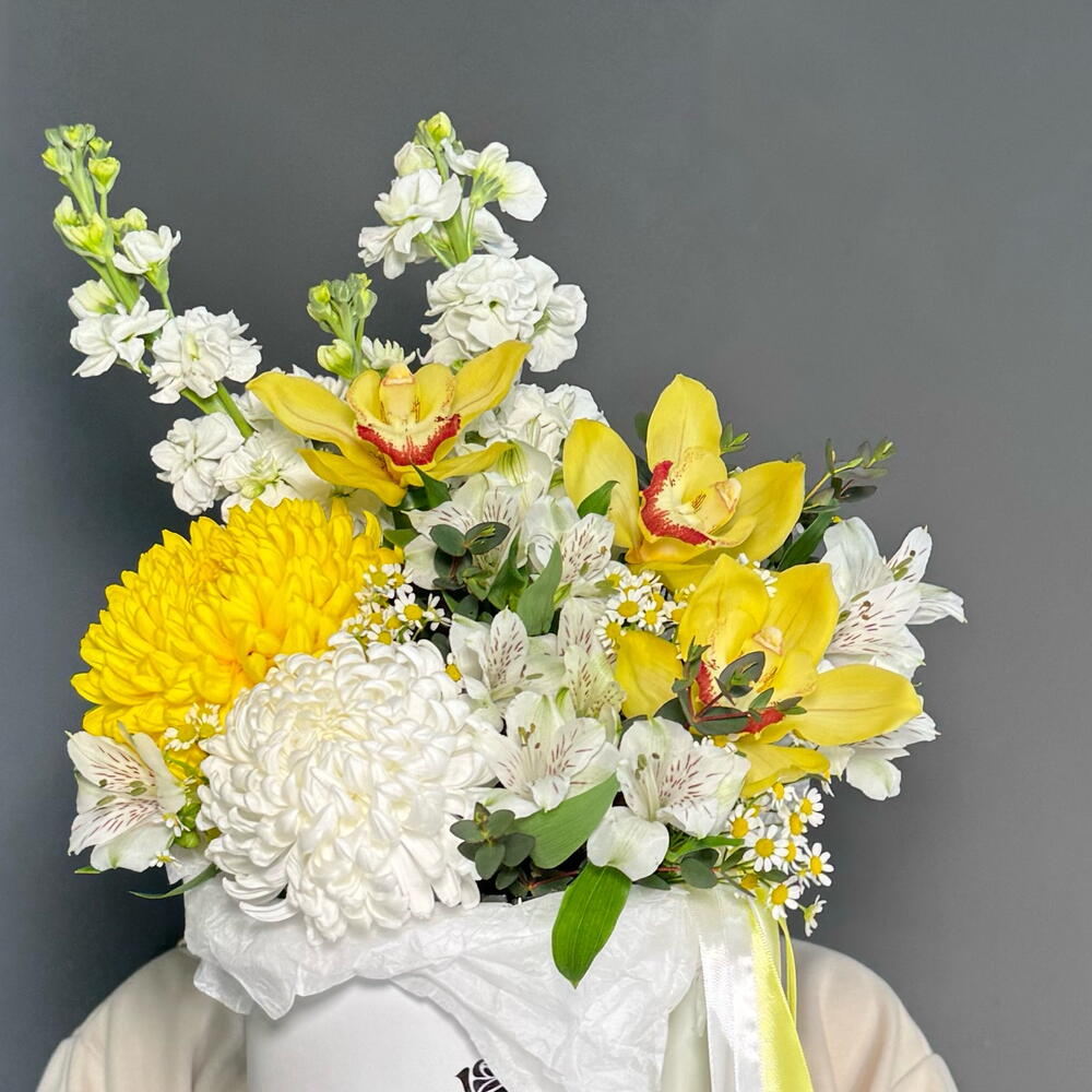 Коробка из орхидеи, матиоллы, хризантем, альстромерии