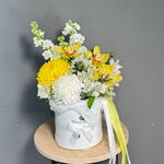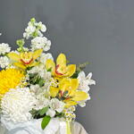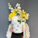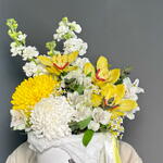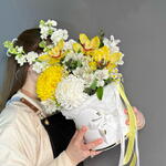 Маттиола - 2 шт. Танацетум - 2 шт. Эвкалипт - 1 шт. Коробка шляпная - 1 шт. Хризантема одноголовая - 2 шт. Оазис флористический - 1 шт. Орхидеи - 3 шт.