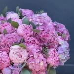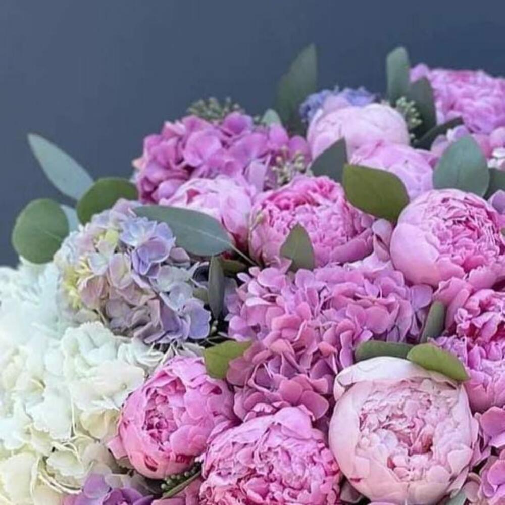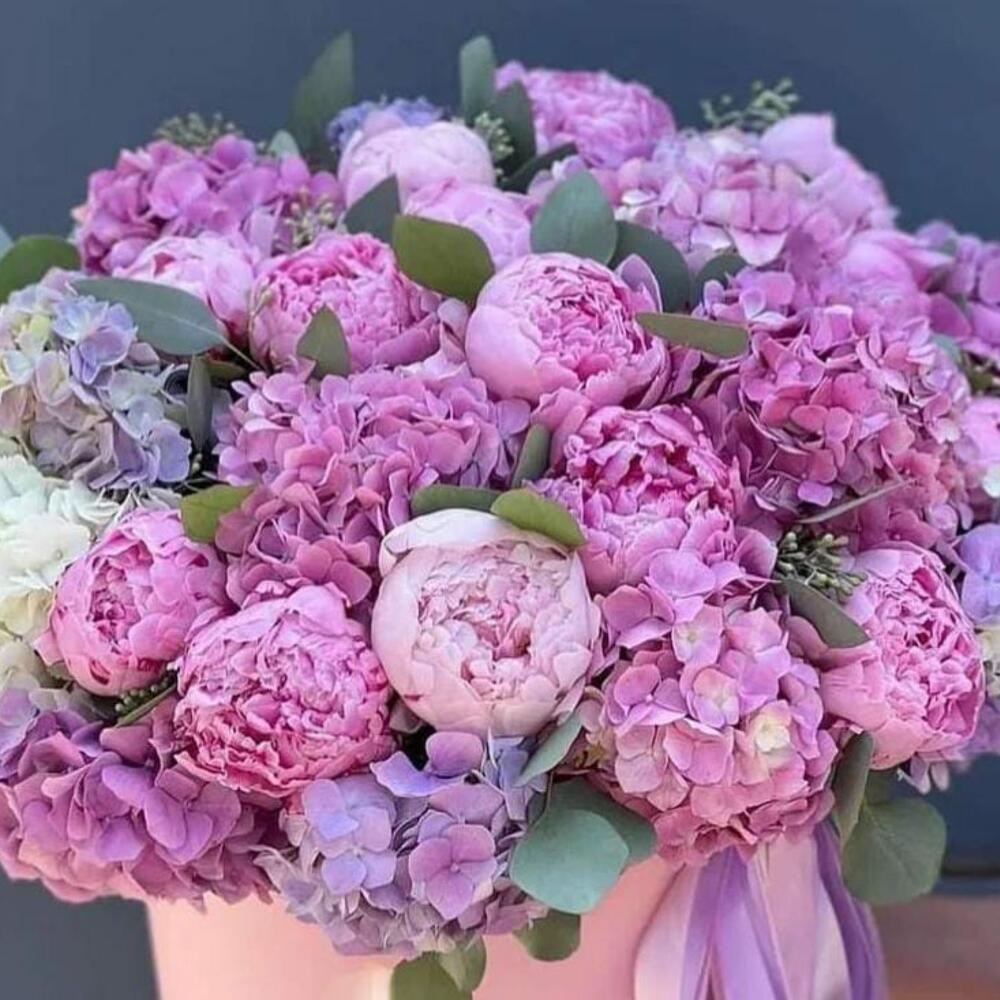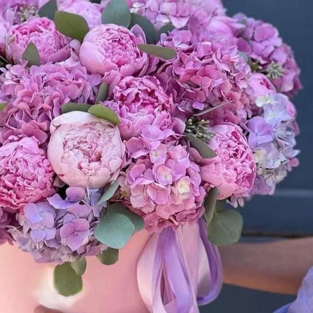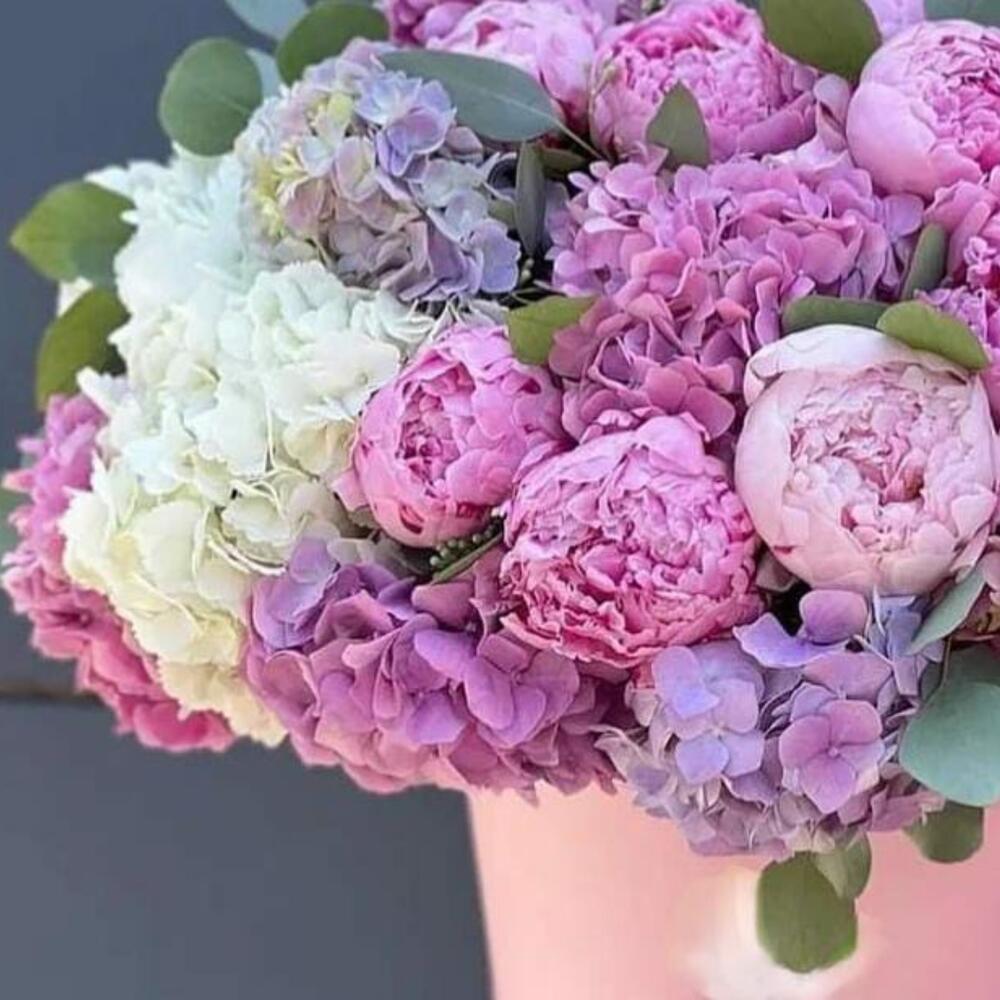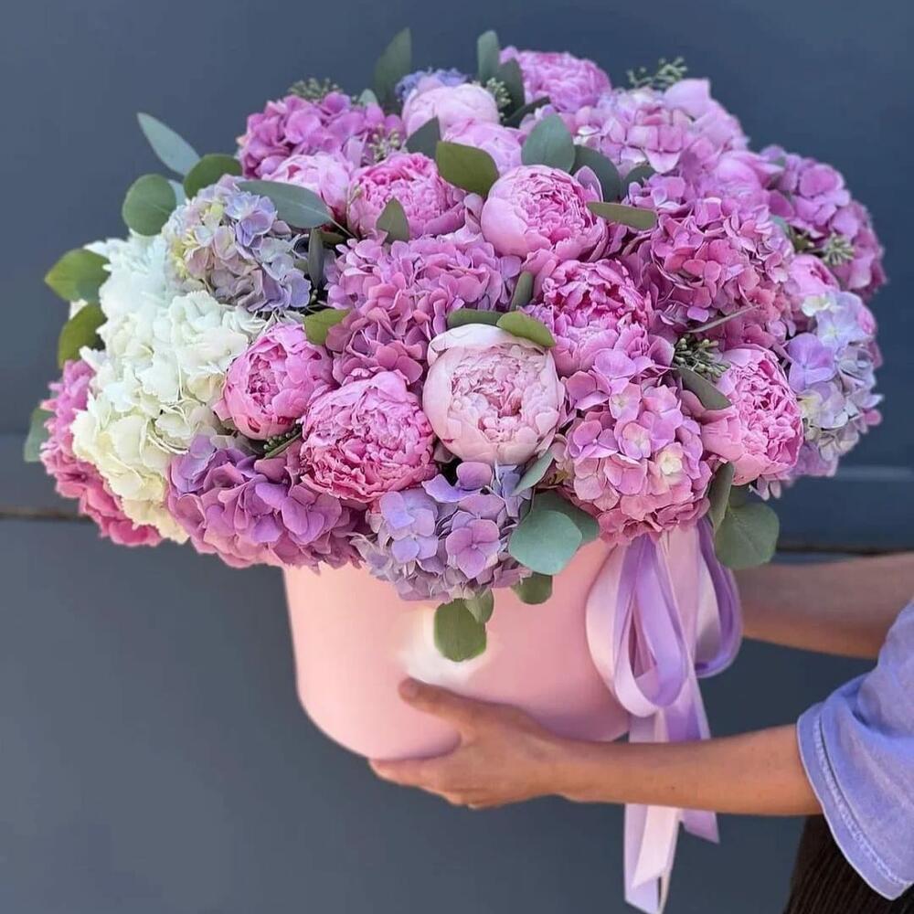 Коробка с пионами и гортензиями