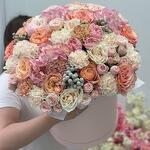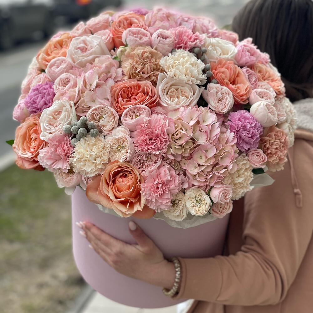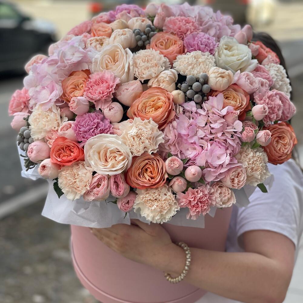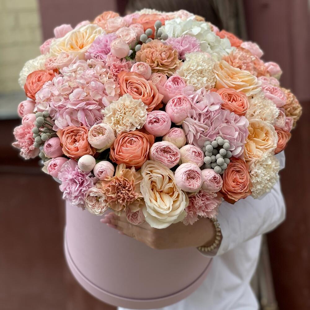Бруния - 3 шт. Гортензия - 3 шт. Диантус - 15 шт. Коробка шляпная - 1 шт. Роза пионовидная - 11 шт. Роза кустовая пионовидная Мадам Бомбастик - 9 шт. Губка флористическая - 2 шт. роза кустовая пионовидная менсфилд парк - 6 шт.