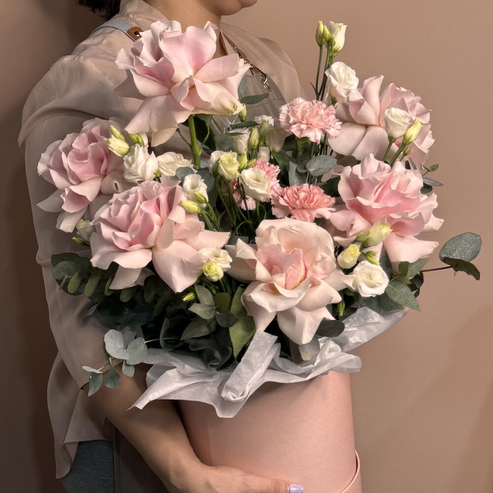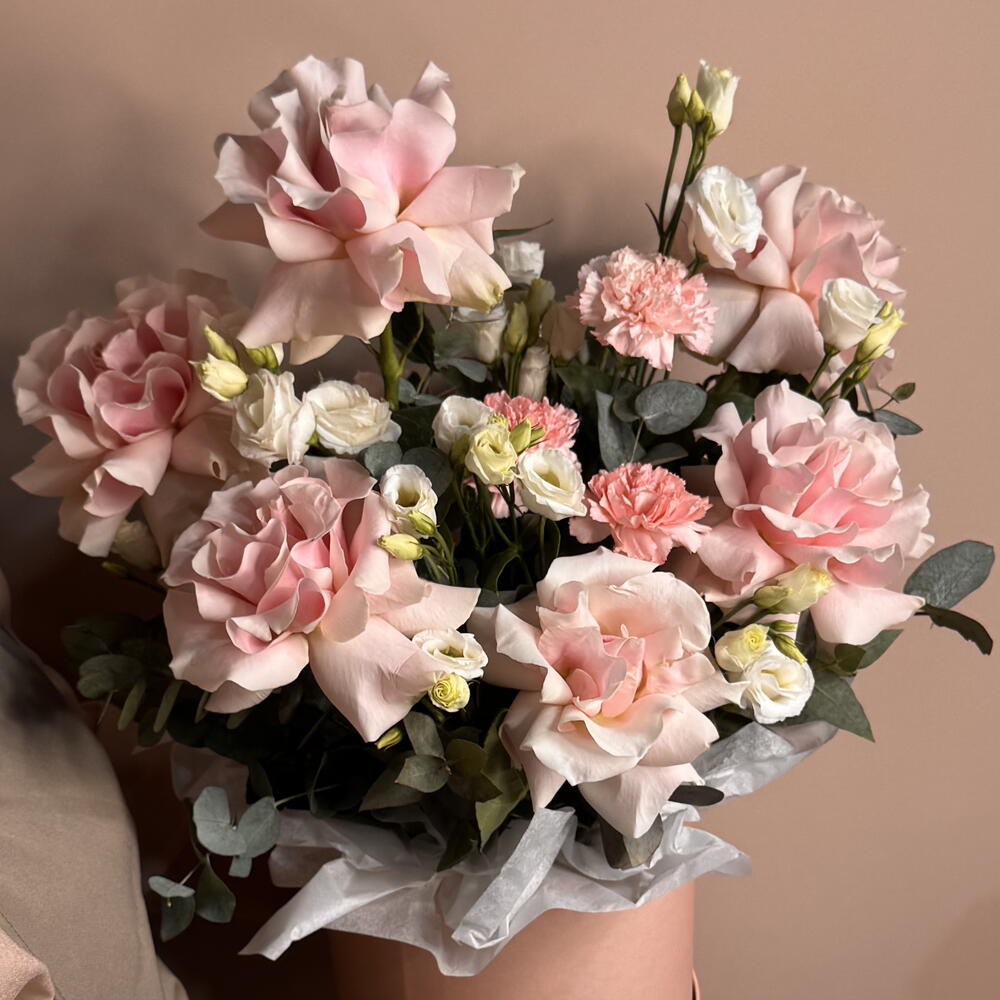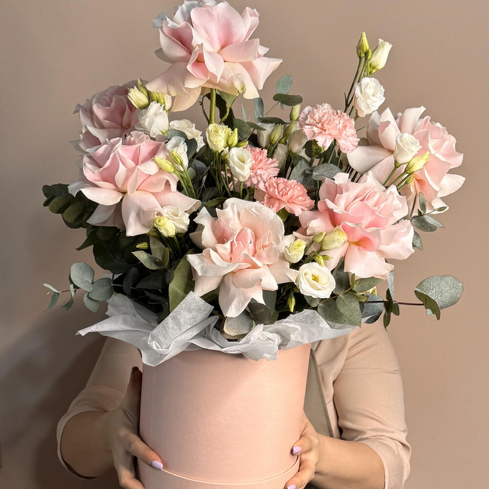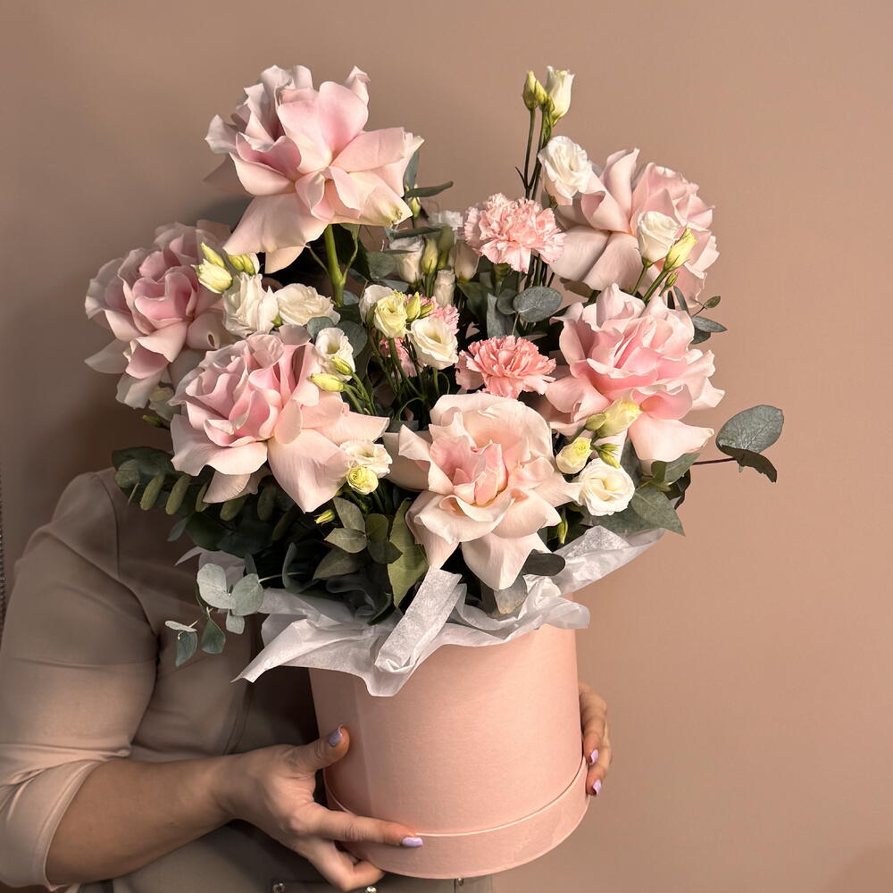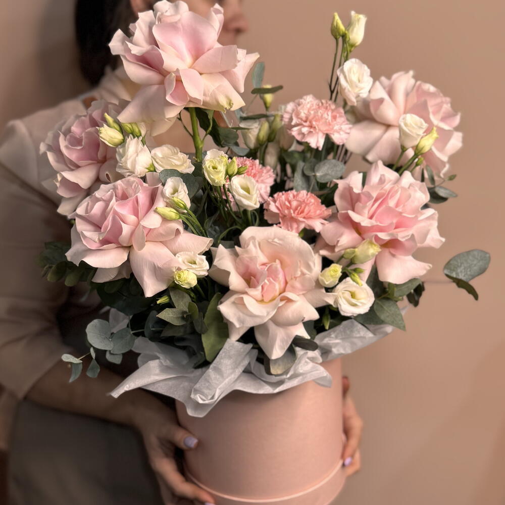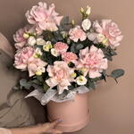 Гвоздика - 3 шт. Эустома - 3 шт. Коробка шляпная - 1 шт. Роза французская - 7 шт. Оазис флористический - 1 шт. Эвкалипт Цинерея - 5 шт.