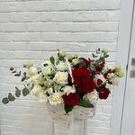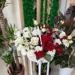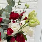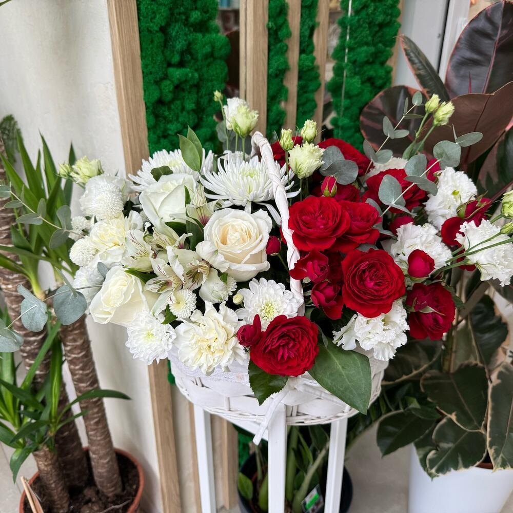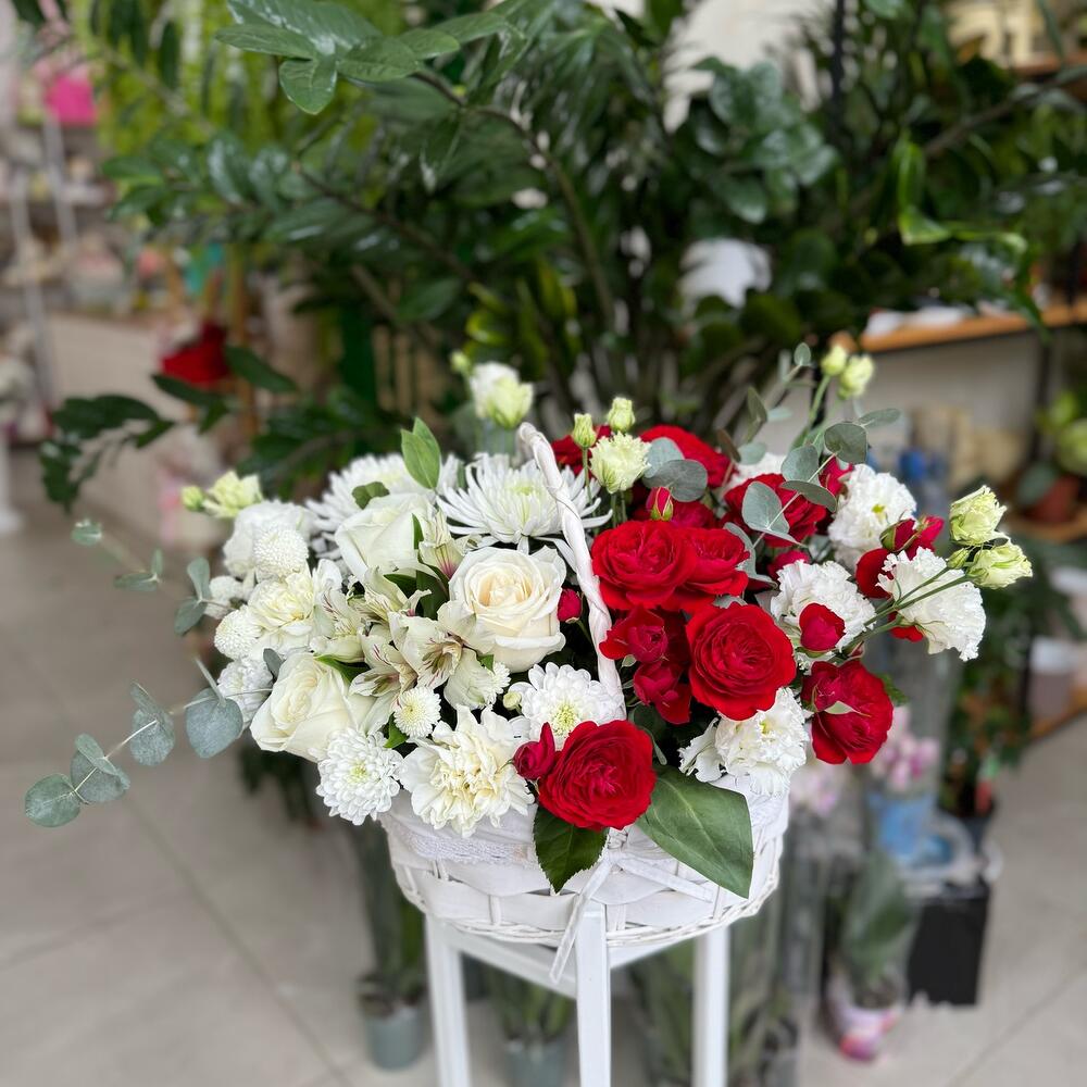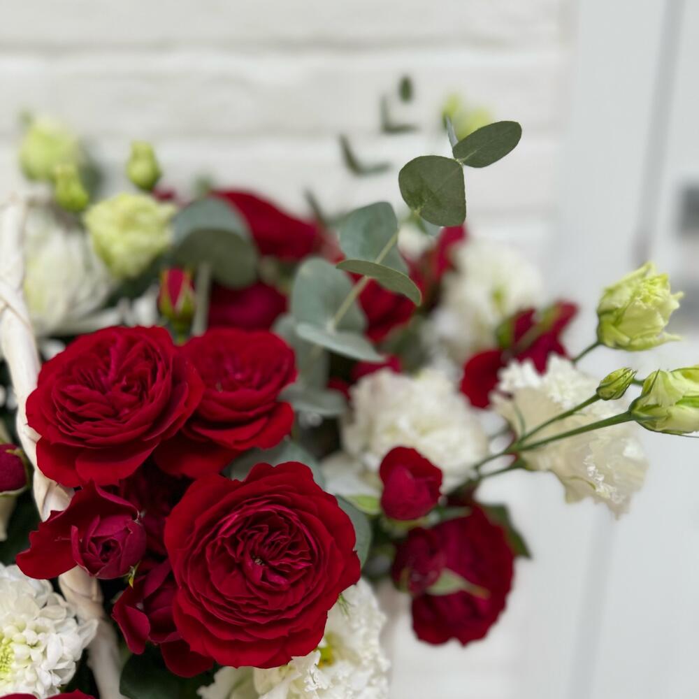Шикарная корзина в бело-красном цвете💔,с пионовидными красными кустовыми розами, с первого взгляда завораживает своей красотой и сочетанием оригинальных цветов.