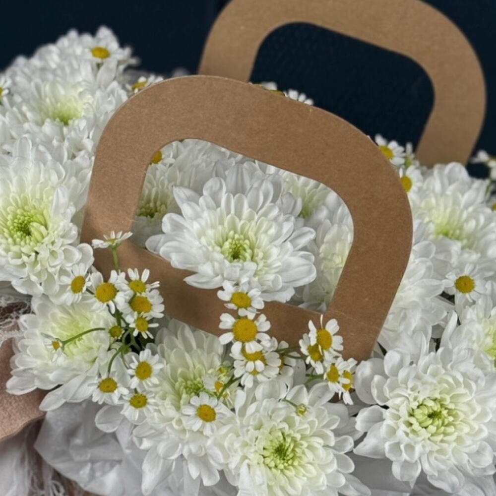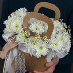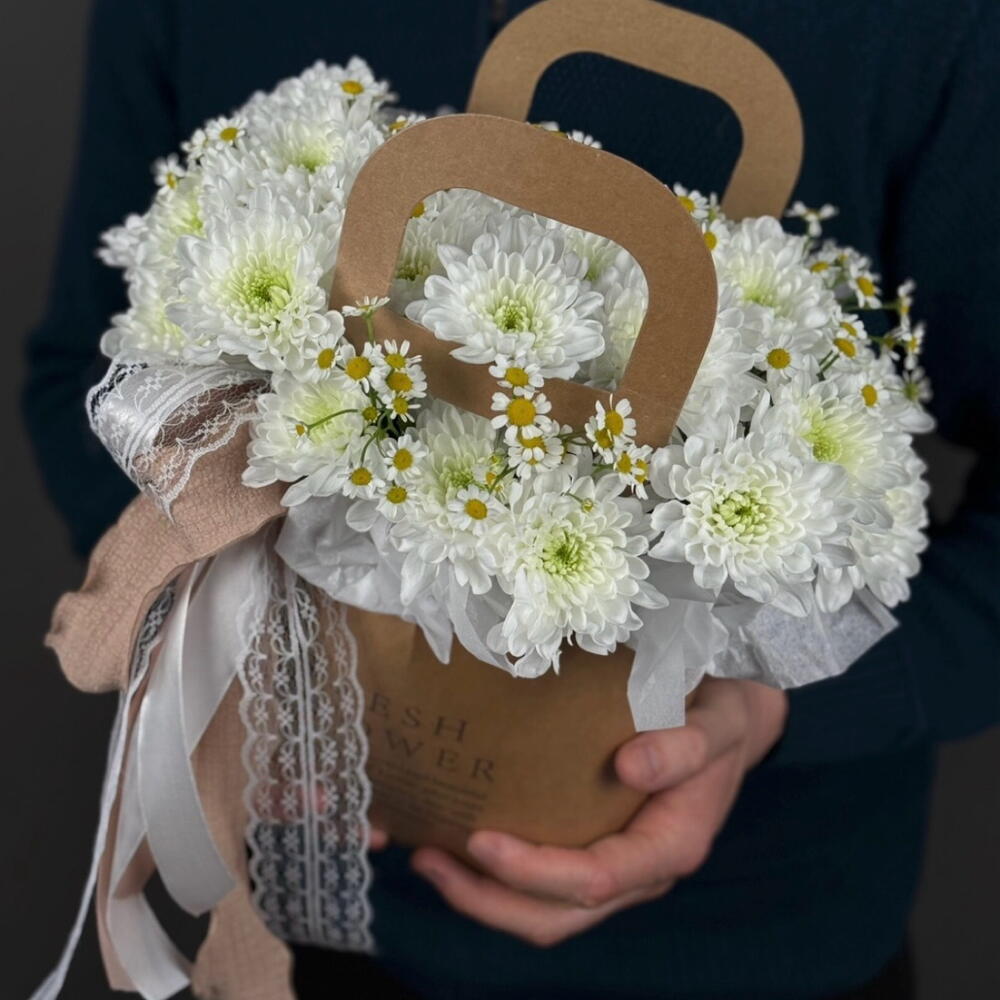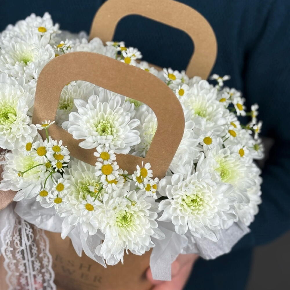 Камилла - 2 шт. сумочка крафтовая - 1 шт. хризантема алтай - 5 шт. ленты атласные - 3 шт. губки флористическая с водой - 1 шт.