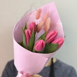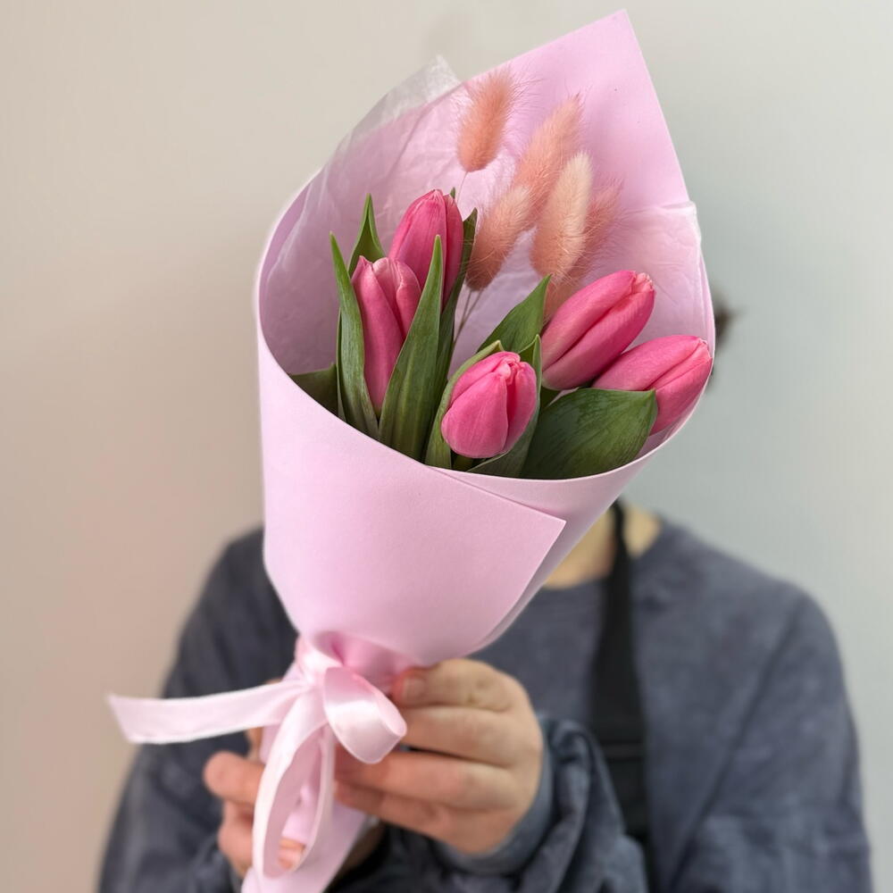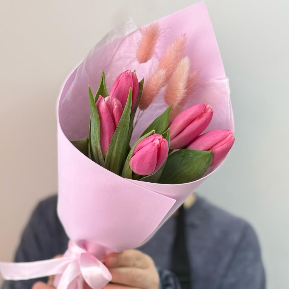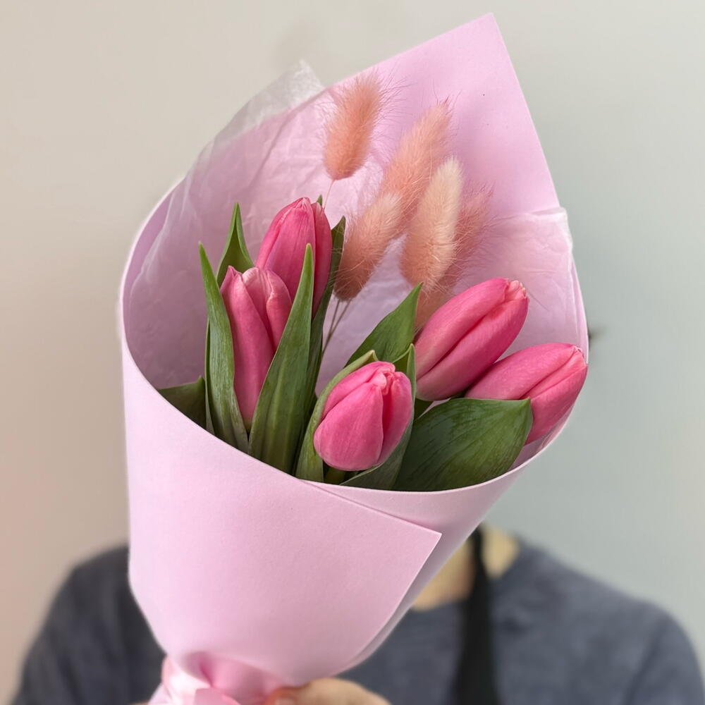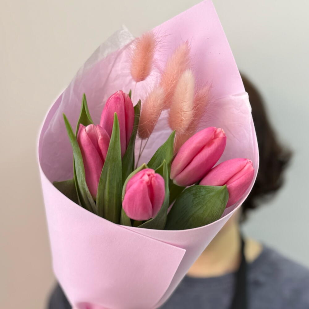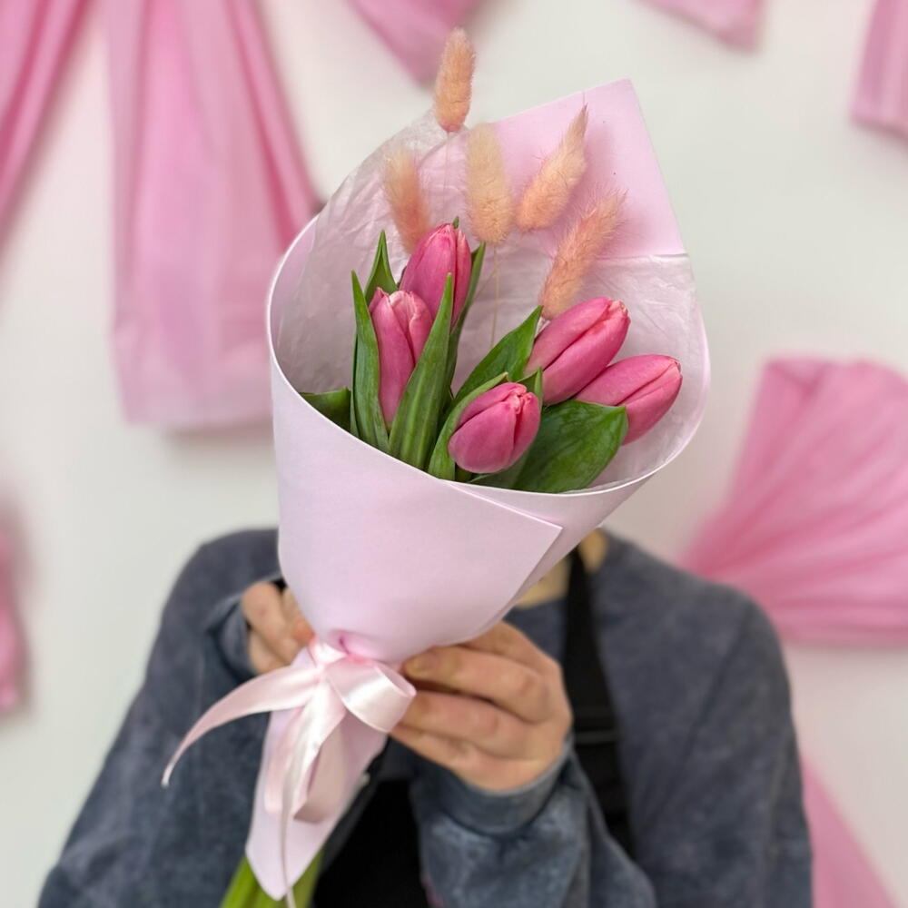 Тюльпан - 5 шт. Лента атласная - 1 шт. Тишью - 1 шт. Лагурус - 5 шт. Фоамиран (упаковка) - 1 шт.