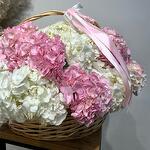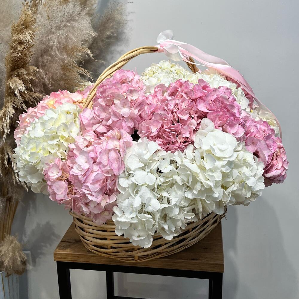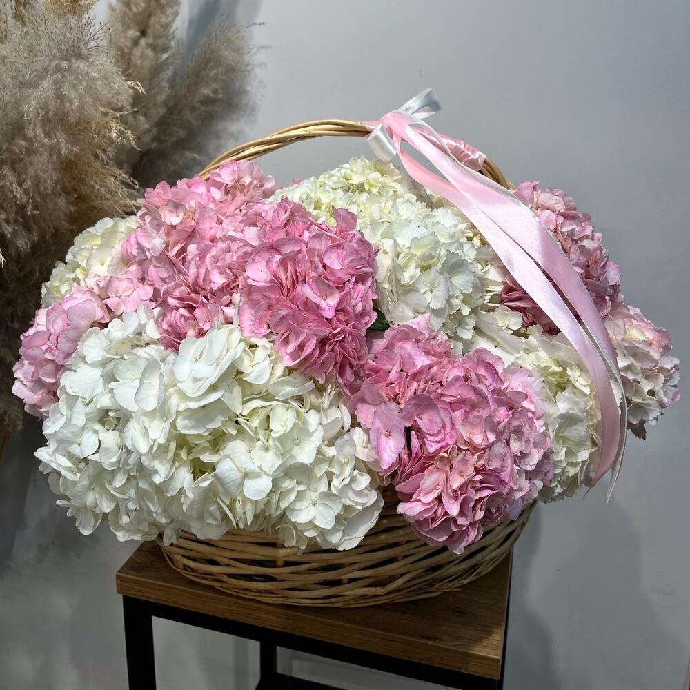 Корзина 15 розово-белых гортензий