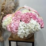 Гортензия - 15 шт. Лента атласная - 2 шт. Губка флористическая - 3 шт. корзина плетеная (ива) 43х36хh1540 см натуральный - 1 шт.