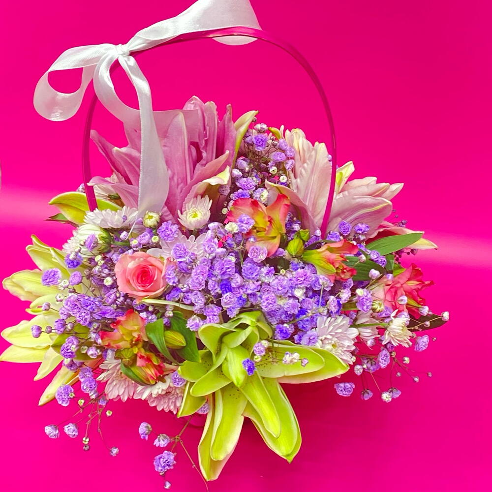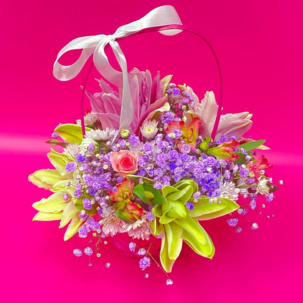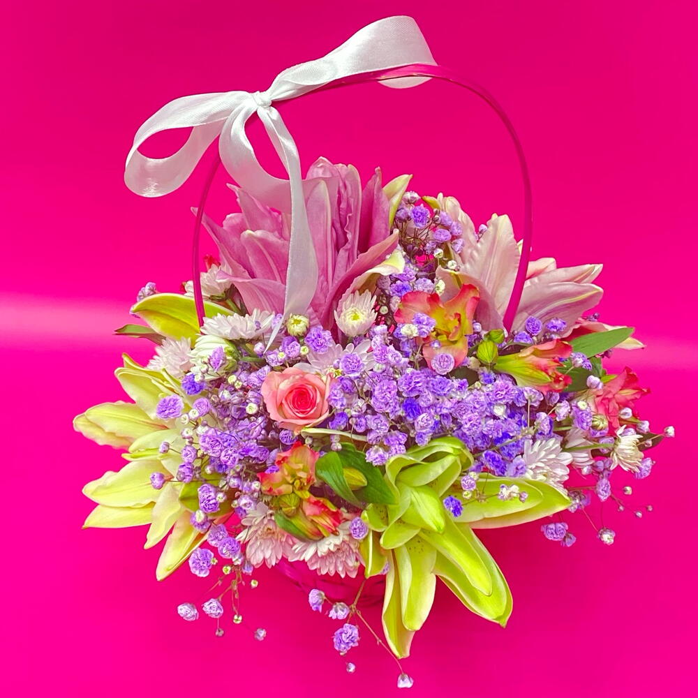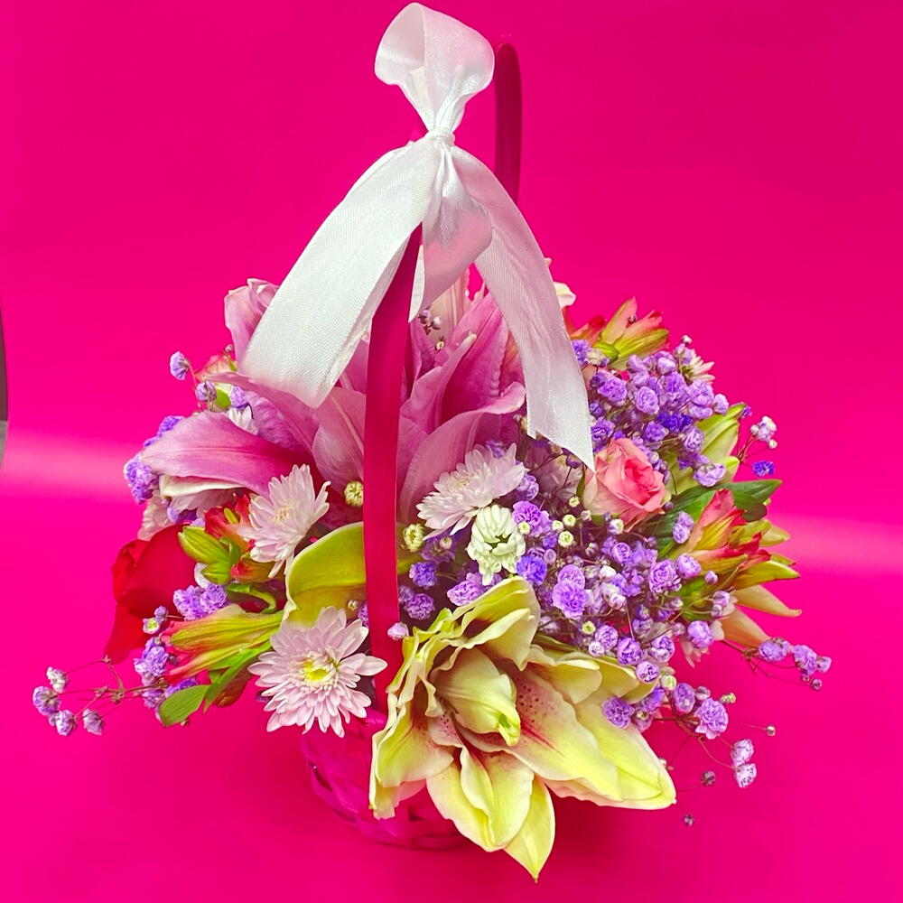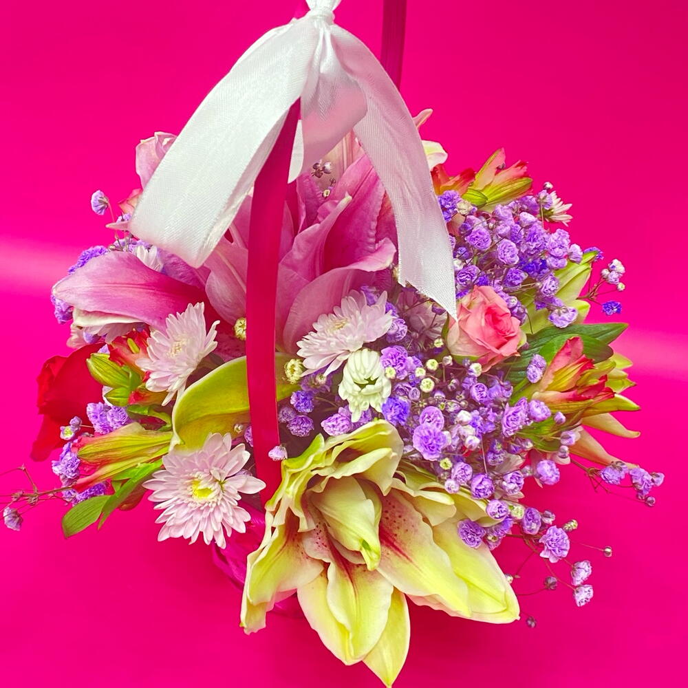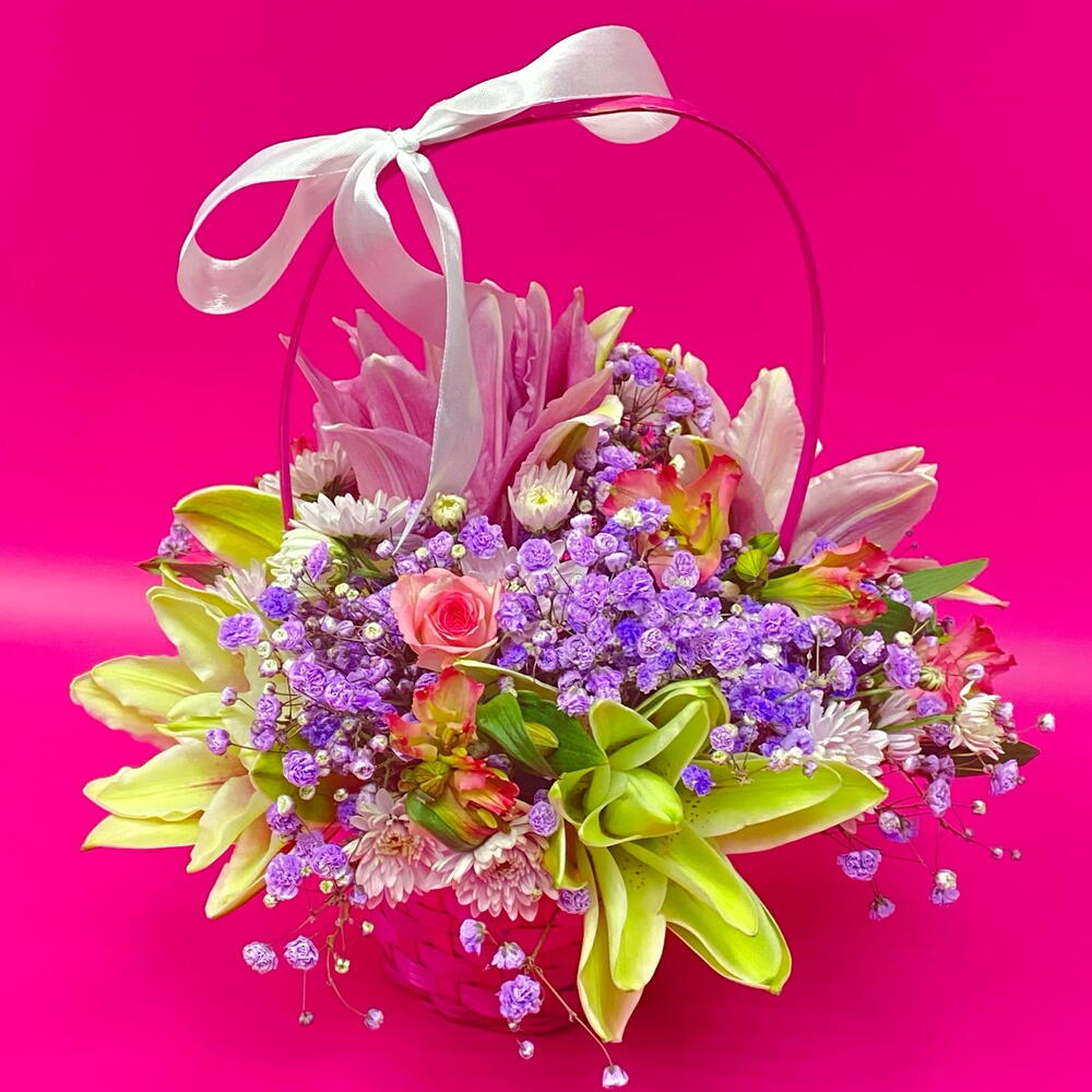 Альстромерия - 3 шт. Гипсофила - 2 шт. Лилия - 1 шт. Роза кустовая - 1 шт. Хризантема кустовая - 1 шт. Корзина плетеная - 1 шт.