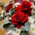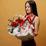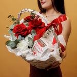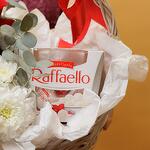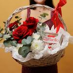 Корзина - 1 шт. Хризантема кустовая - 2 шт. Эвкалипт - 1 шт. Раффаэлло - 1 шт. Лента атласная - 2 шт. Тишью - 1 шт. Пленка - 1 шт. Оазис - 1 шт. Роза французская - 3 шт.