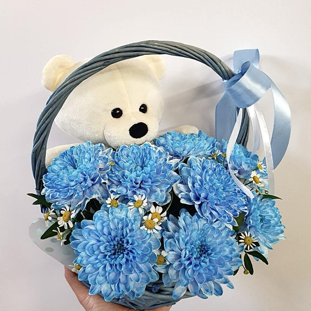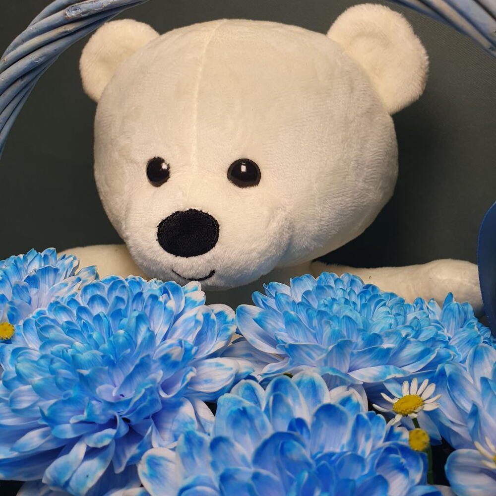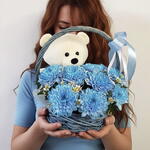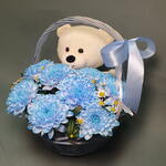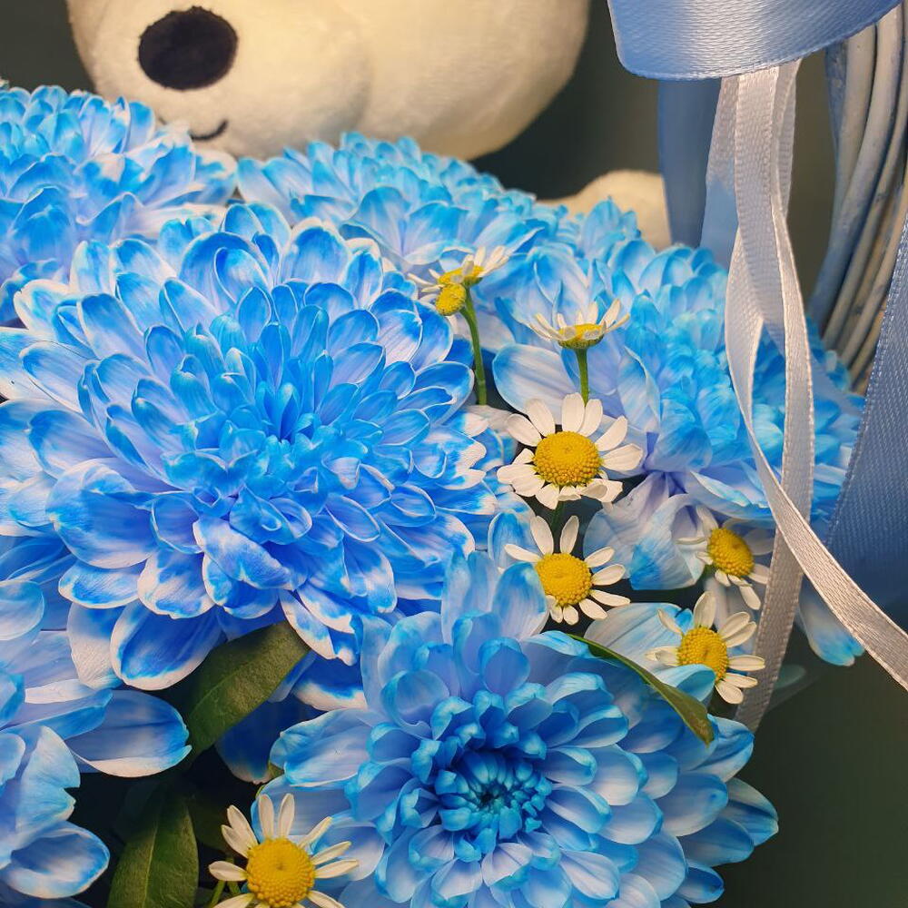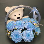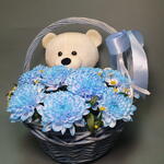 Хризантема в корзинке с медвежонком, дополнительно наполненная мелкой ромашкой (матрикария) и фисташкой на флористической губке пропитанной водой, очень удобный вариант для подарка, так как не требует вазы с водой, можно подарить и не переживать за цветы. Оформляйте заказы заранее, что бы быть уверенными, что ваш заказ приедет вовремя и привезут самые лучшие и свежие цветы! Медведь выполнен из качественных материалов Белорусского завода мягких игрушек, безопасных для детей, которого можно использовать отдельно от композиции. Сама корзина и медведь не имеют сроков годности. Уход за корзинкой: - если дома достаточно сухой воздух, доливать водичку в флористическую губку каждый день по немножку, по всему периметру губки. Радуйте своих любимых необычными композициями. С уважением, Цветов Букеты.